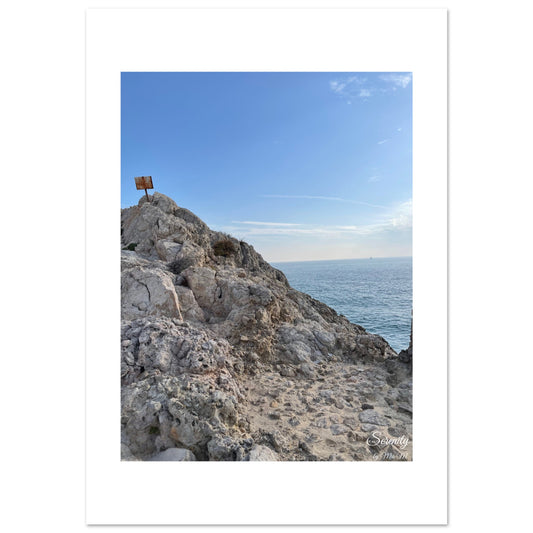 Serene Rocky Shoreline with Azure Sea & Sky Poster