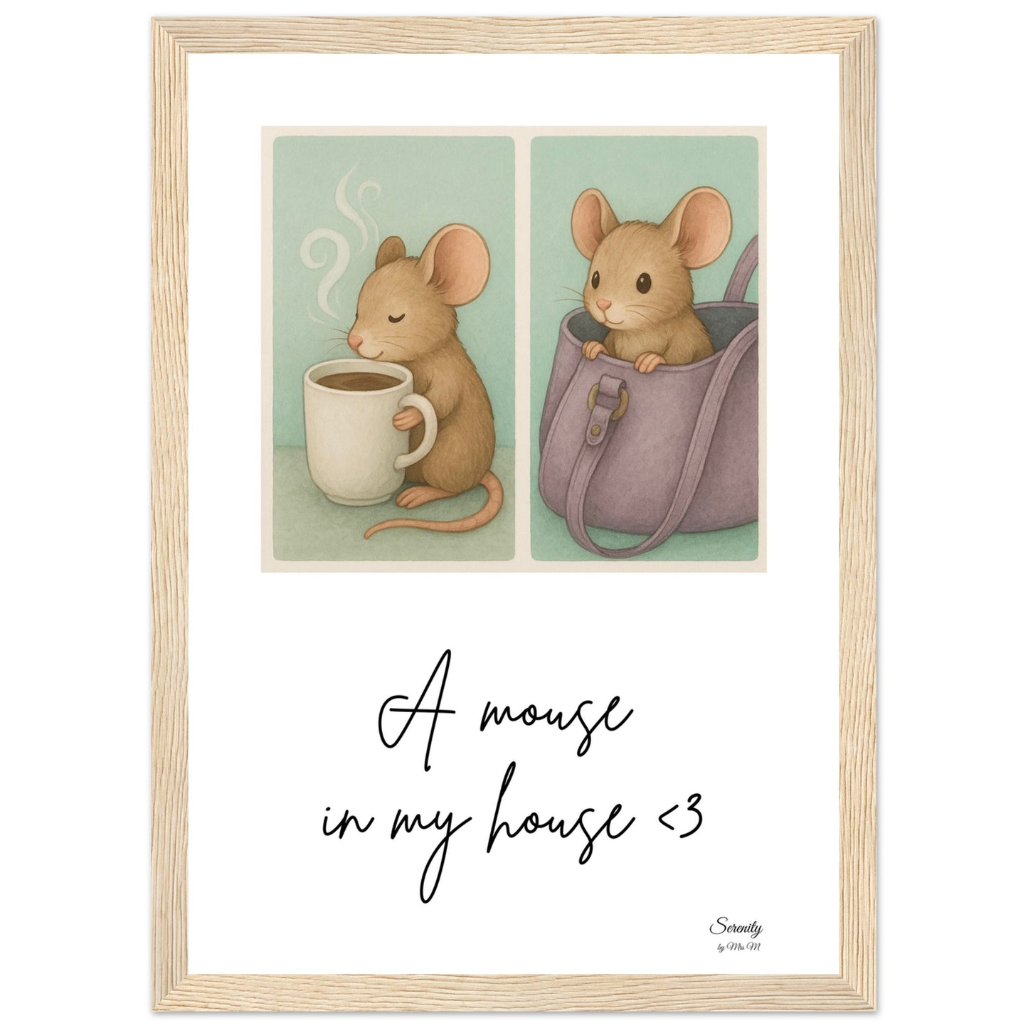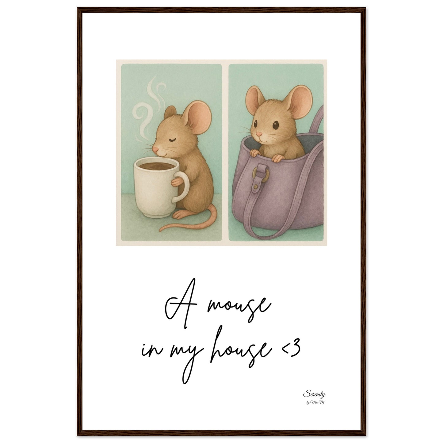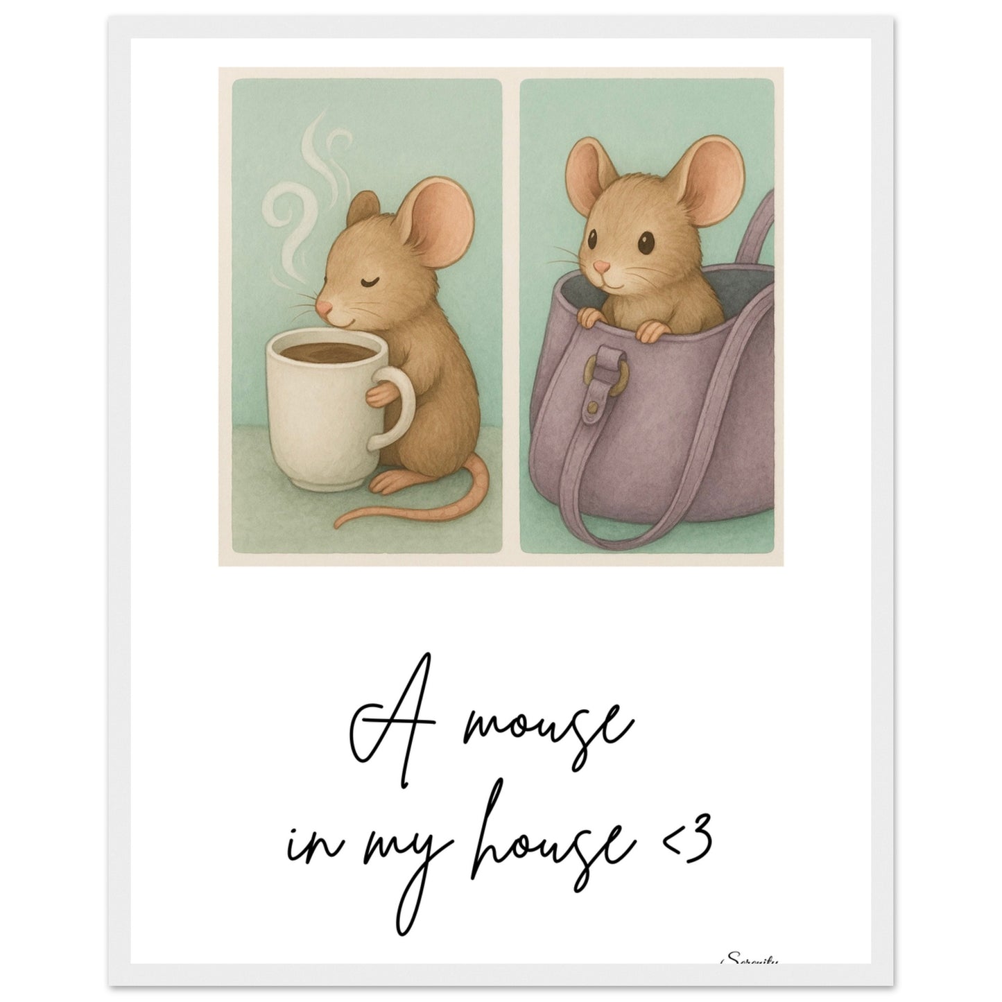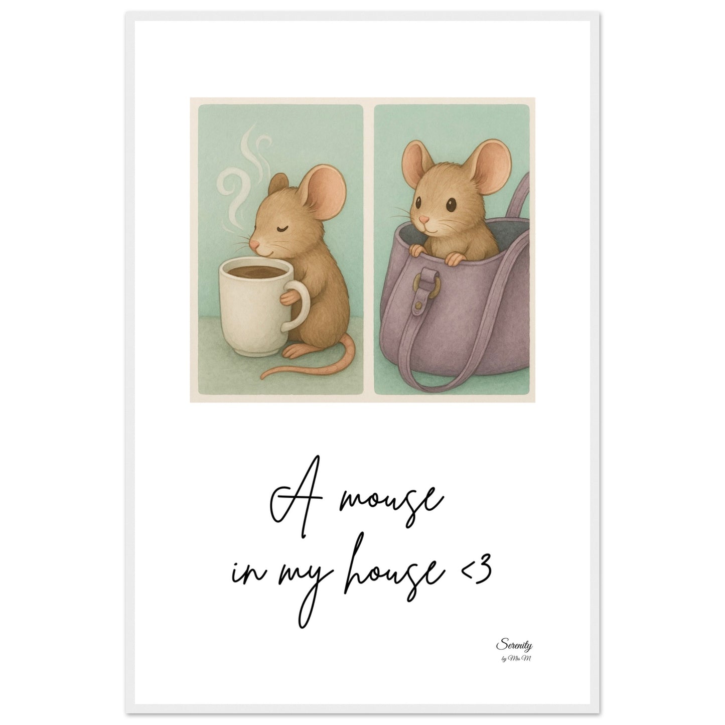 Bring a touch of whimsical coziness into your home with our "A Mouse In My House" framed poster! This delightful artwork features an adorable little mouse, captured in two charming vignettes – one enjoying a warm drink, and the other peeking playfully from a handbag. With its soft, inviting color palette and endearing subject, this poster is perfect for adding a heartwarming, storybook feel to any room, from a nursery to a cozy reading nook.