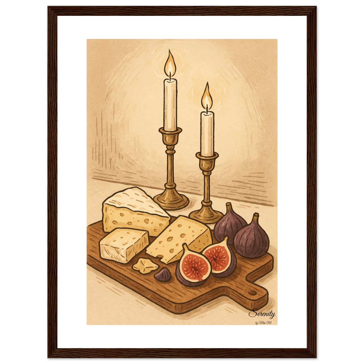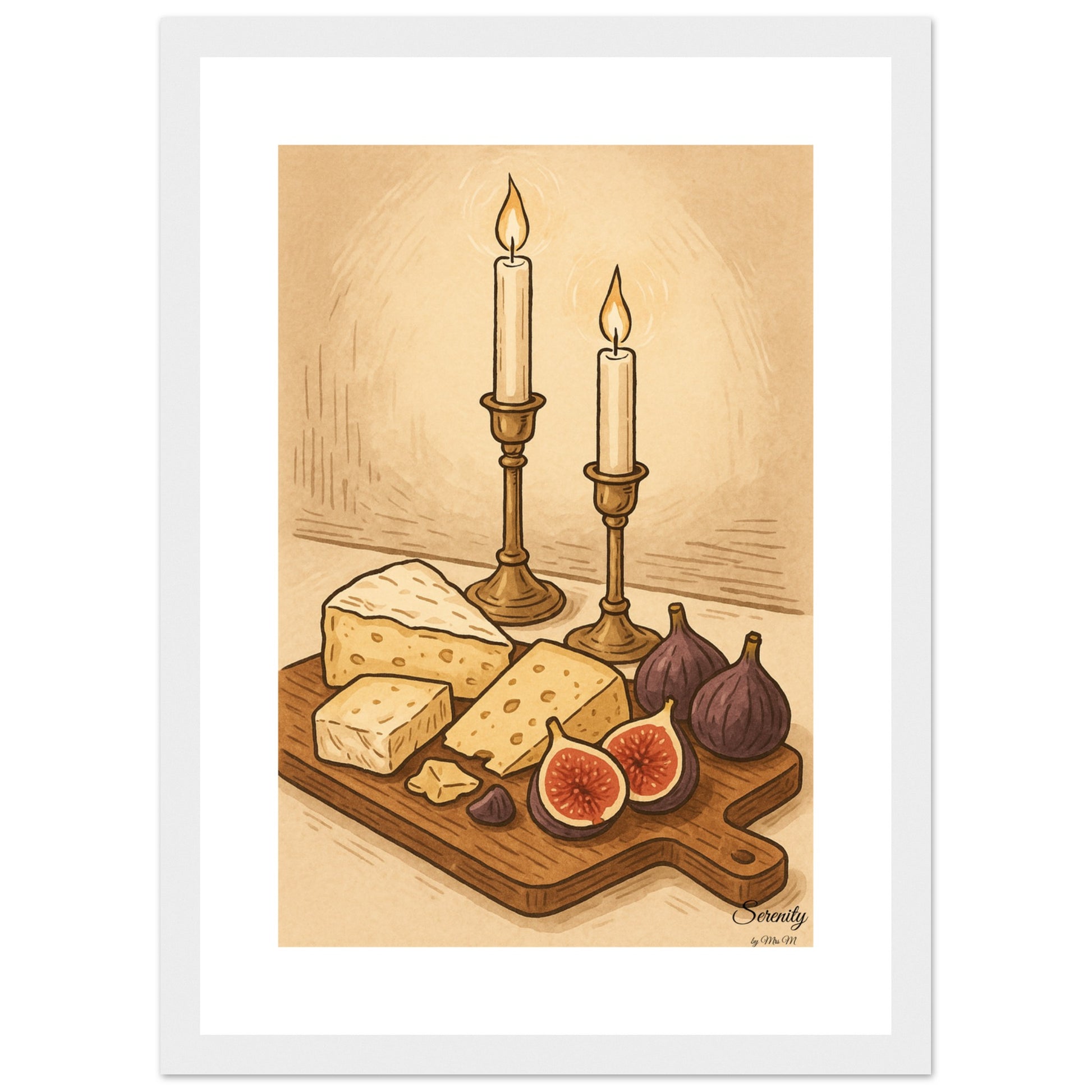 Transform your space into a haven of rustic elegance with our "Cozy Evening Cheese & Fig Board" art print. This charming illustration, featuring a delightful spread of cheeses, ripe figs, and the warm glow of candlelight, evokes a sense of comfort and gourmet indulgence. It's the perfect accent to bring a touch of old-world charm and culinary inspiration to your kitchen, dining room, or a cozy reading nook.
