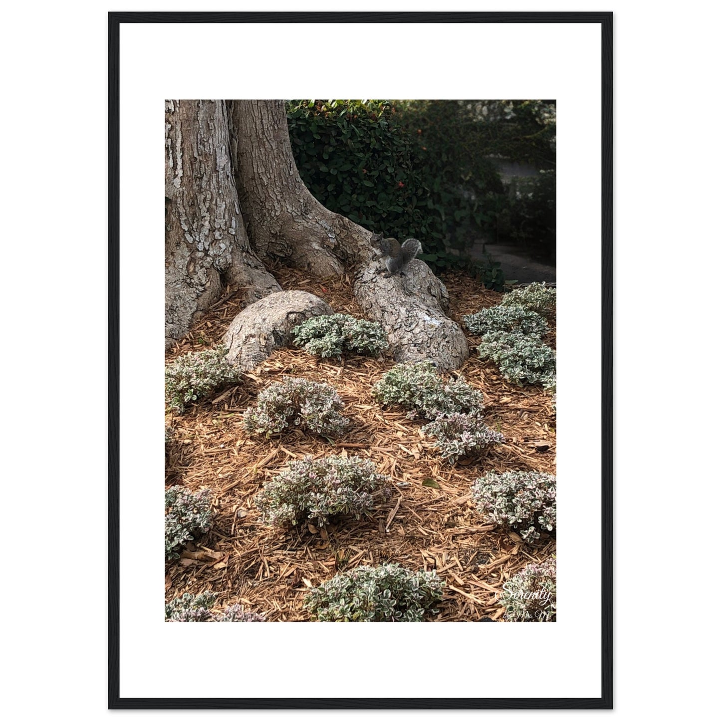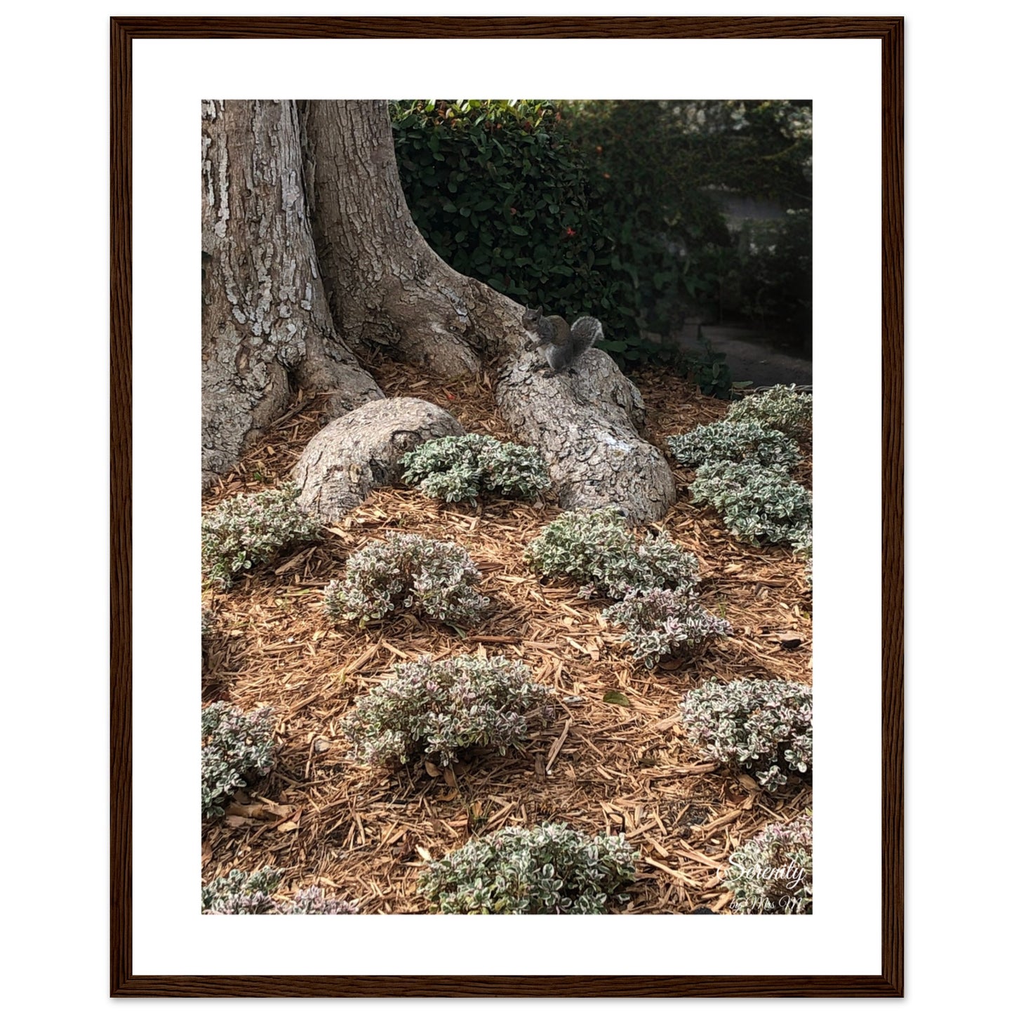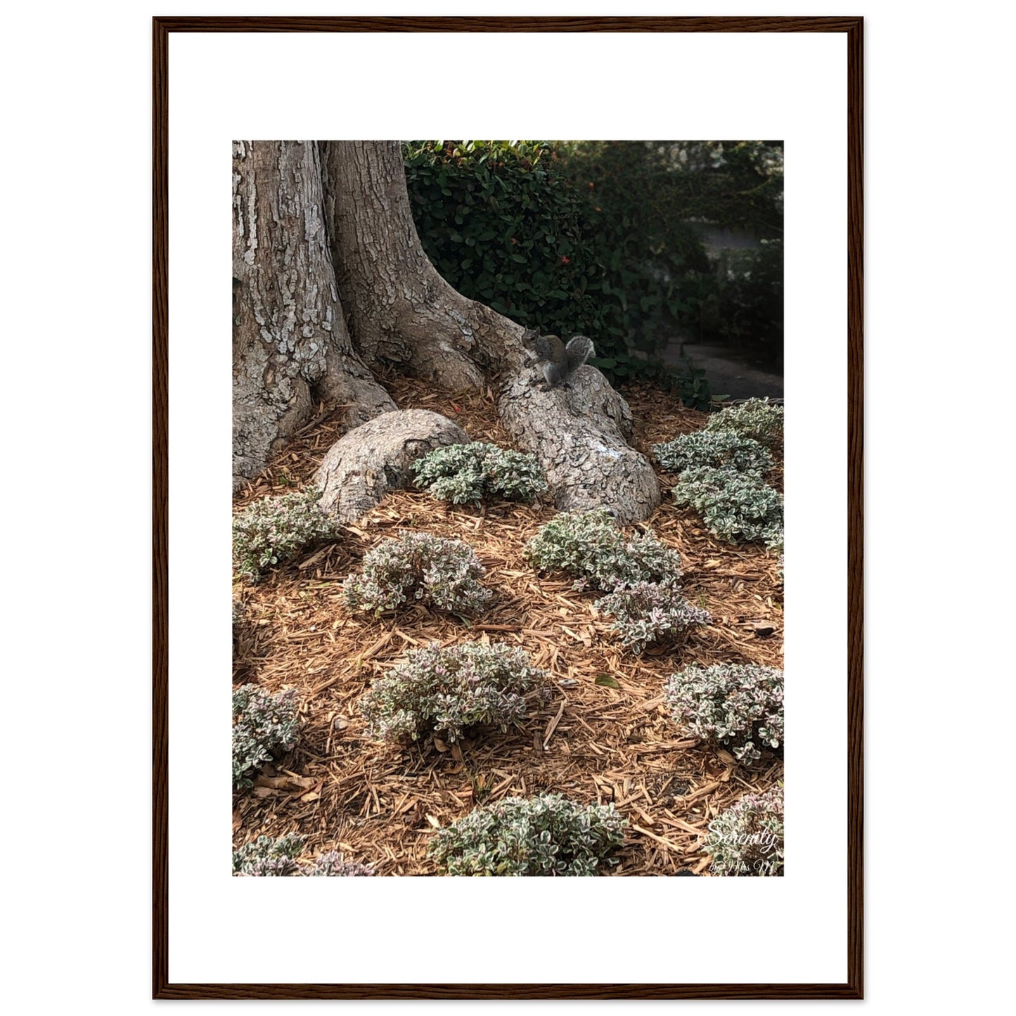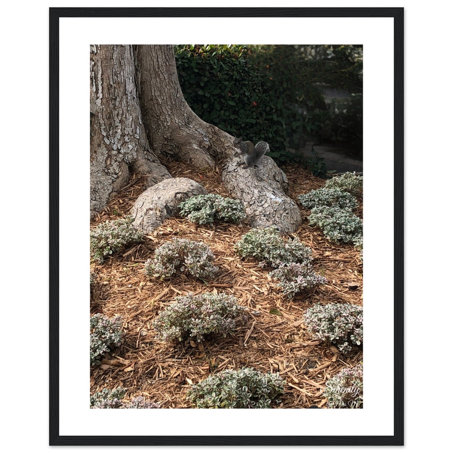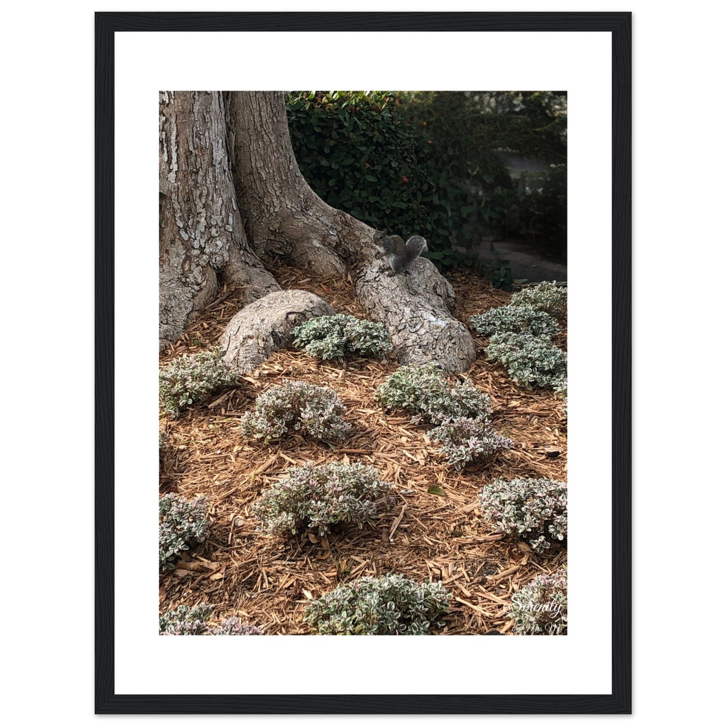 Bring the peaceful charm of a woodland moment into your home with this captivating framed poster. Featuring a delightful squirrel amidst lush greenery and the sturdy texture of an ancient tree, this piece evokes a sense of natural tranquility and curiosity. It's a perfect accent for any room seeking a touch of outdoor serenity and gentle wildlife.