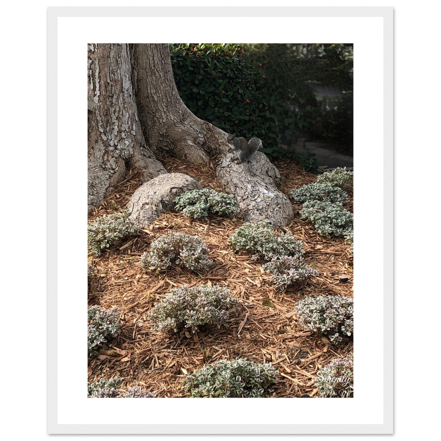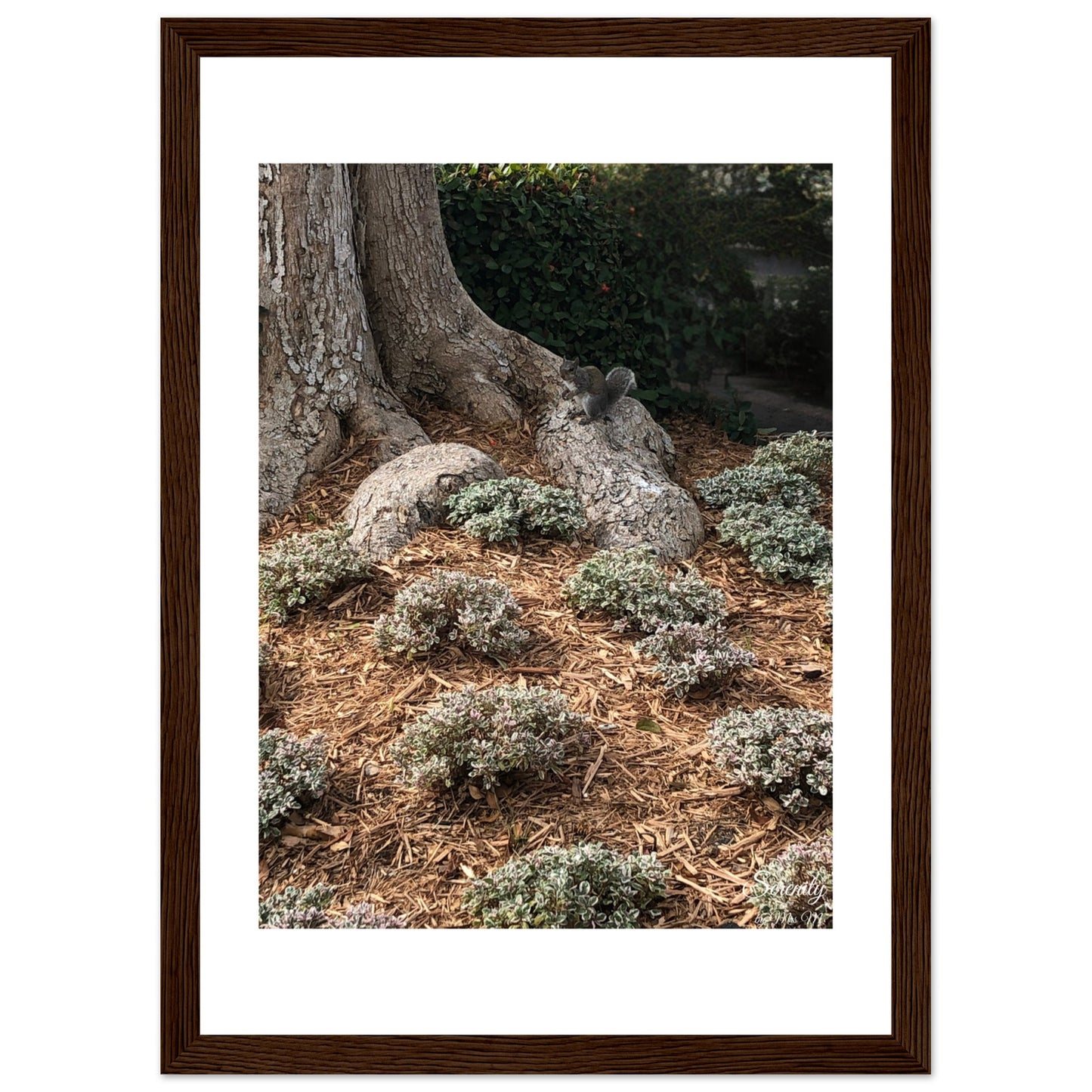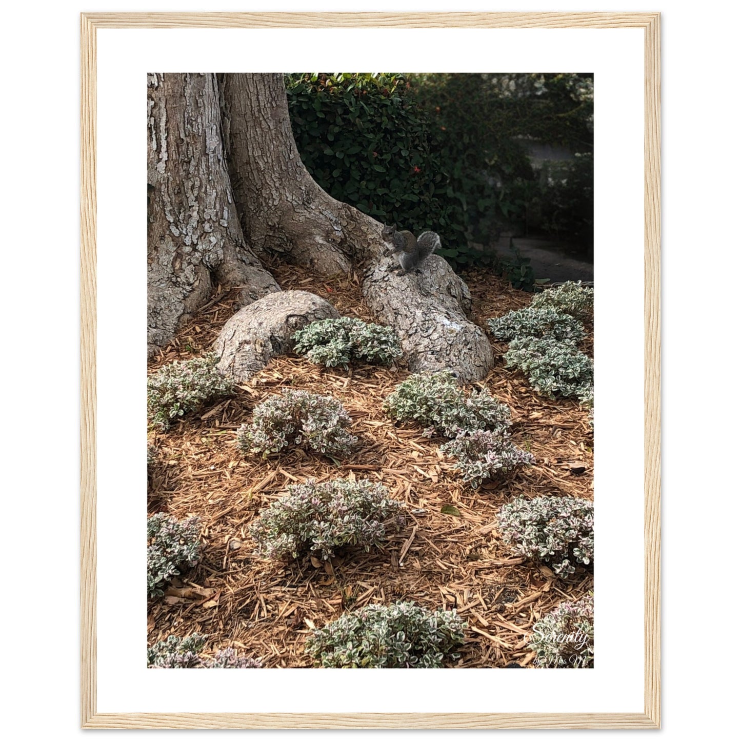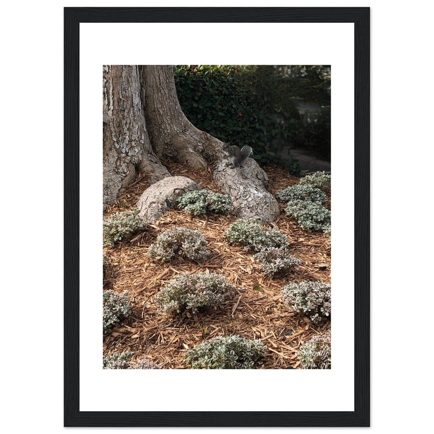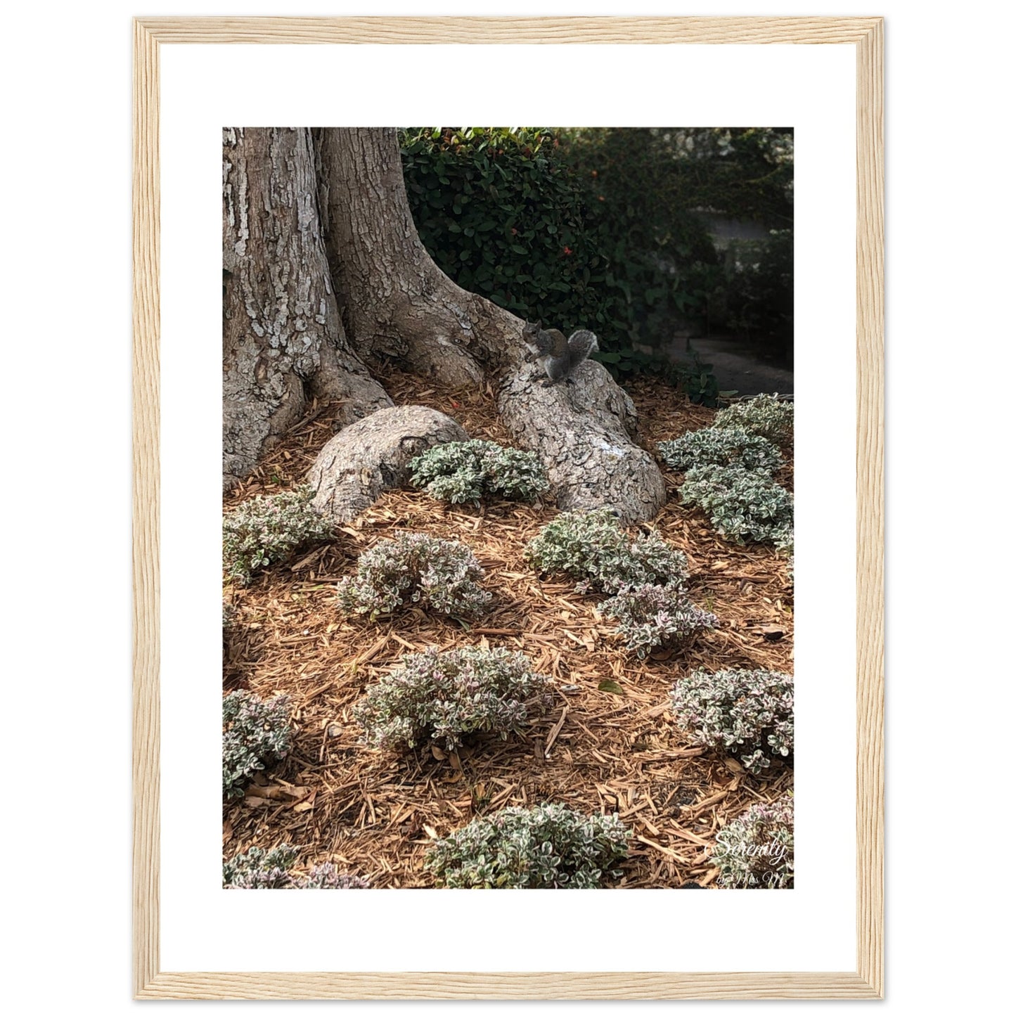 Bring the peaceful charm of a woodland moment into your home with this captivating framed poster. Featuring a delightful squirrel amidst lush greenery and the sturdy texture of an ancient tree, this piece evokes a sense of natural tranquility and curiosity. It's a perfect accent for any room seeking a touch of outdoor serenity and gentle wildlife.