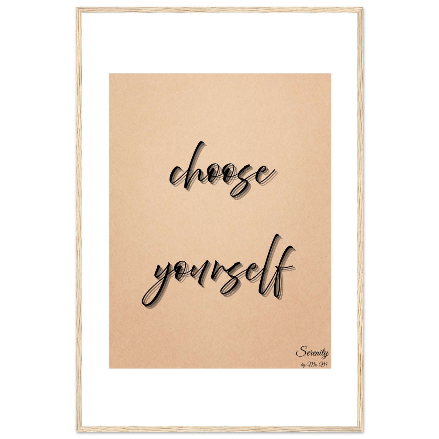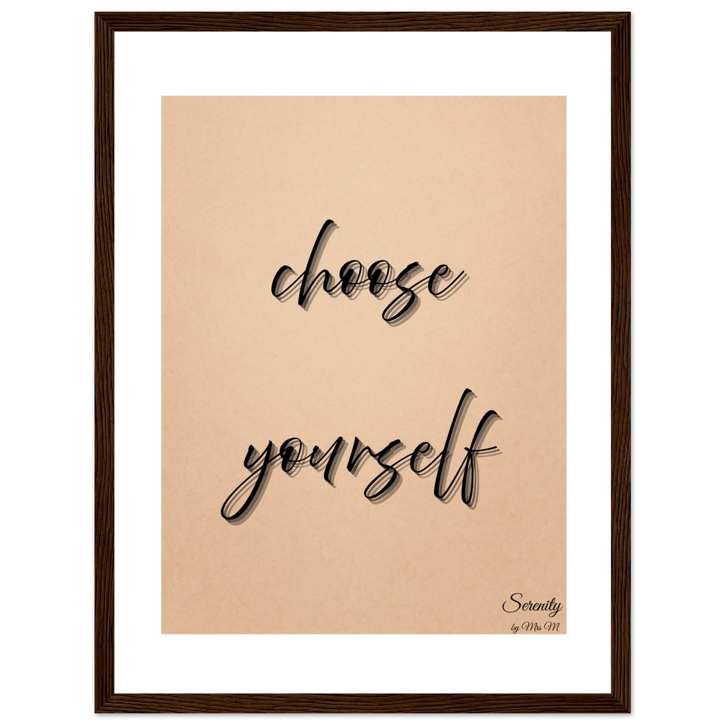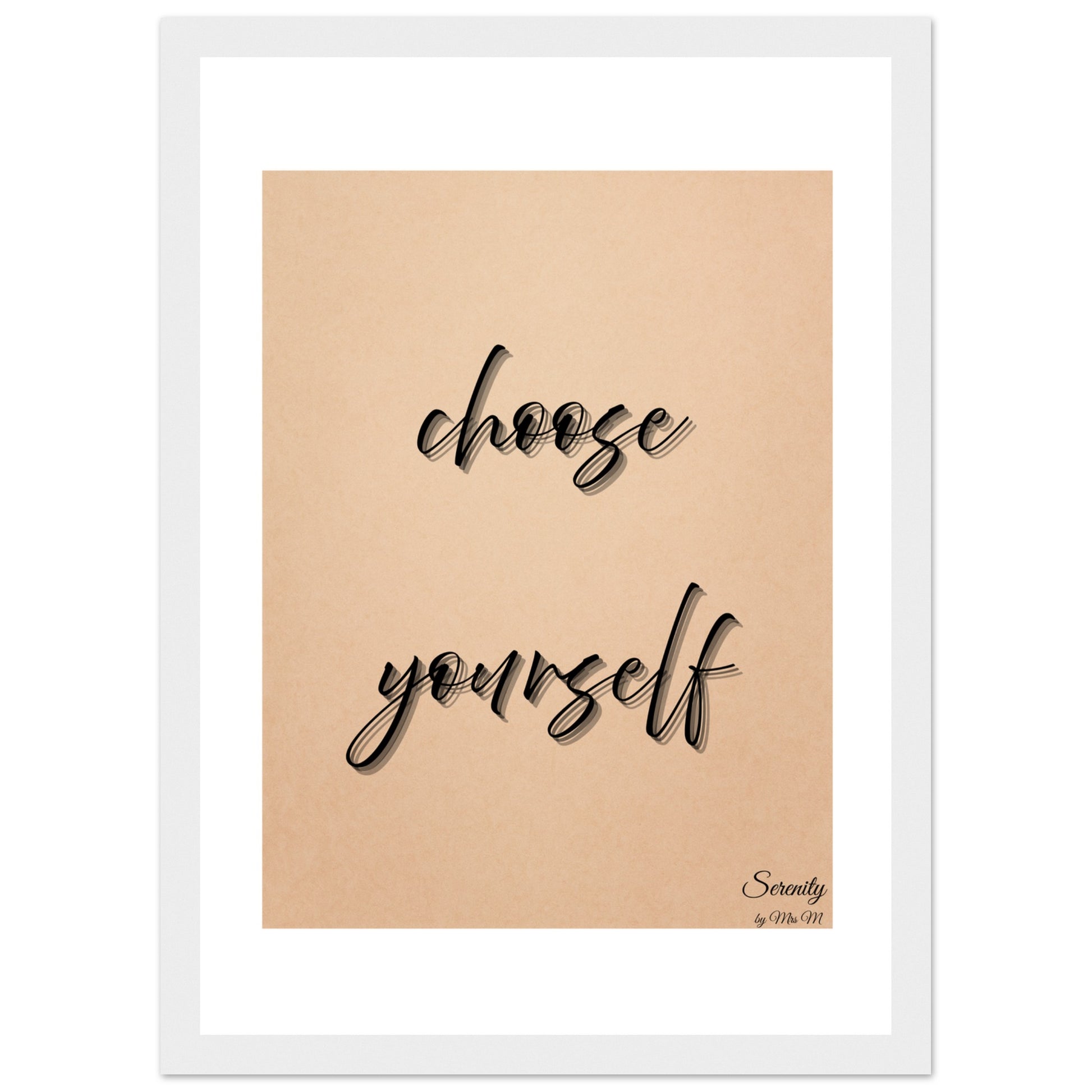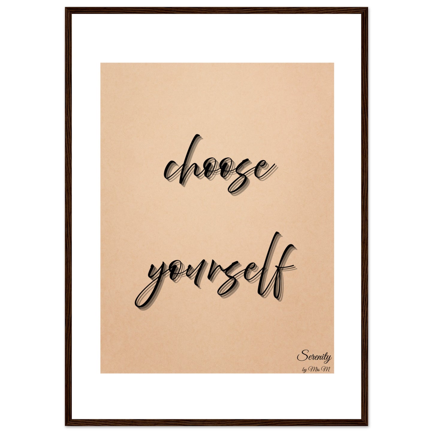 Empower your space and nurture your soul with our "choose yourself" framed poster. This elegant piece, featuring flowing modern script against a warm, minimalist background, serves as a gentle daily reminder to prioritize your well-being and self-love. Created by Serenity by Mrs M, it's more than just decor—it's a statement of personal affirmation designed to inspire peace and confidence in any room.