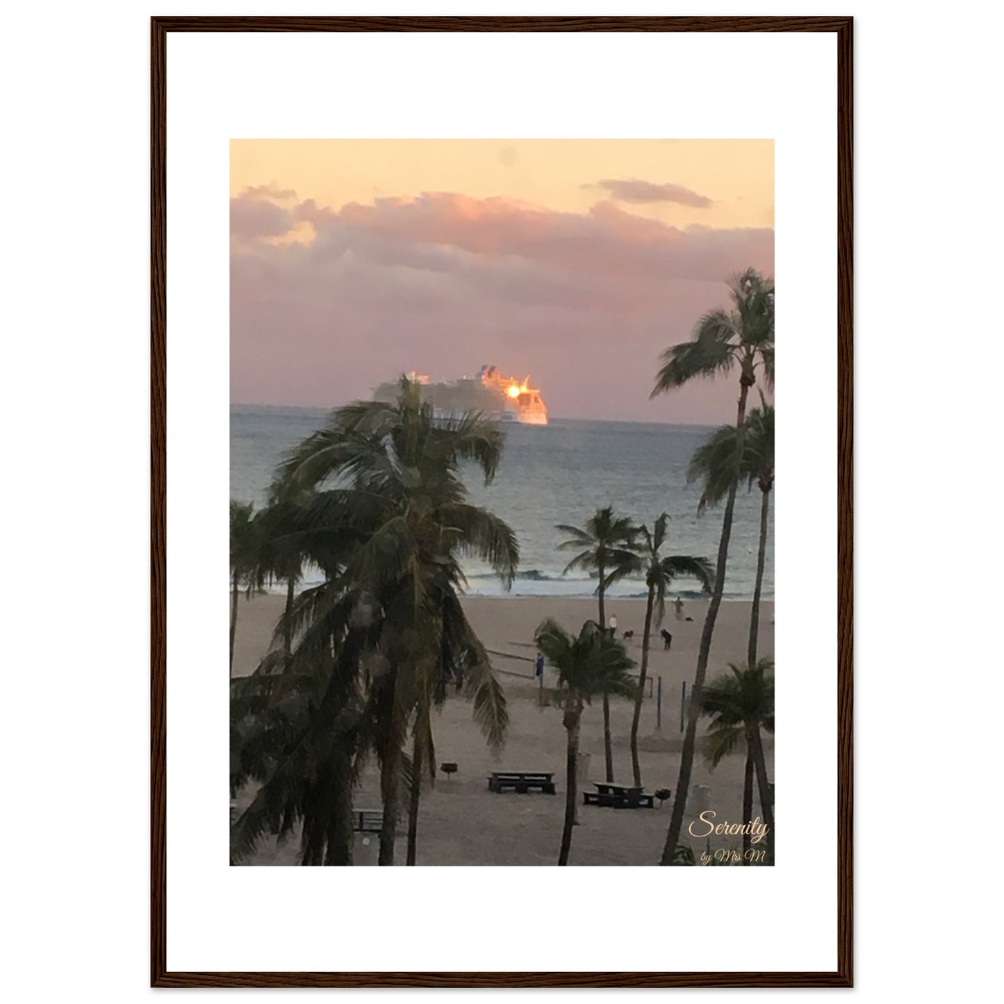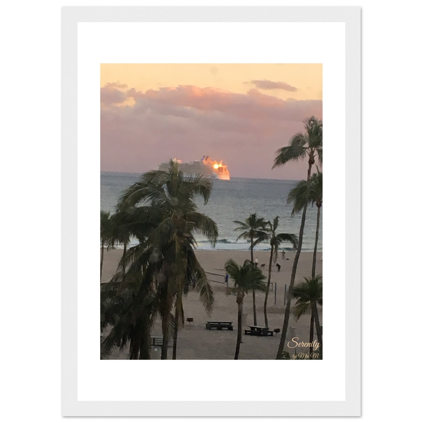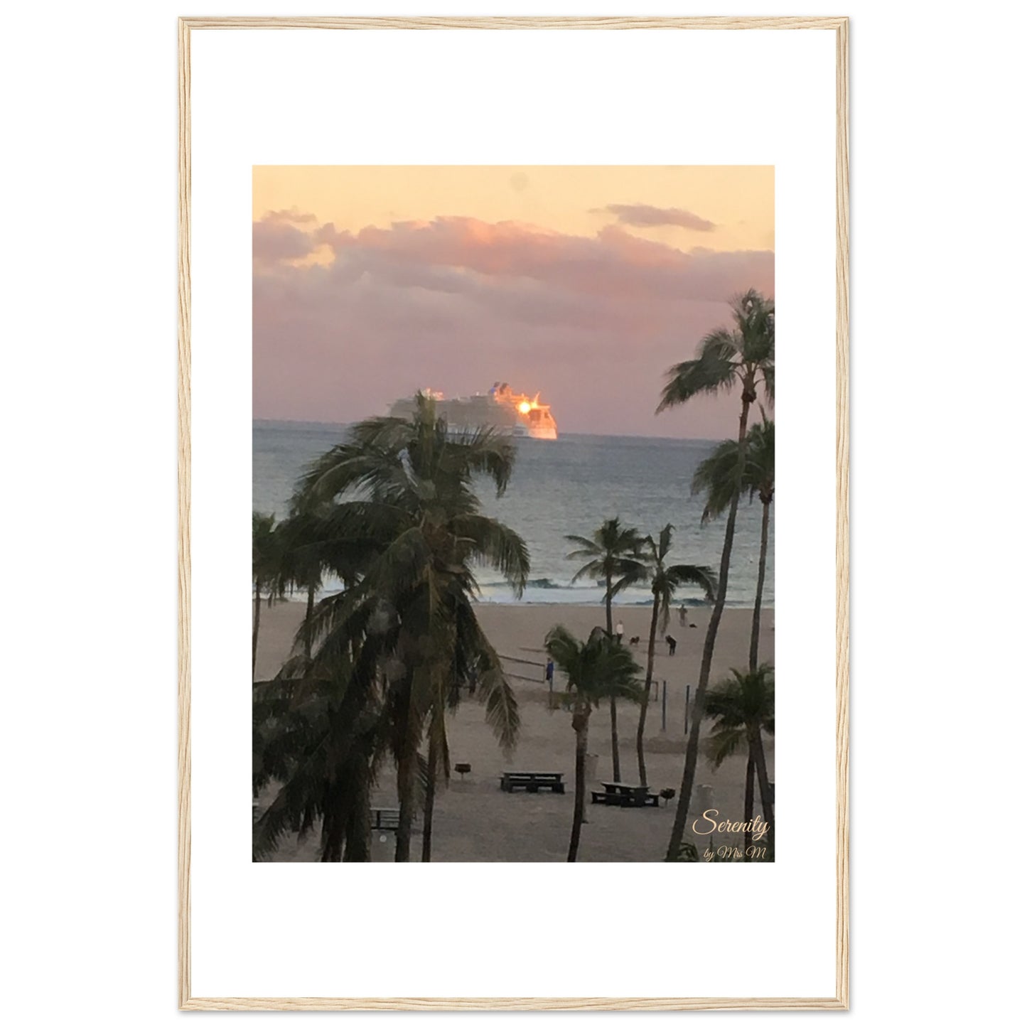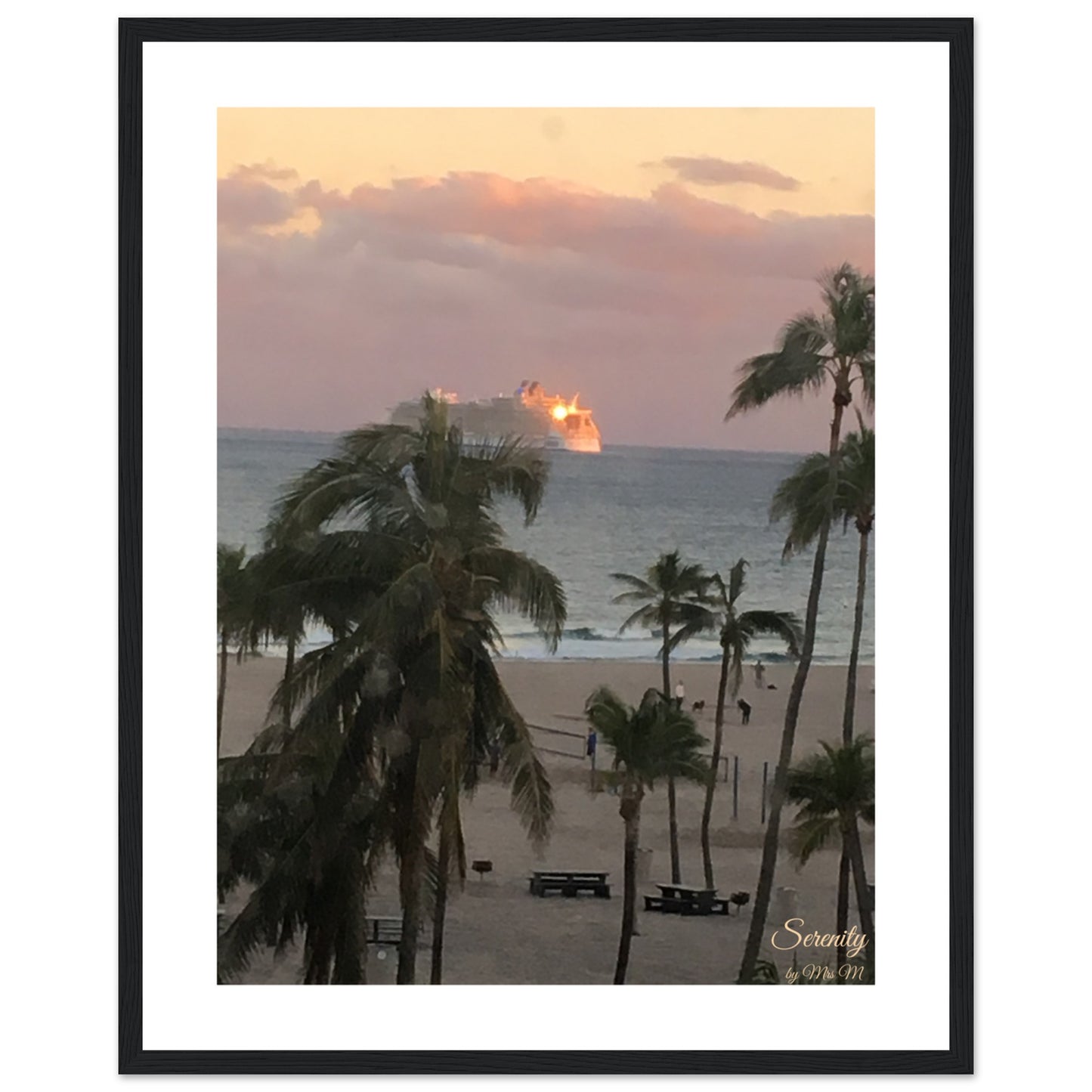 Bring the tranquil beauty of a coastal sunset into your home with this captivating framed poster. Featuring the soft, dreamy hues of dusk over the ocean, complete with silhouetted palm trees and a distant cruise ship bathed in warm light, this piece evokes feelings of serenity and escape. It’s a perfect addition for anyone who dreams of beachside evenings or cherishes the calm of the open sea.