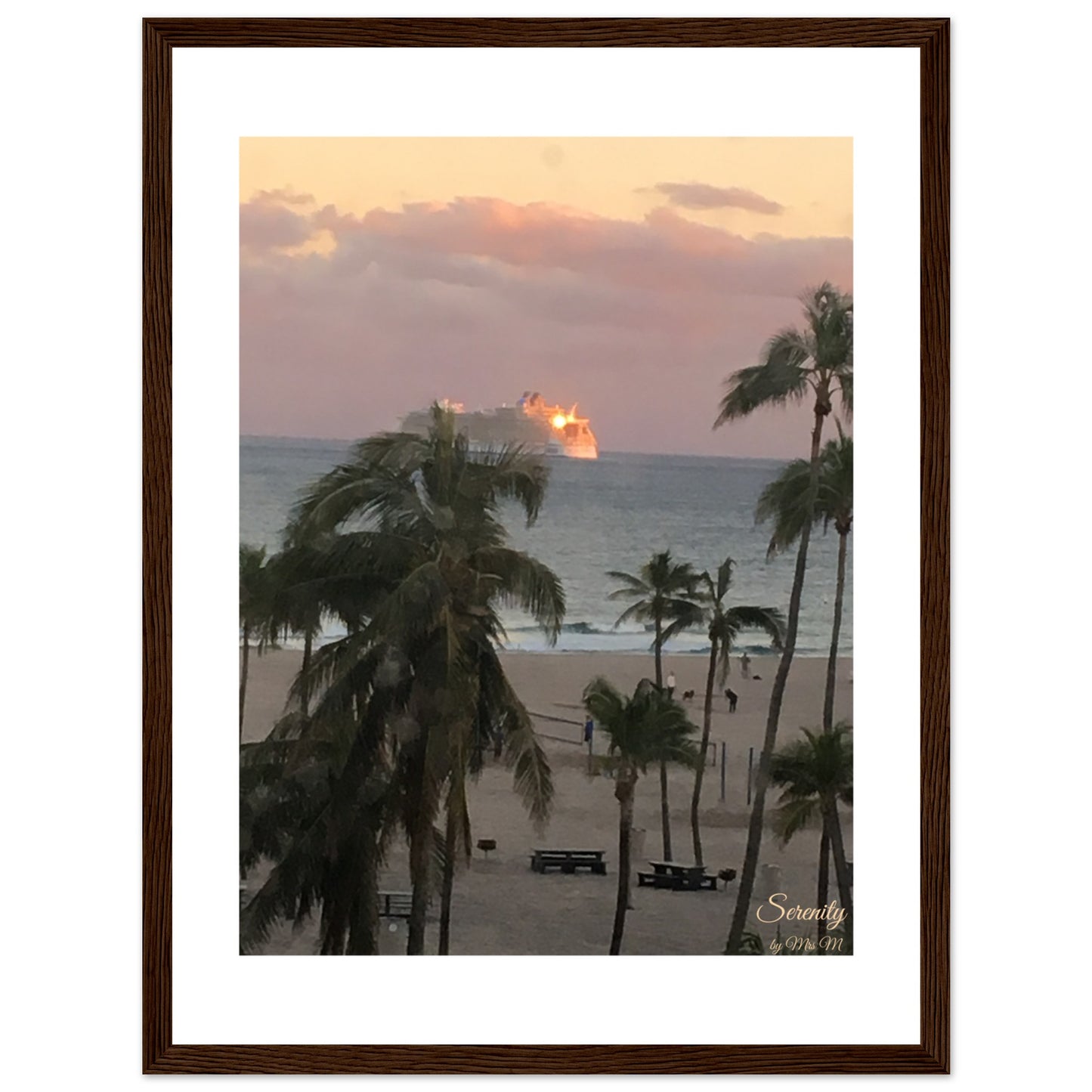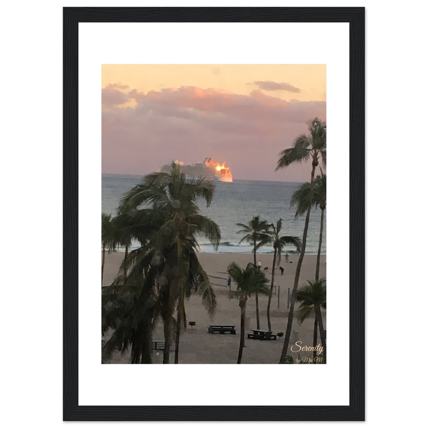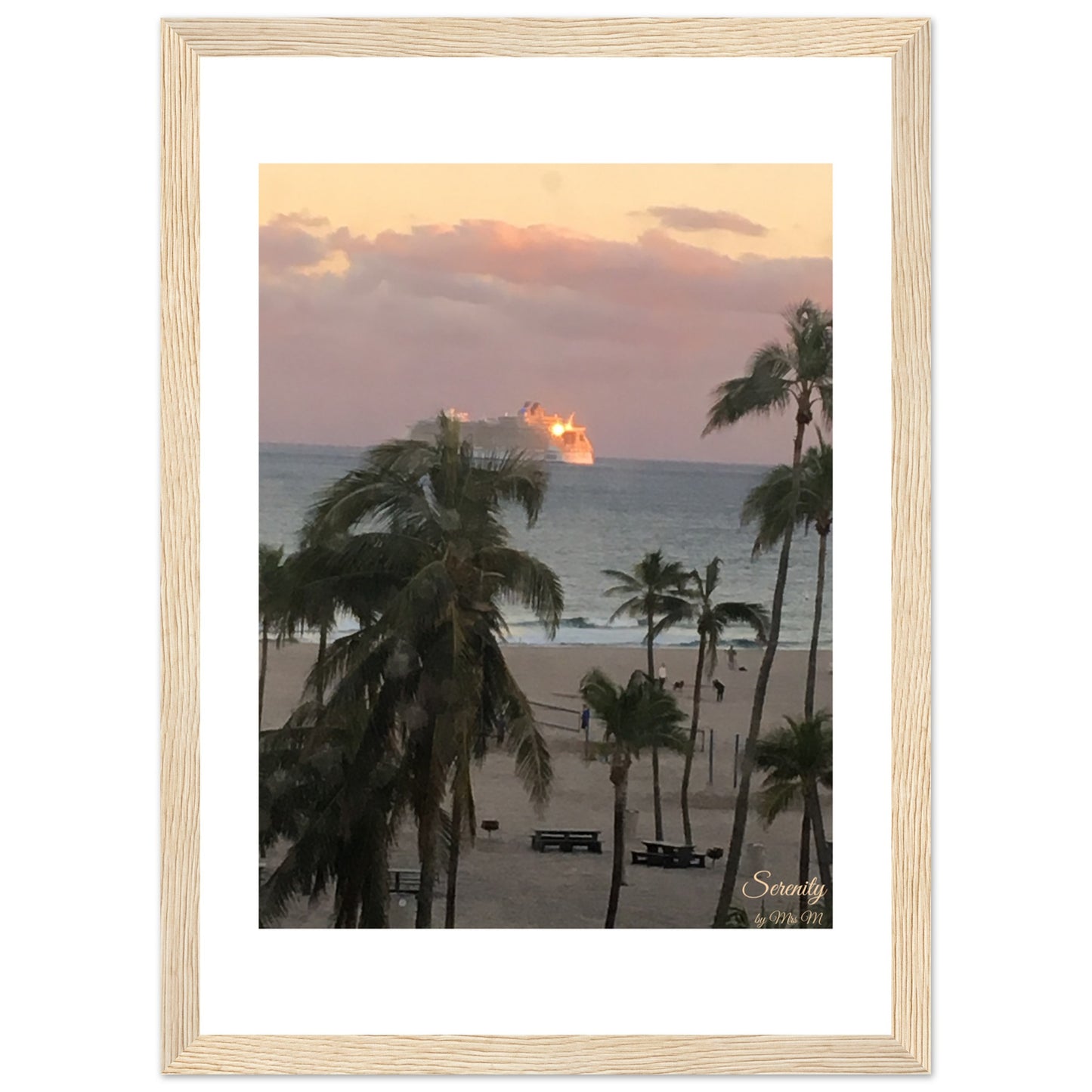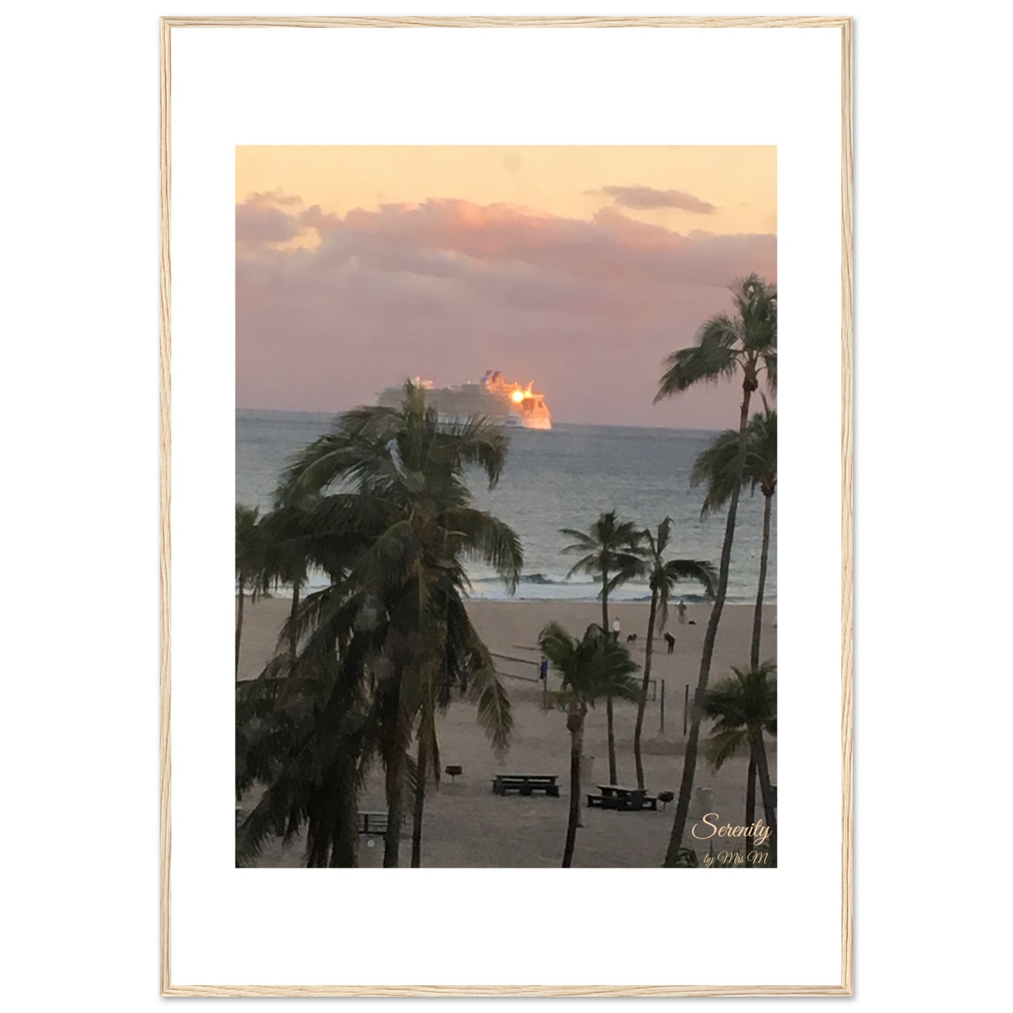 Bring the tranquil beauty of a coastal sunset into your home with this captivating framed poster. Featuring the soft, dreamy hues of dusk over the ocean, complete with silhouetted palm trees and a distant cruise ship bathed in warm light, this piece evokes feelings of serenity and escape. It’s a perfect addition for anyone who dreams of beachside evenings or cherishes the calm of the open sea.
