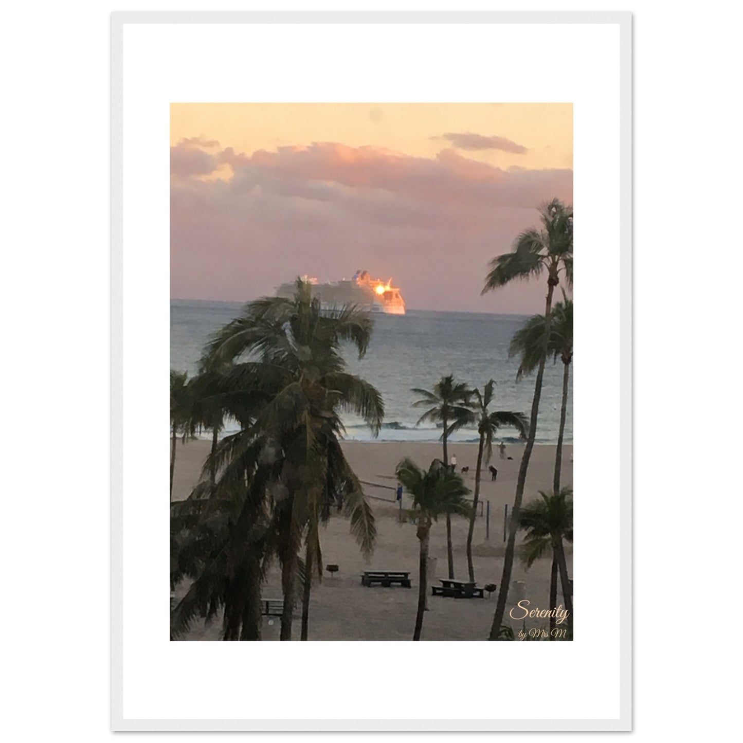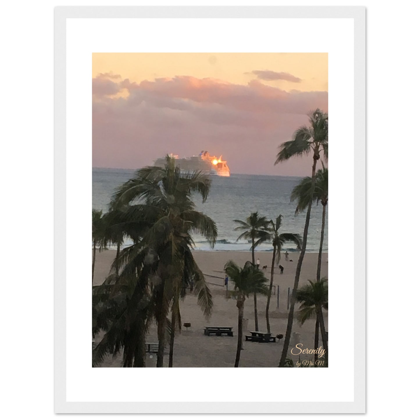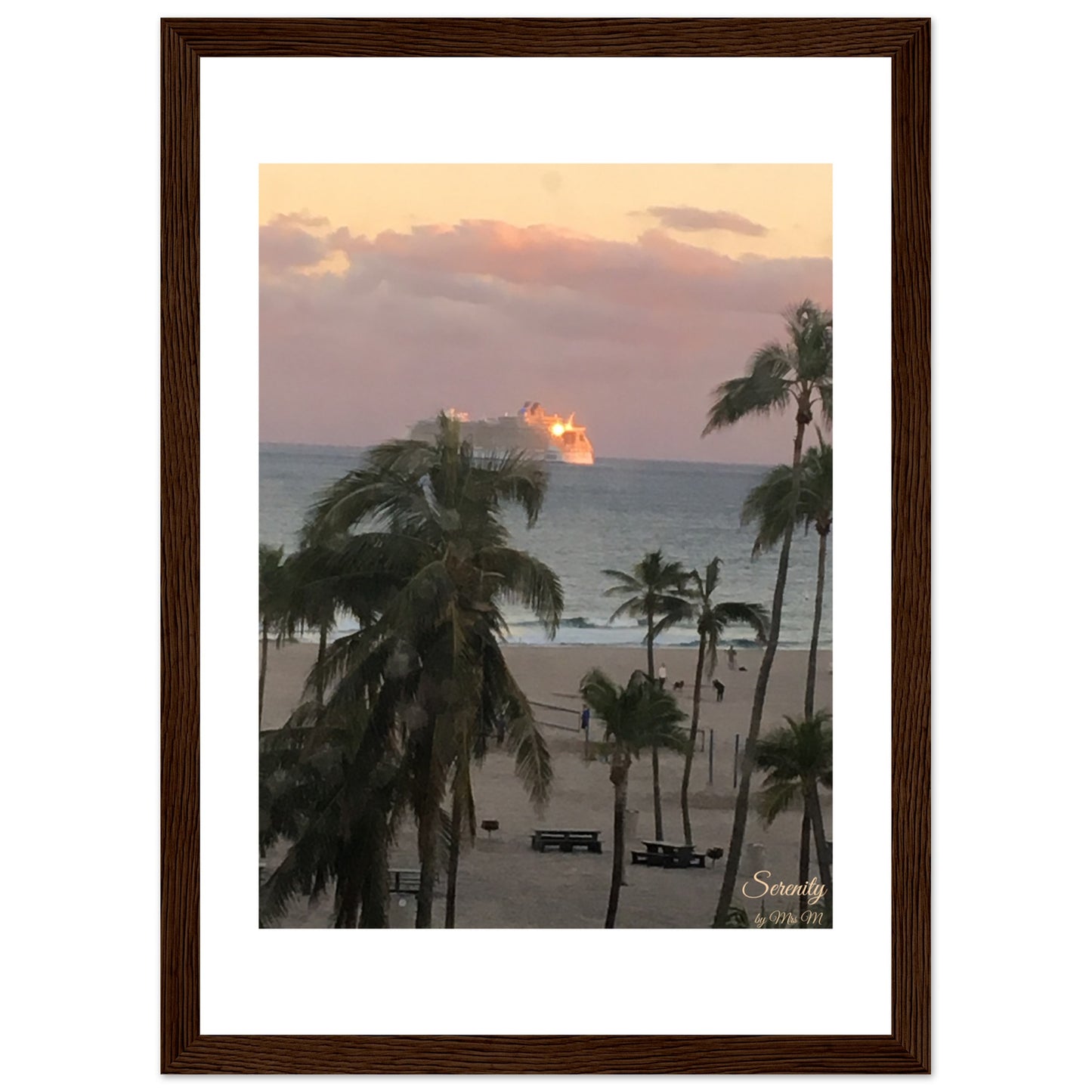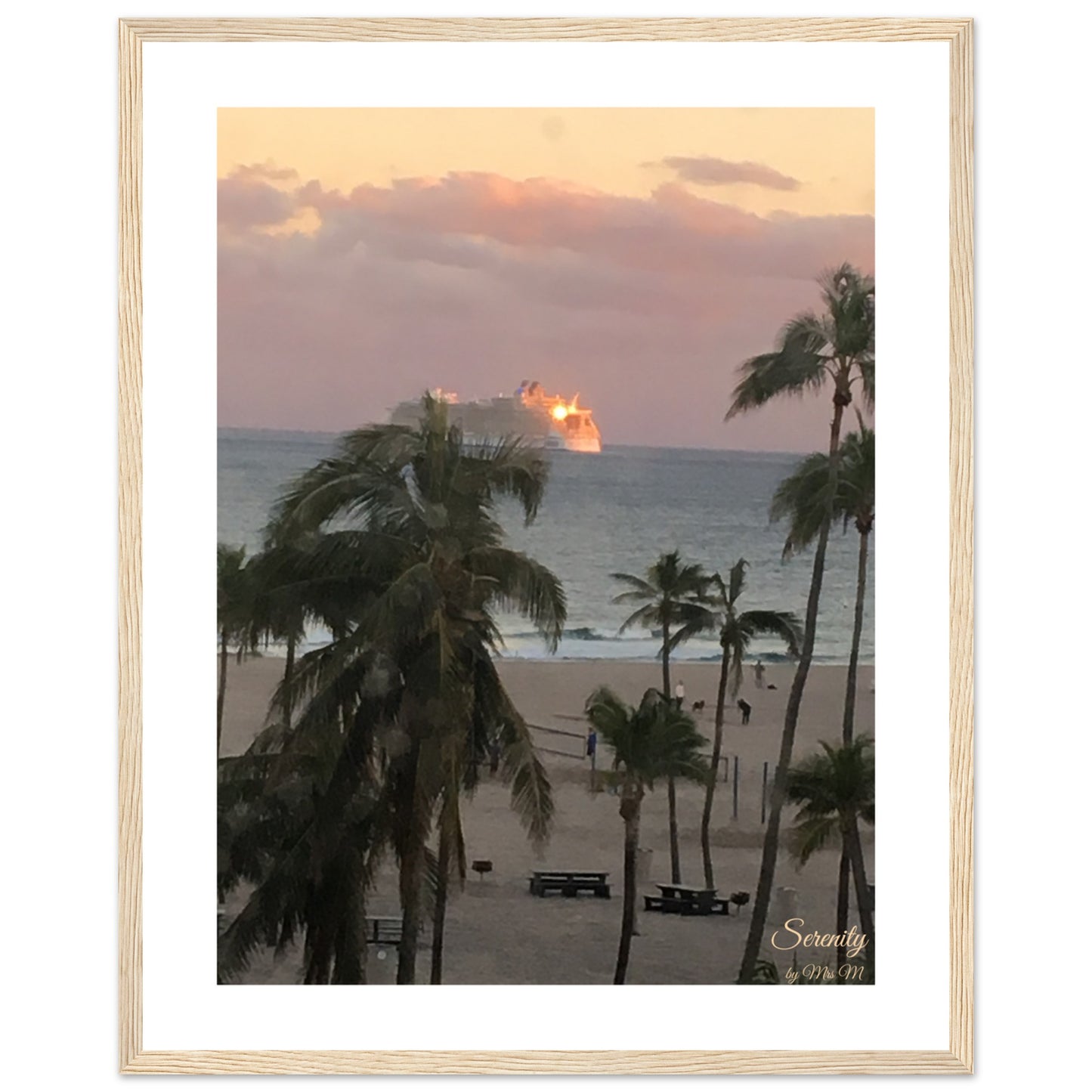 Bring the tranquil beauty of a coastal sunset into your home with this captivating framed poster. Featuring the soft, dreamy hues of dusk over the ocean, complete with silhouetted palm trees and a distant cruise ship bathed in warm light, this piece evokes feelings of serenity and escape. It’s a perfect addition for anyone who dreams of beachside evenings or cherishes the calm of the open sea.