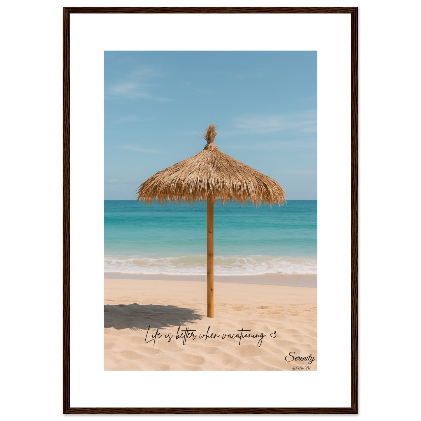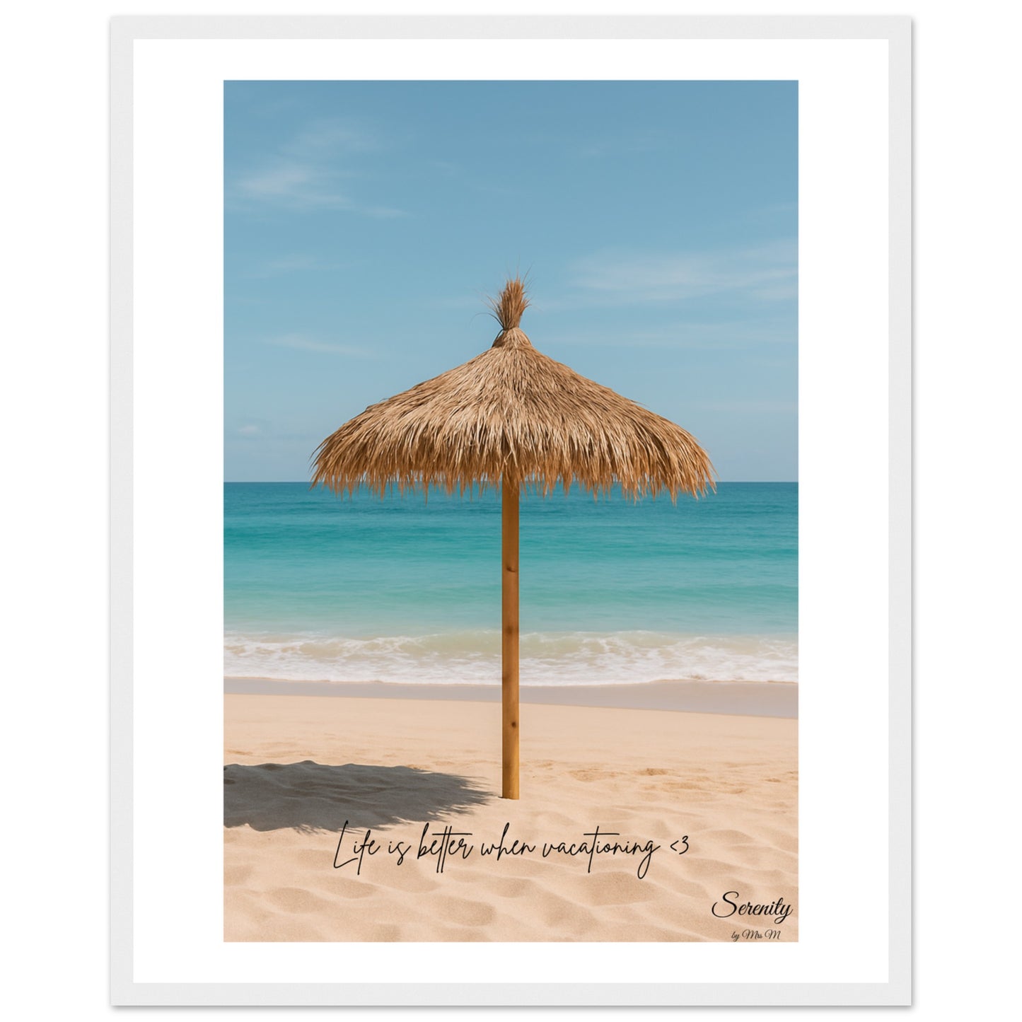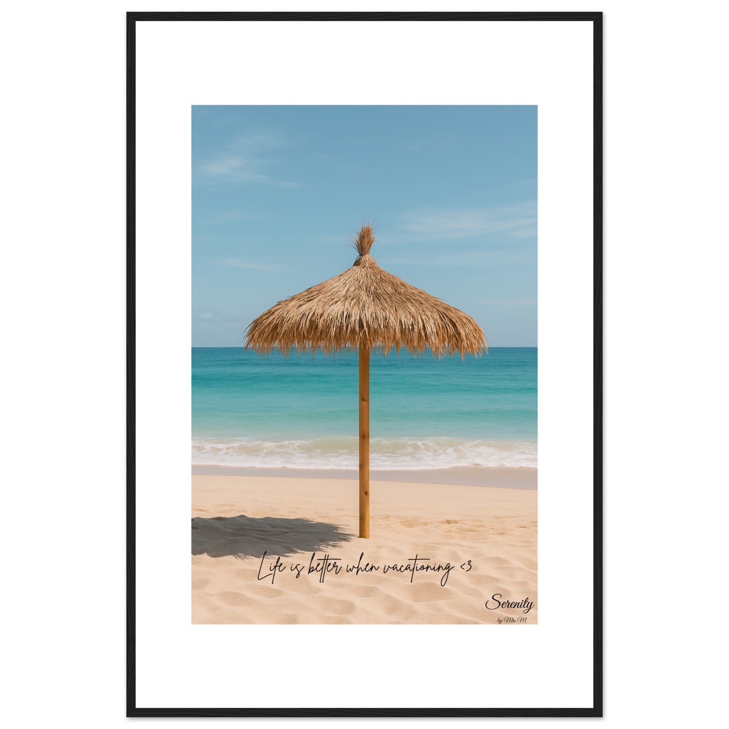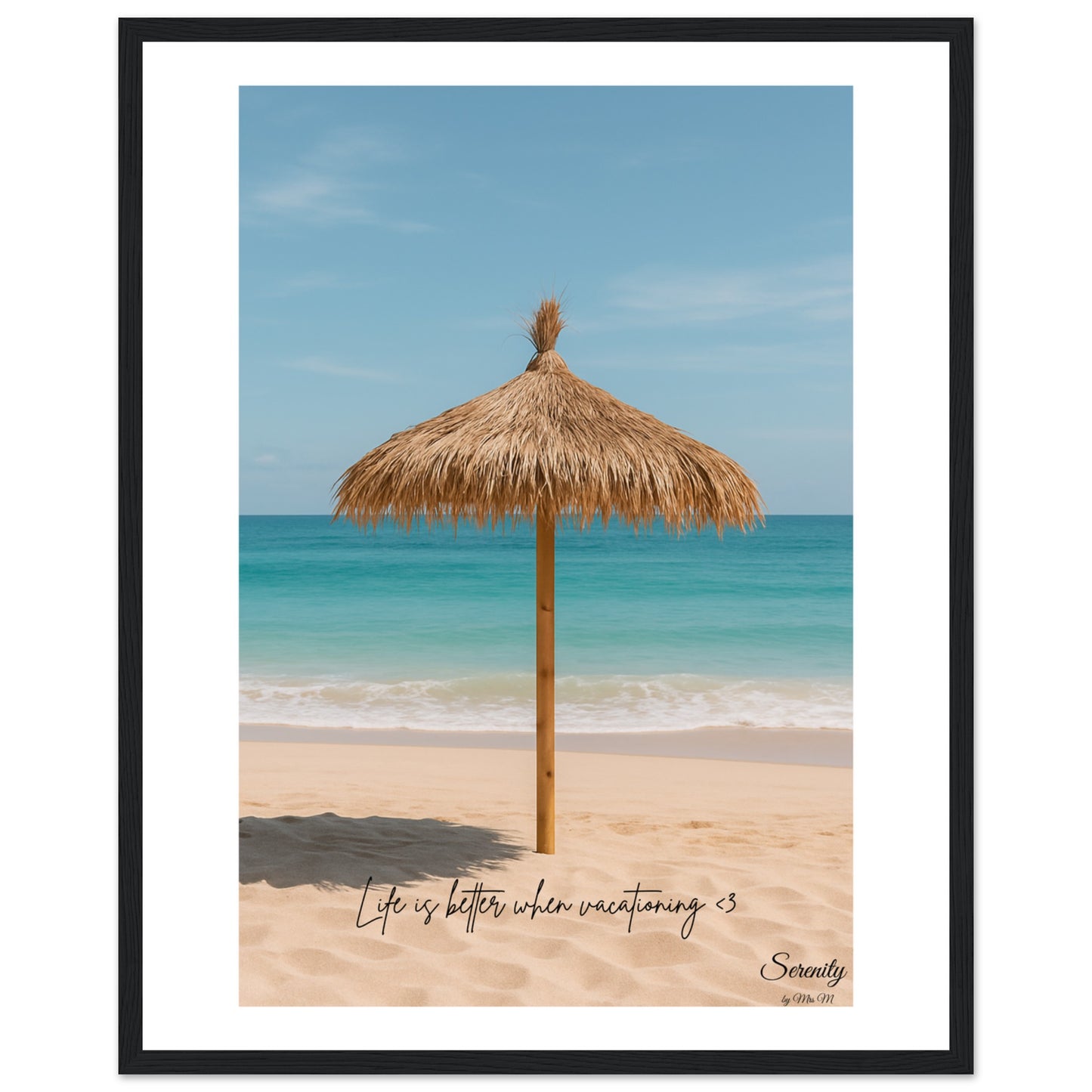 Bring the tranquil calm of a pristine beach right into your home with our Coastal Serenity Framed Poster. This captivating piece, featuring a sun-drenched straw umbrella against an azure sea and golden sand, evokes the blissful feeling of a perfect vacation day. The elegant script, "Life is better when vacationing <3", serves as a gentle reminder to embrace joy and relaxation, making it an ideal accent for any space longing for a touch of seaside escape.