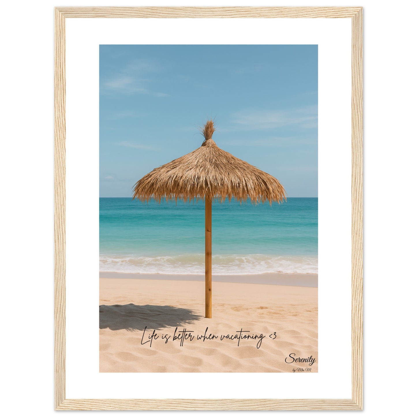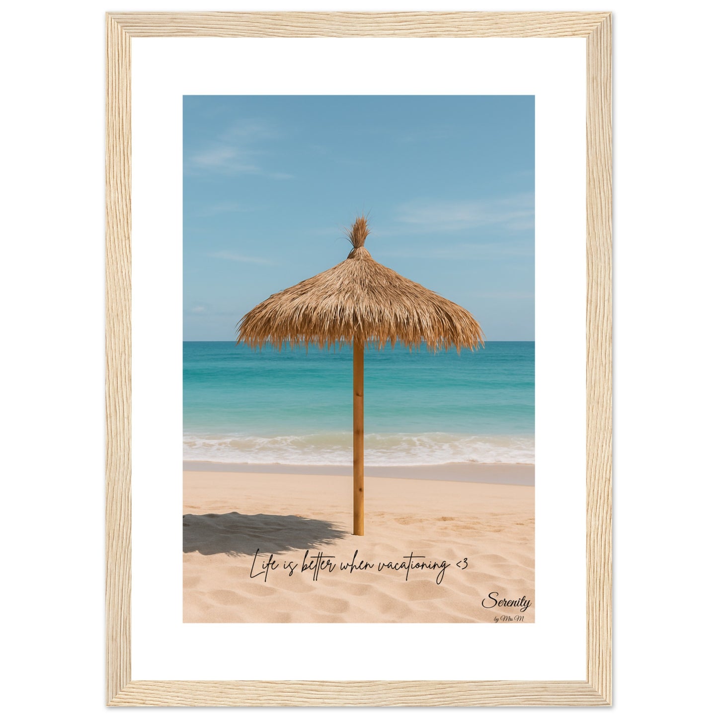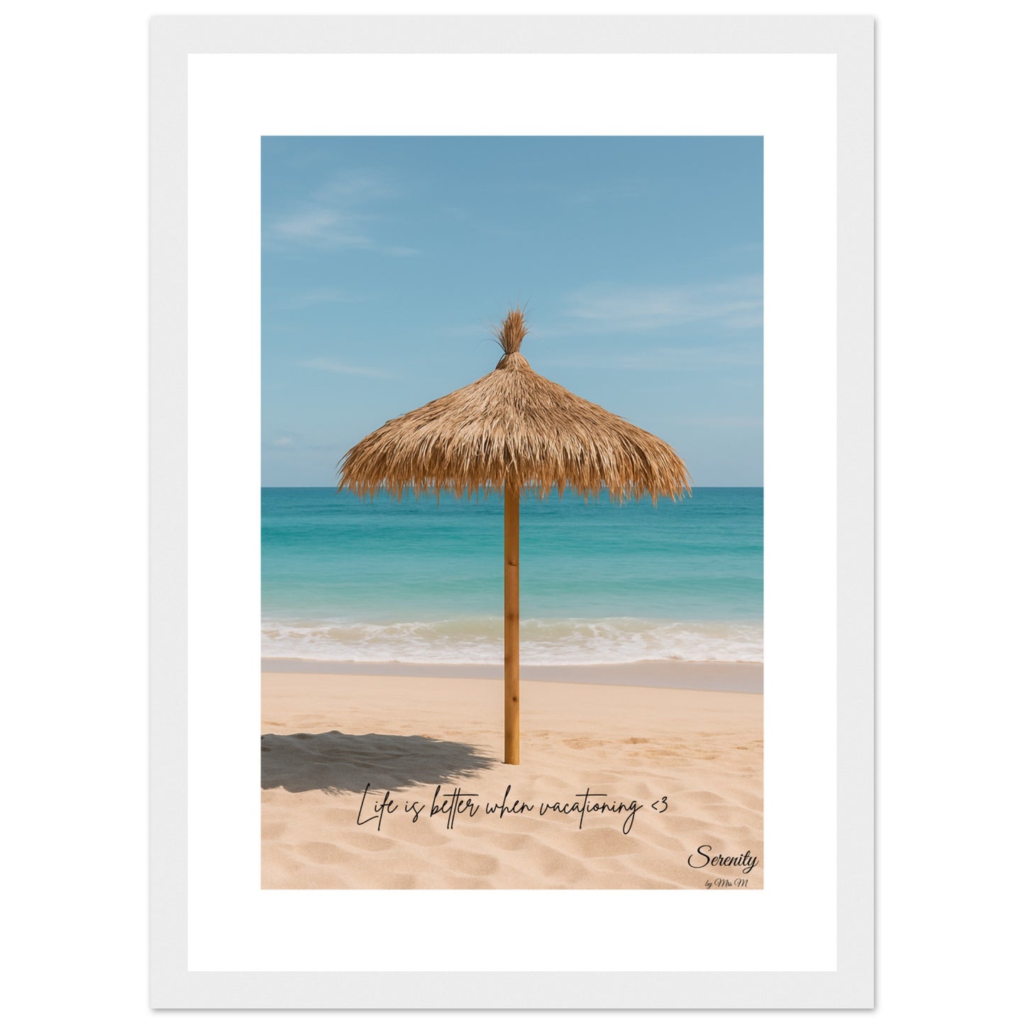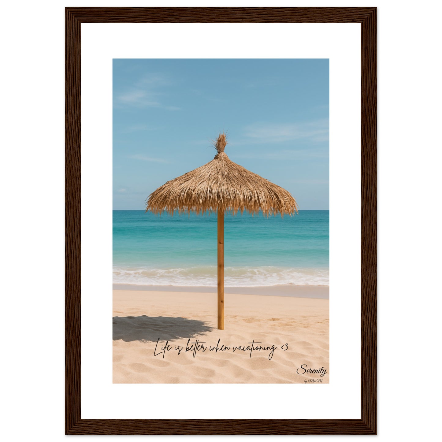 Bring the tranquil calm of a pristine beach right into your home with our Coastal Serenity Framed Poster. This captivating piece, featuring a sun-drenched straw umbrella against an azure sea and golden sand, evokes the blissful feeling of a perfect vacation day. The elegant script, "Life is better when vacationing <3", serves as a gentle reminder to embrace joy and relaxation, making it an ideal accent for any space longing for a touch of seaside escape.