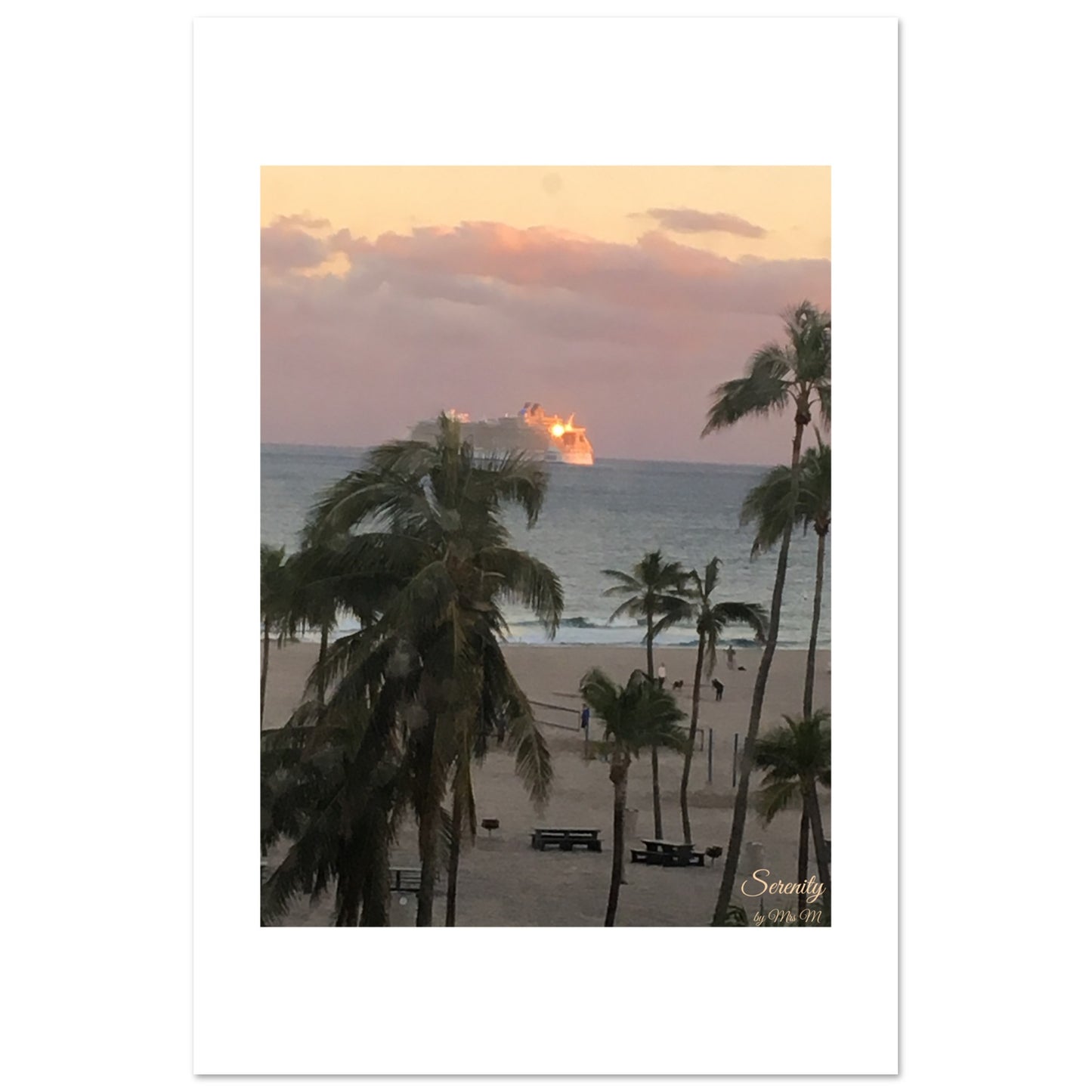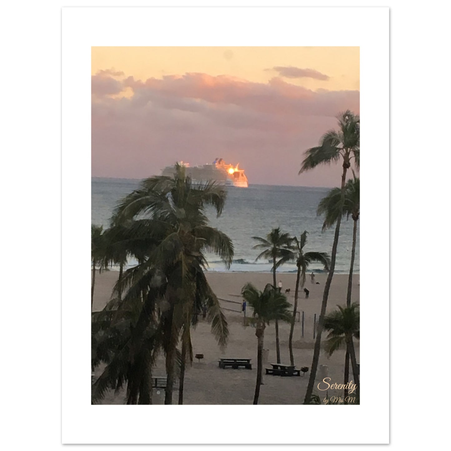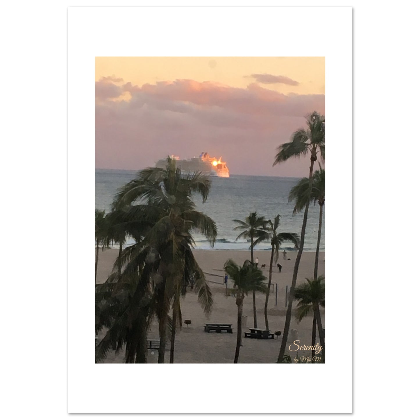 Bring the tranquil beauty of a tropical sunset right into your home with our "Coastal Serenity Sunset Cruise" poster. This art print captures the serene moment of a cruise ship gently passing on the horizon, bathed in the soft, warm hues of dusk. Lush palm trees frame a peaceful beach scene, inviting a feeling of calm and escape into your everyday space. It's the perfect accent to add a touch of vacation bliss and elegant color to any room.