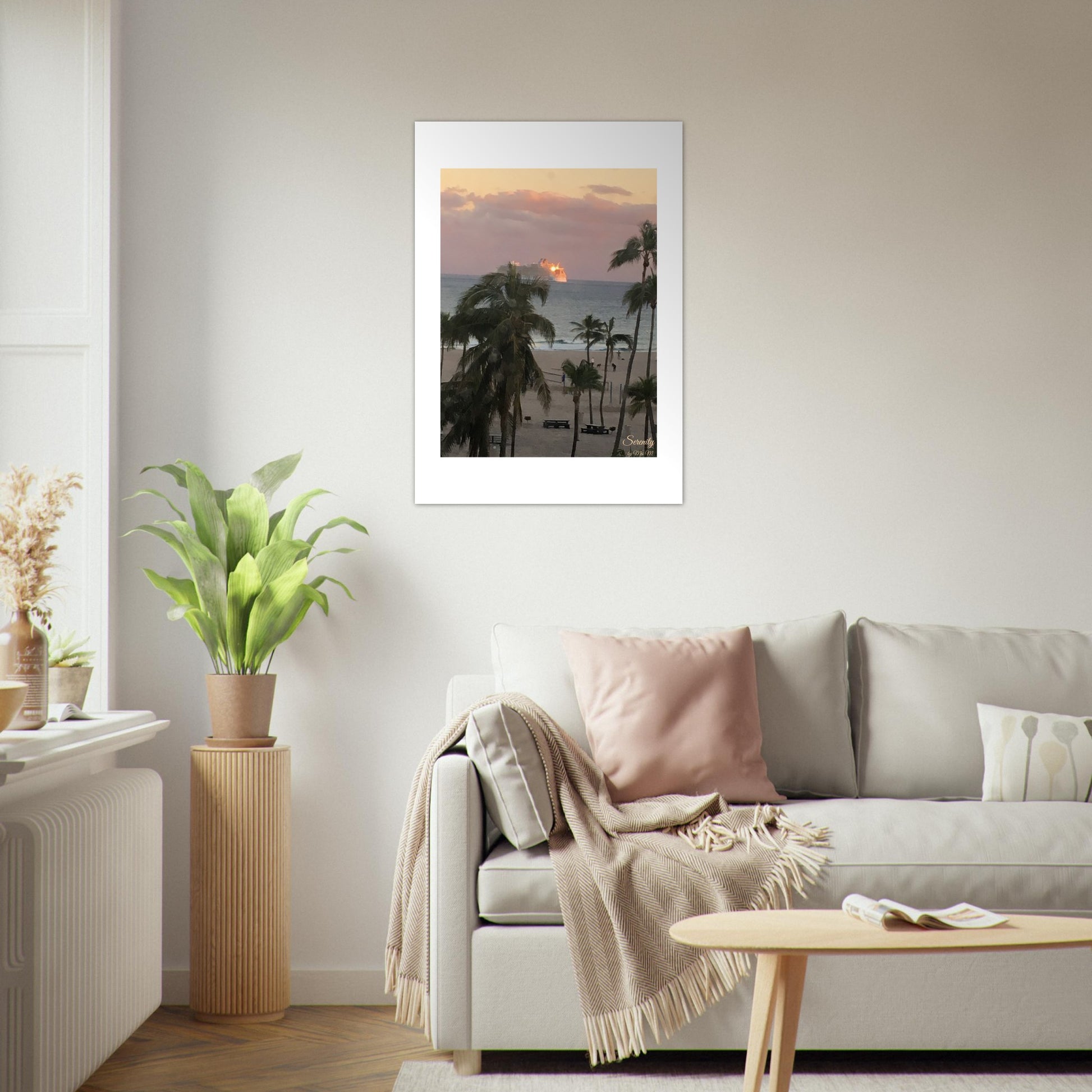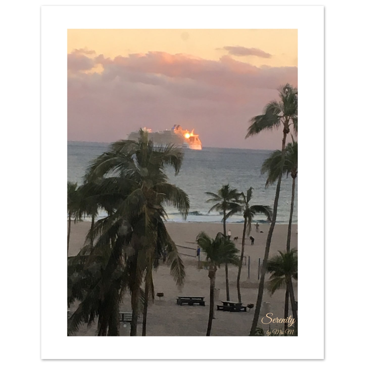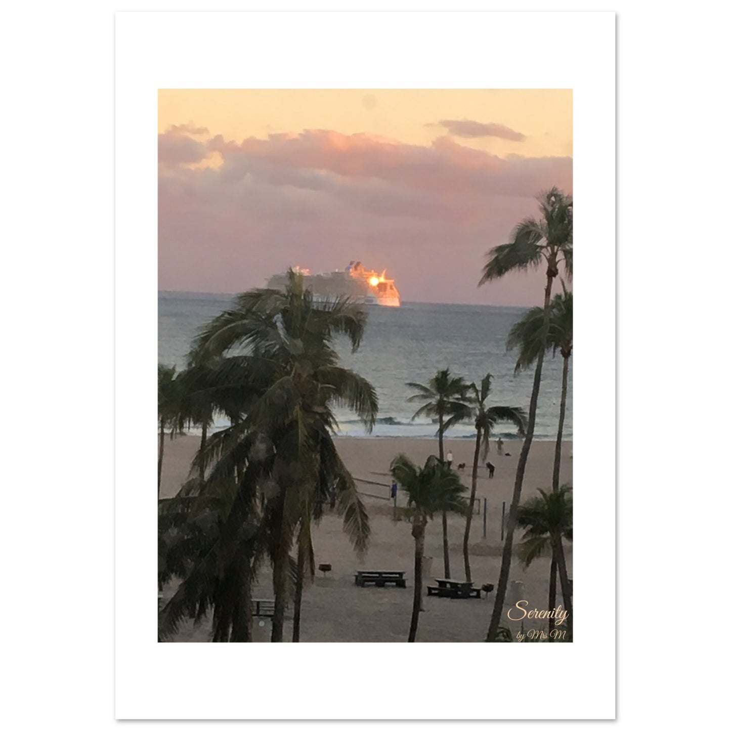 Bring the tranquil beauty of a tropical sunset right into your home with our "Coastal Serenity Sunset Cruise" poster. This art print captures the serene moment of a cruise ship gently passing on the horizon, bathed in the soft, warm hues of dusk. Lush palm trees frame a peaceful beach scene, inviting a feeling of calm and escape into your everyday space. It's the perfect accent to add a touch of vacation bliss and elegant color to any room.