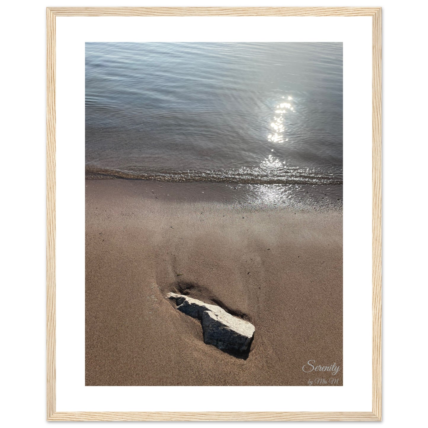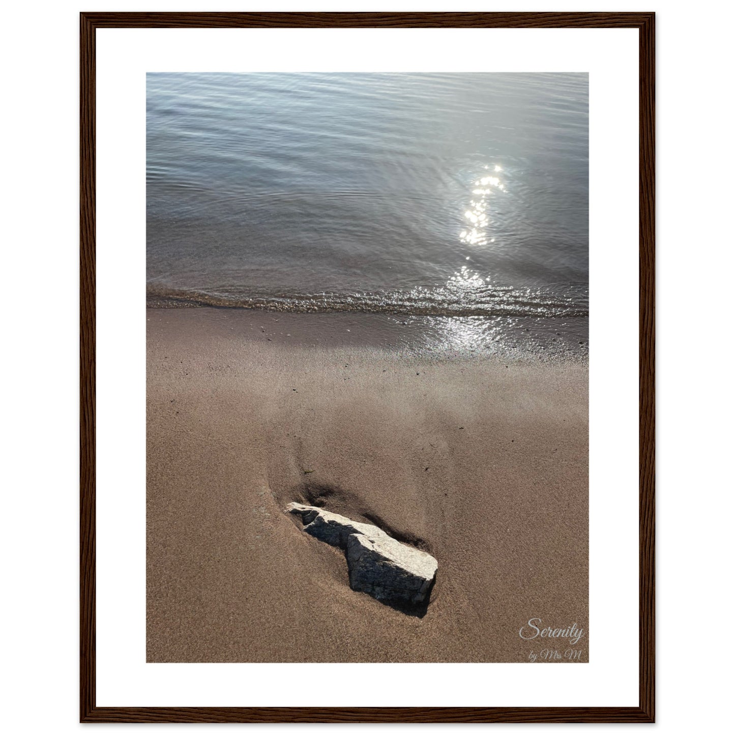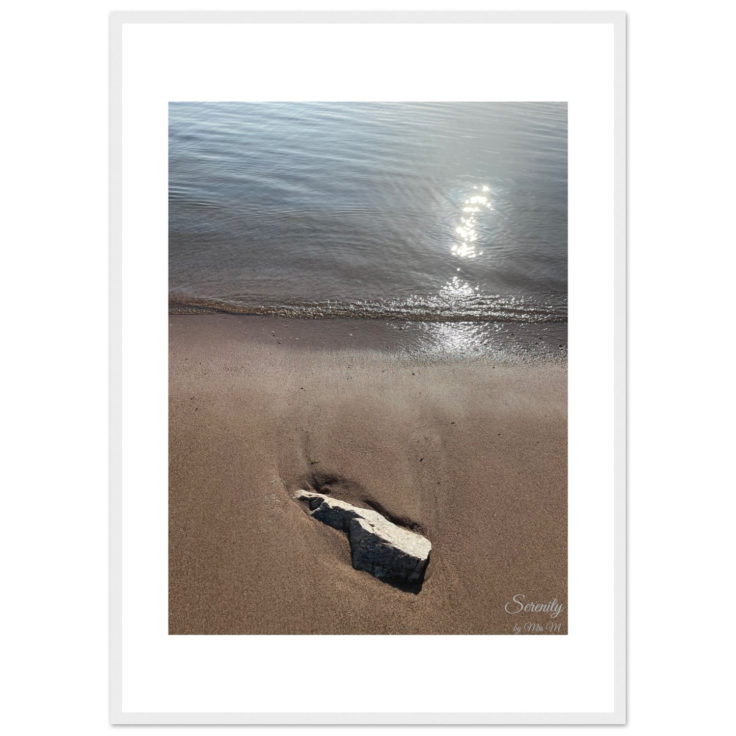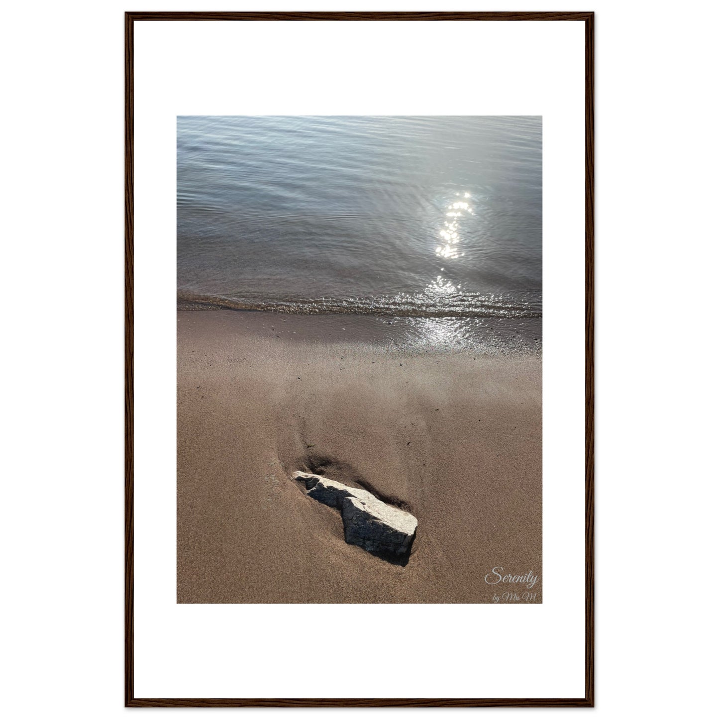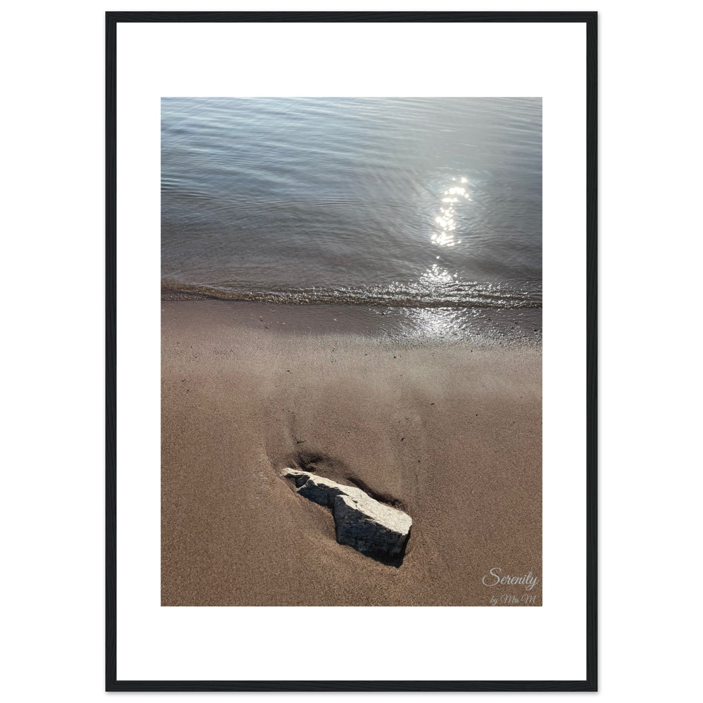 Bring the calm of the shoreline into your home with our "Coastal Serenity" framed poster. This captivating piece captures a moment of tranquil beauty: the gentle shimmer of sunlight on the water meeting the soft, warm tones of the sand, with a single resilient stone at peace on the beach. It’s an invitation to pause, breathe, and recall the quiet strength found in nature's embrace. Perfect for creating a serene focal point in any room or as a thoughtful gift for someone who cherishes the ocean's calming presence.
