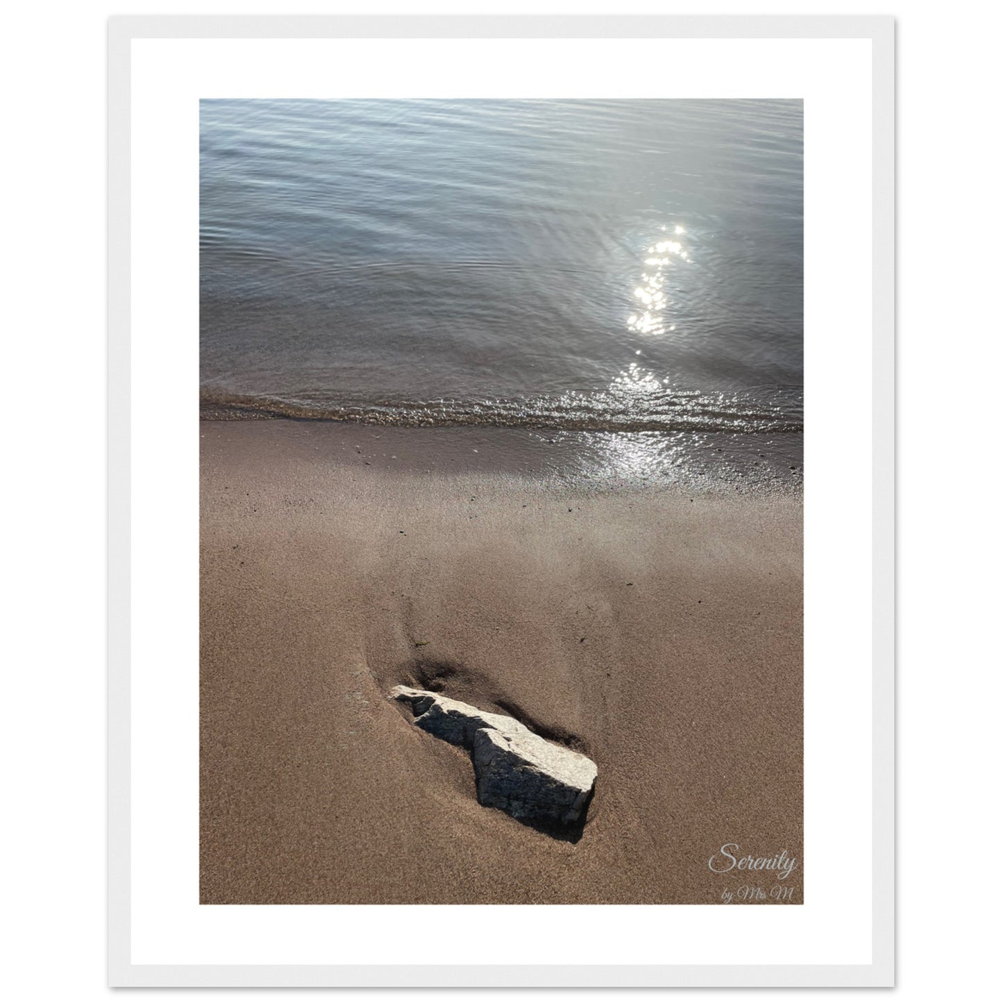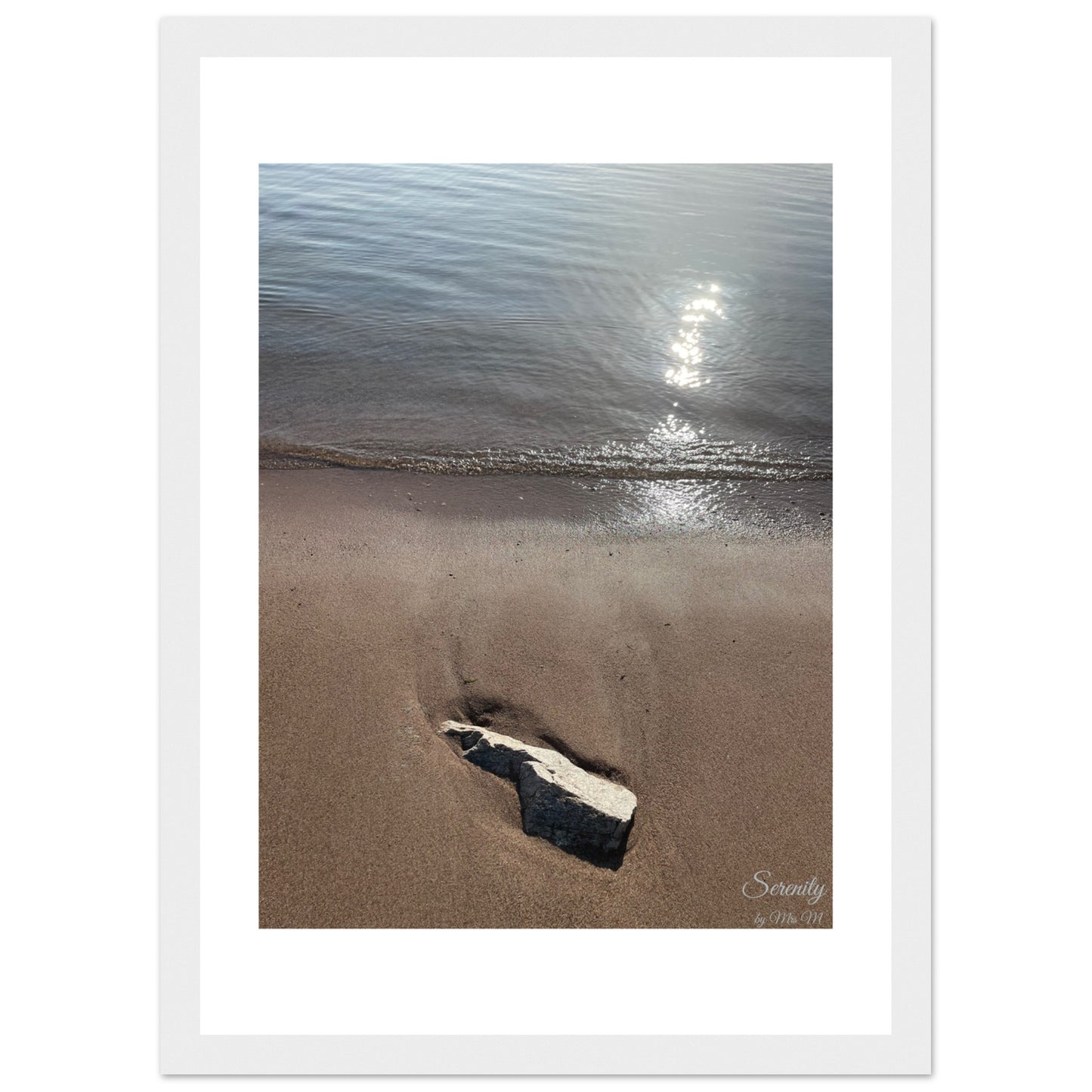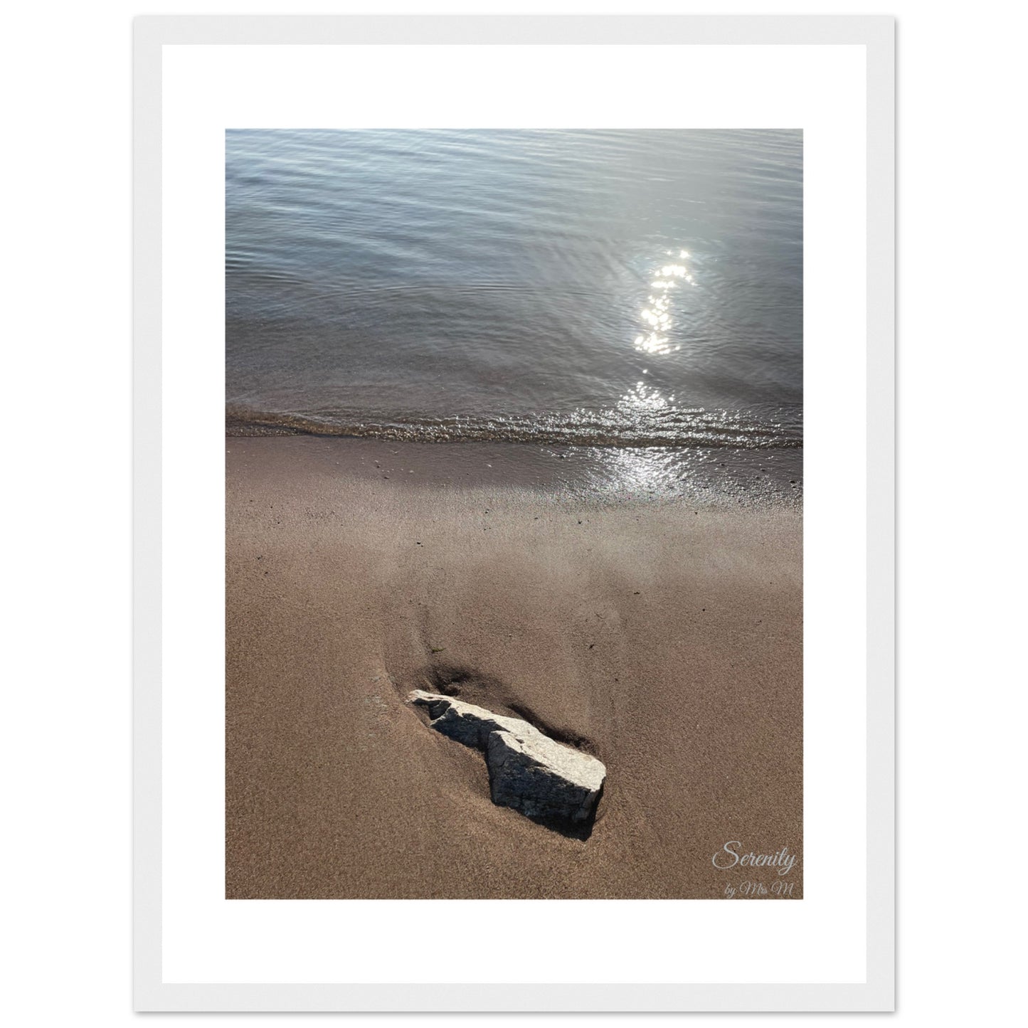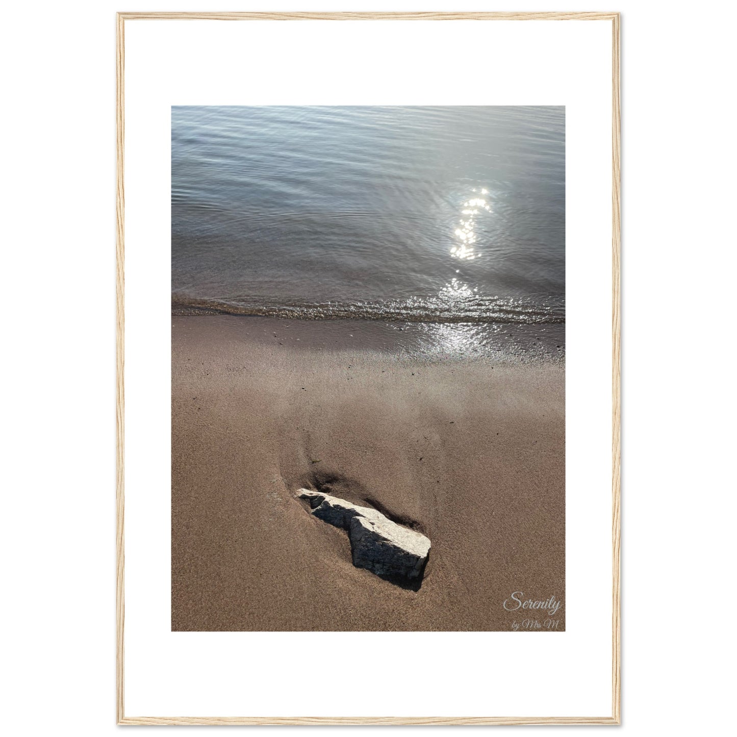 Bring the calm of the shoreline into your home with our "Coastal Serenity" framed poster. This captivating piece captures a moment of tranquil beauty: the gentle shimmer of sunlight on the water meeting the soft, warm tones of the sand, with a single resilient stone at peace on the beach. It’s an invitation to pause, breathe, and recall the quiet strength found in nature's embrace. Perfect for creating a serene focal point in any room or as a thoughtful gift for someone who cherishes the ocean's calming presence.