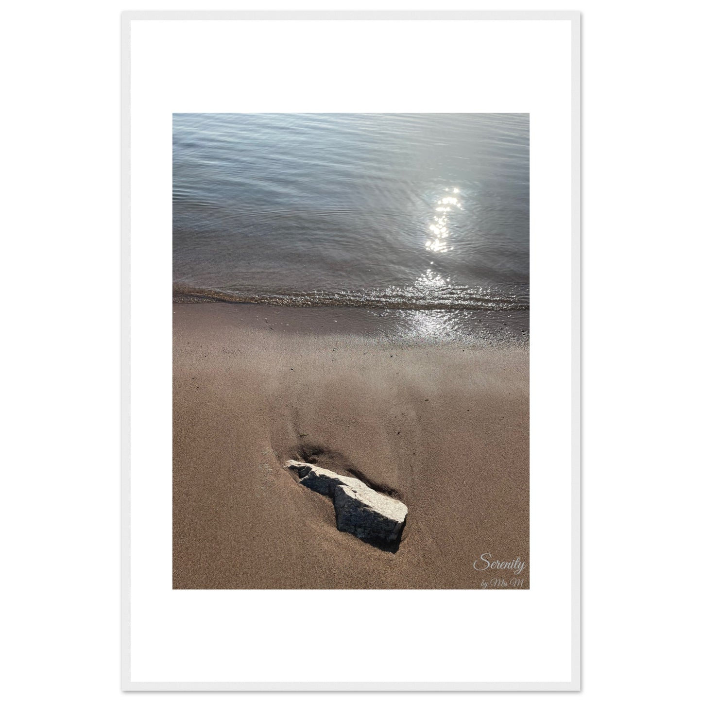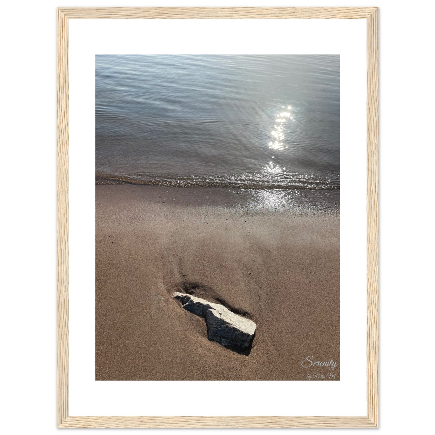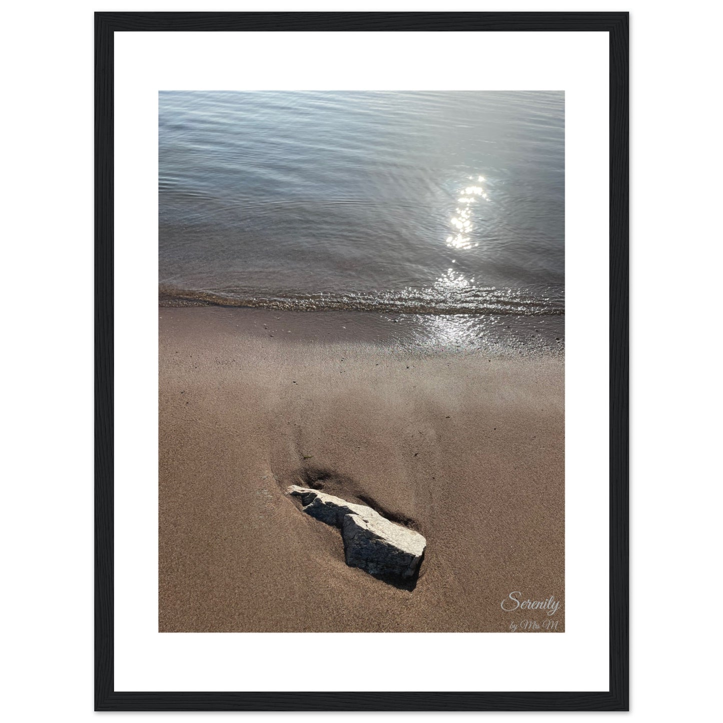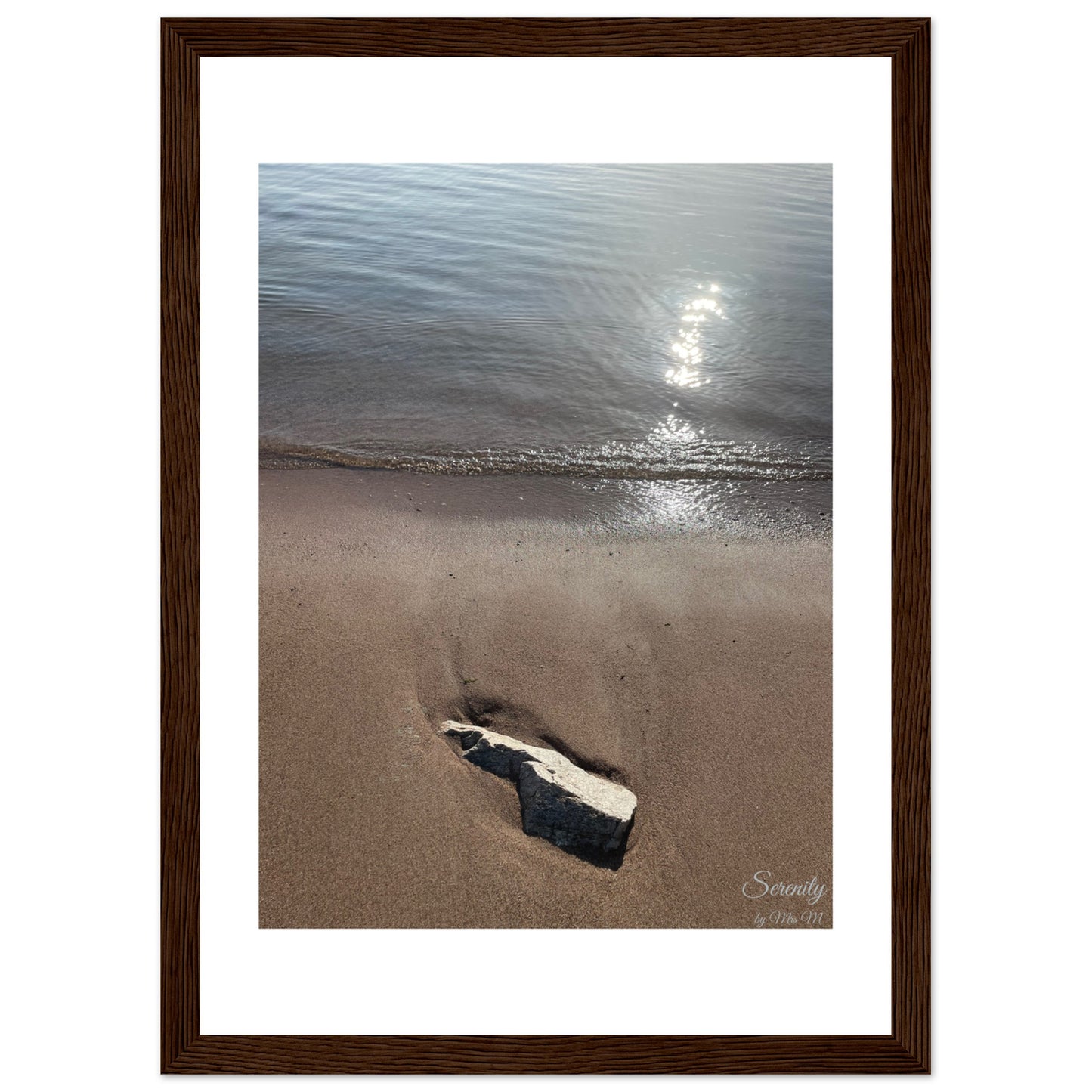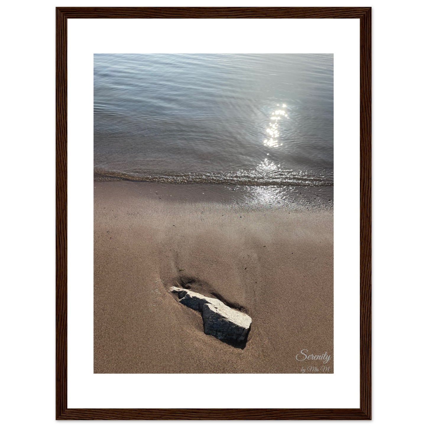 Bring the calm of the shoreline into your home with our "Coastal Serenity" framed poster. This captivating piece captures a moment of tranquil beauty: the gentle shimmer of sunlight on the water meeting the soft, warm tones of the sand, with a single resilient stone at peace on the beach. It’s an invitation to pause, breathe, and recall the quiet strength found in nature's embrace. Perfect for creating a serene focal point in any room or as a thoughtful gift for someone who cherishes the ocean's calming presence.