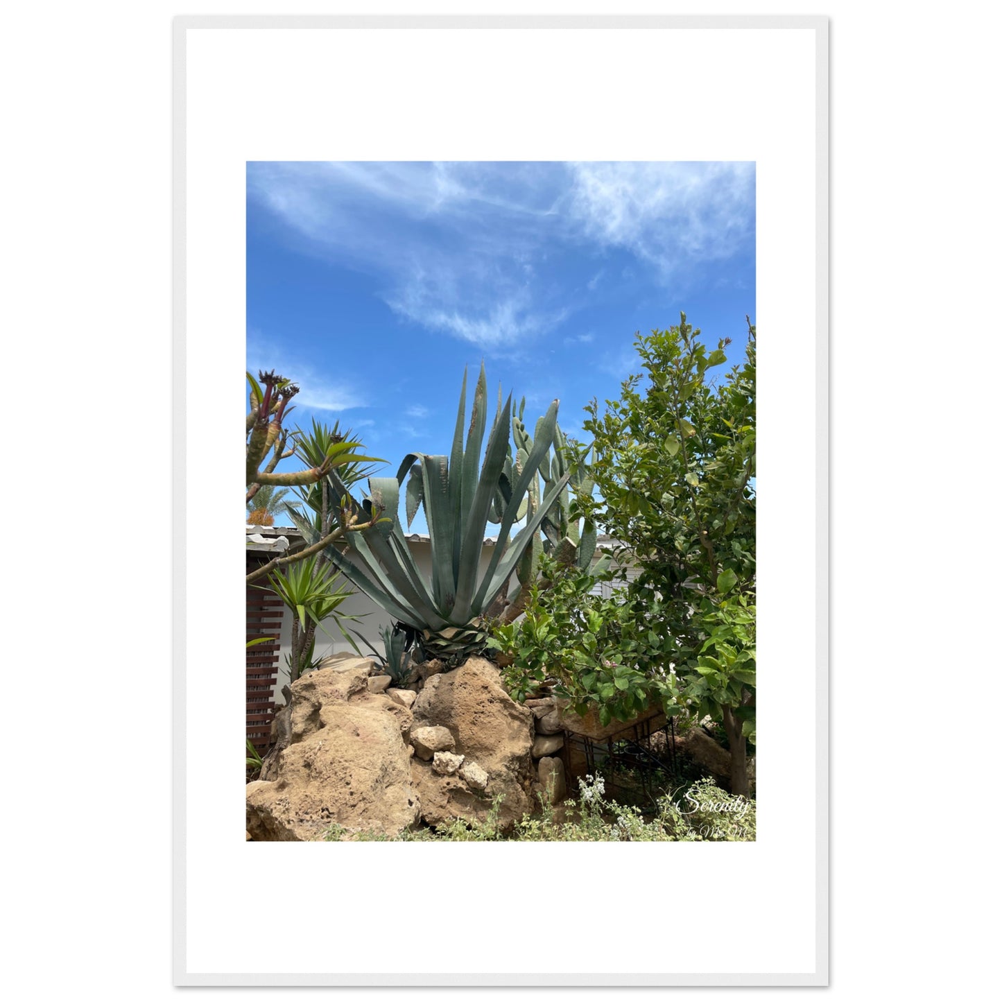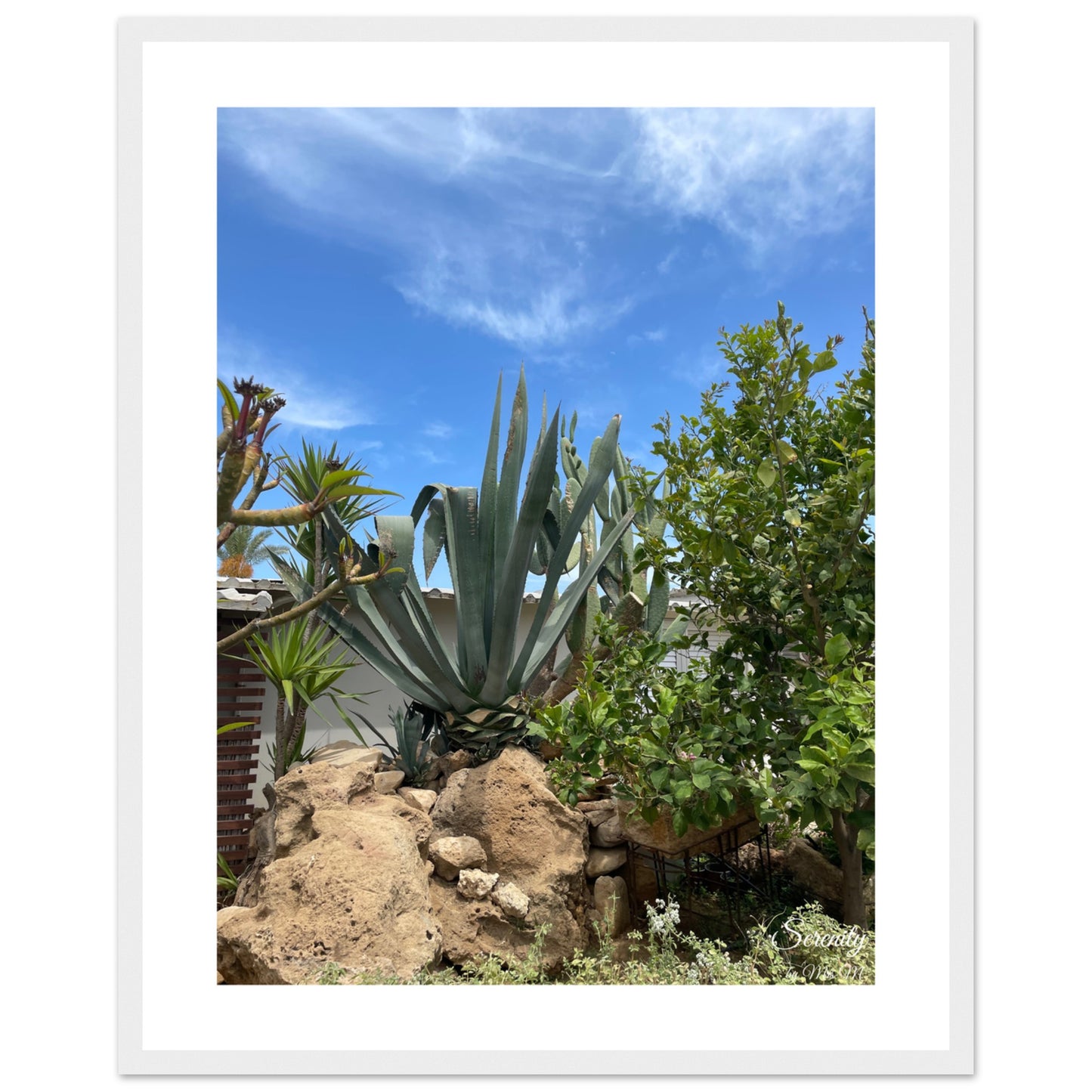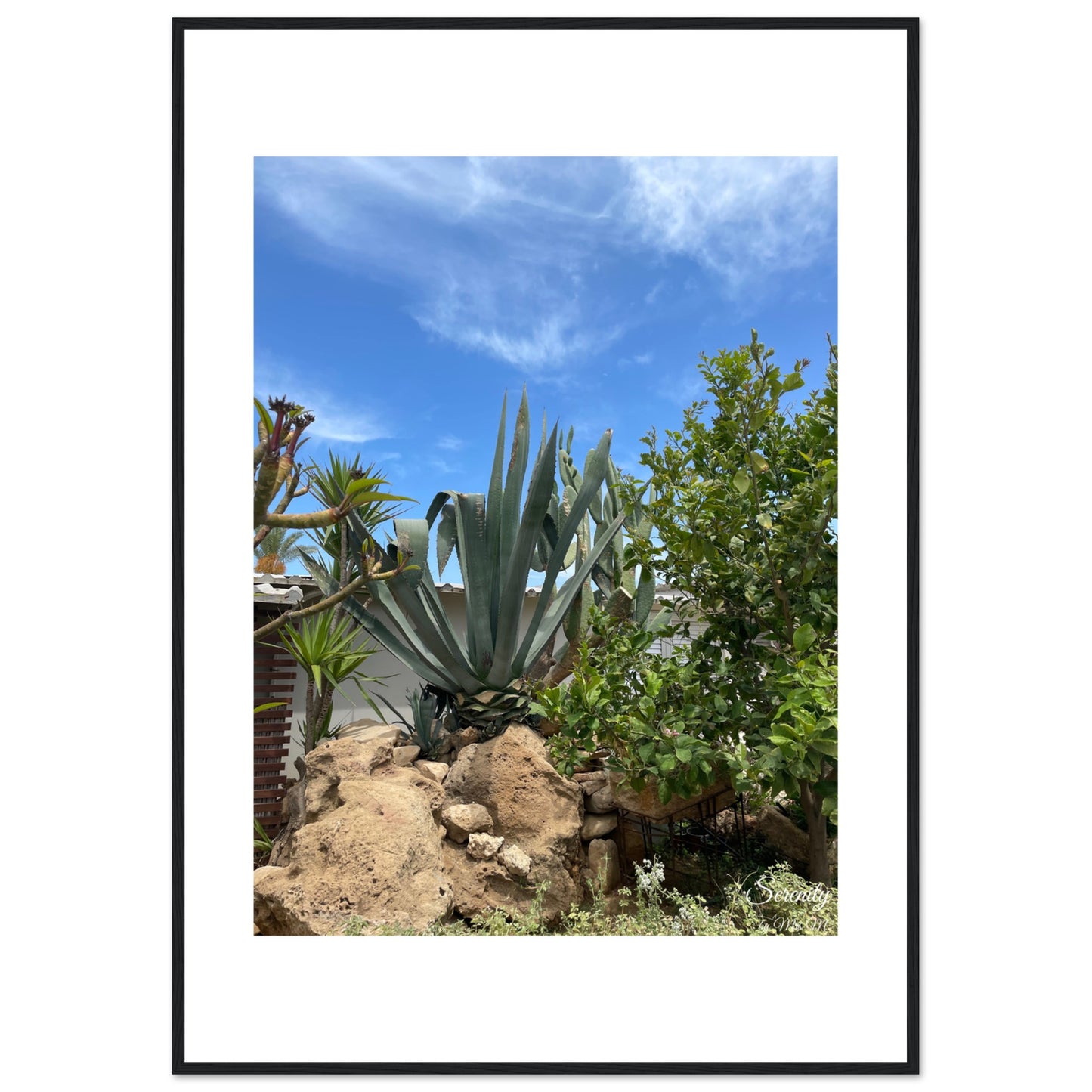 Bring the tranquil beauty of a sun-drenched desert garden into your home with this captivating Agave landscape framed poster. The vibrant blue sky contrasts beautifully with the lush greens of the agave and surrounding flora, evoking a sense of calm and natural splendor. It's an ideal piece to add a touch of serene escape and organic elegance to any room.