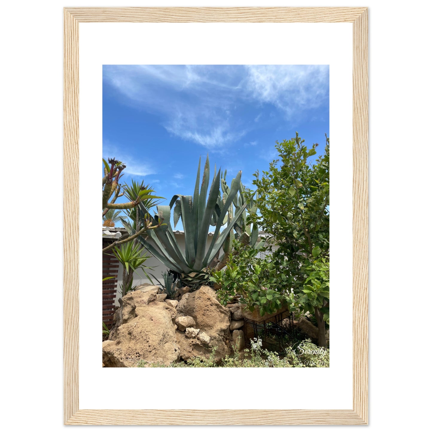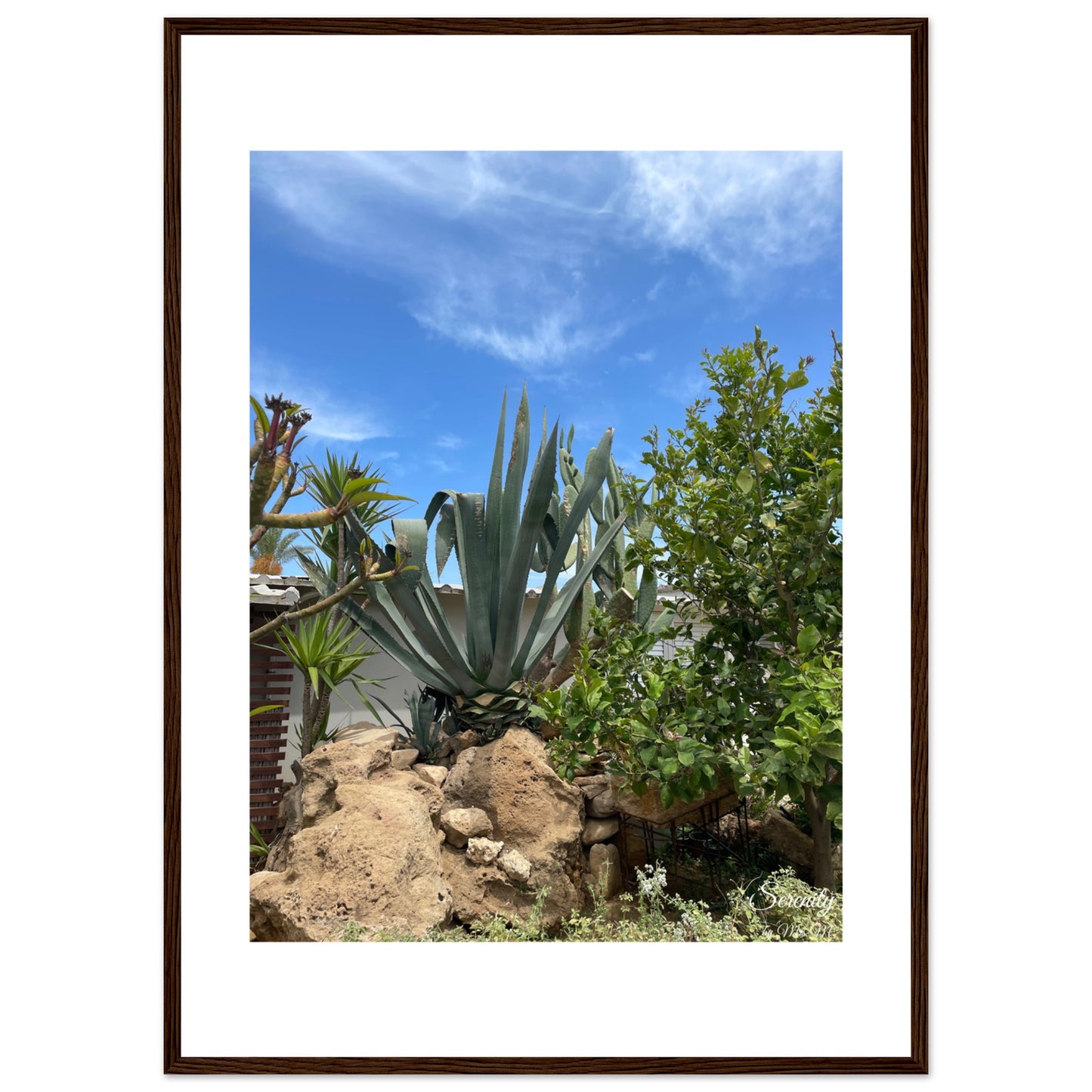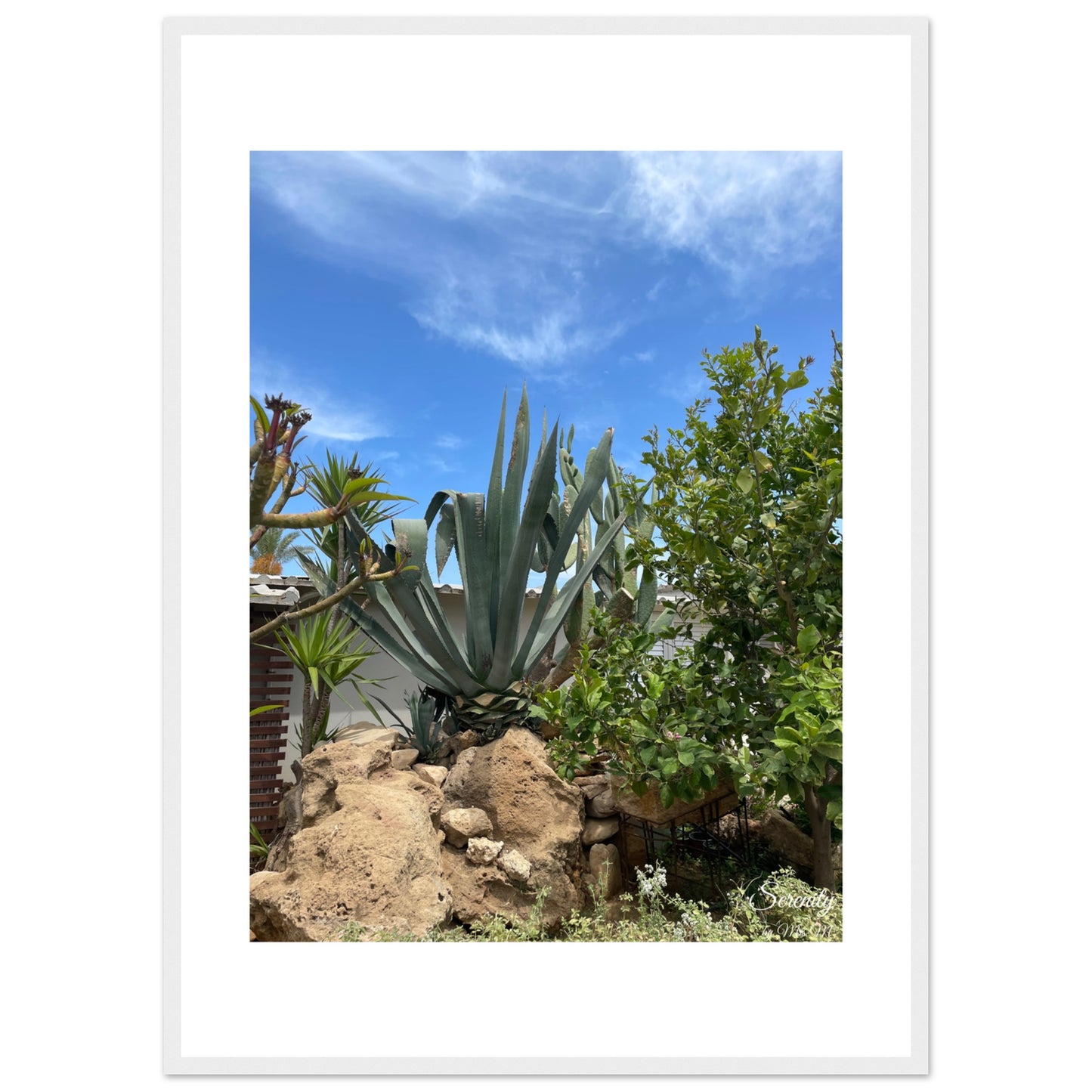 Bring the tranquil beauty of a sun-drenched desert garden into your home with this captivating Agave landscape framed poster. The vibrant blue sky contrasts beautifully with the lush greens of the agave and surrounding flora, evoking a sense of calm and natural splendor. It's an ideal piece to add a touch of serene escape and organic elegance to any room.