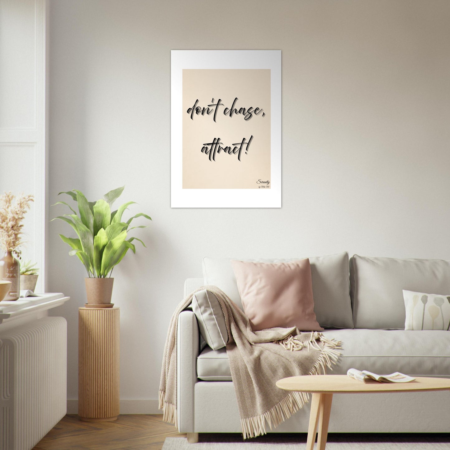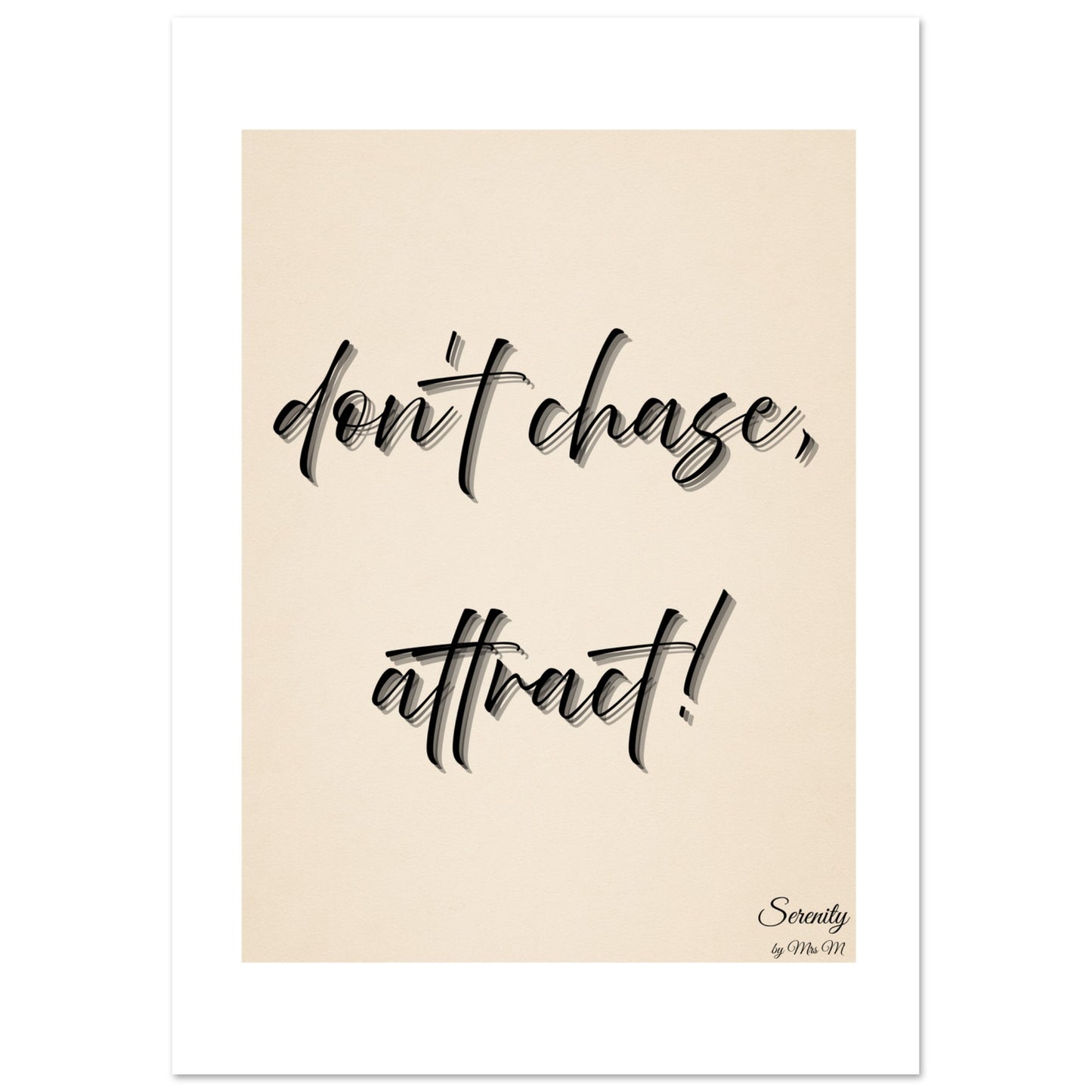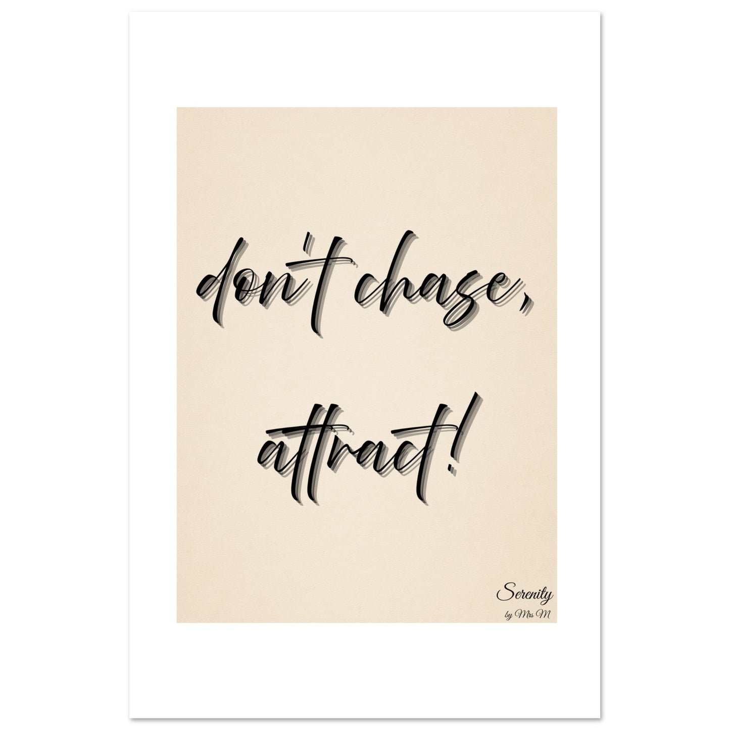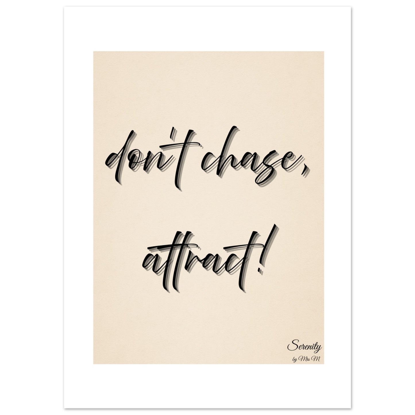 Elevate your space with a powerful message of empowerment. This "don't chase, attract!" poster, designed with elegant script and a serene beige backdrop by Serenity by Mrs M, serves as a daily reminder to embrace your inner strength and manifest your desires. Its timeless design and subtle depth make it a perfect addition to any room, inspiring calm and focus.