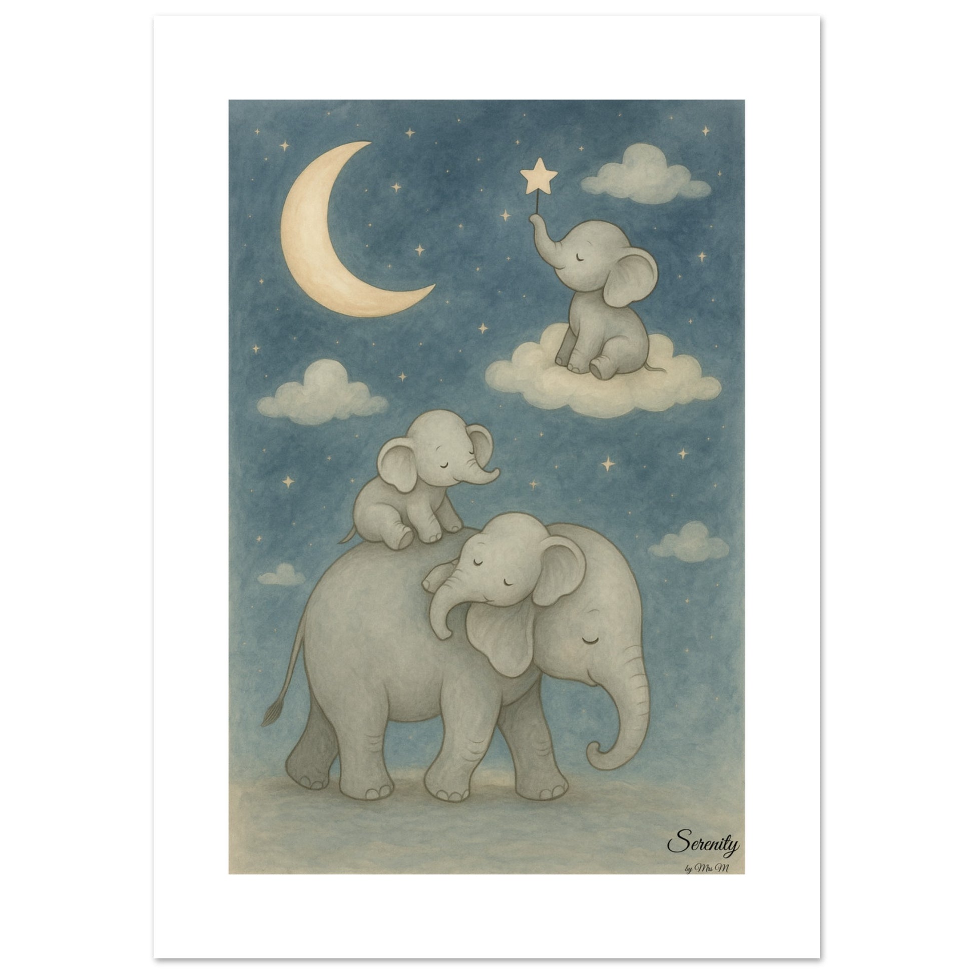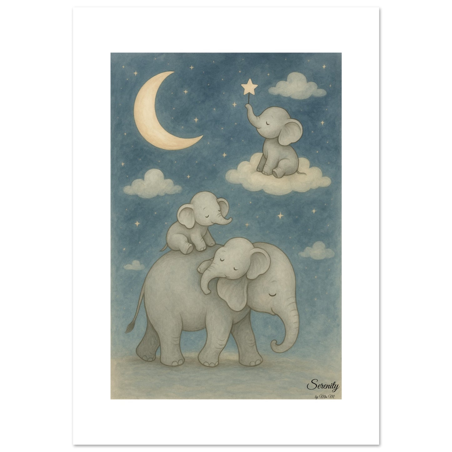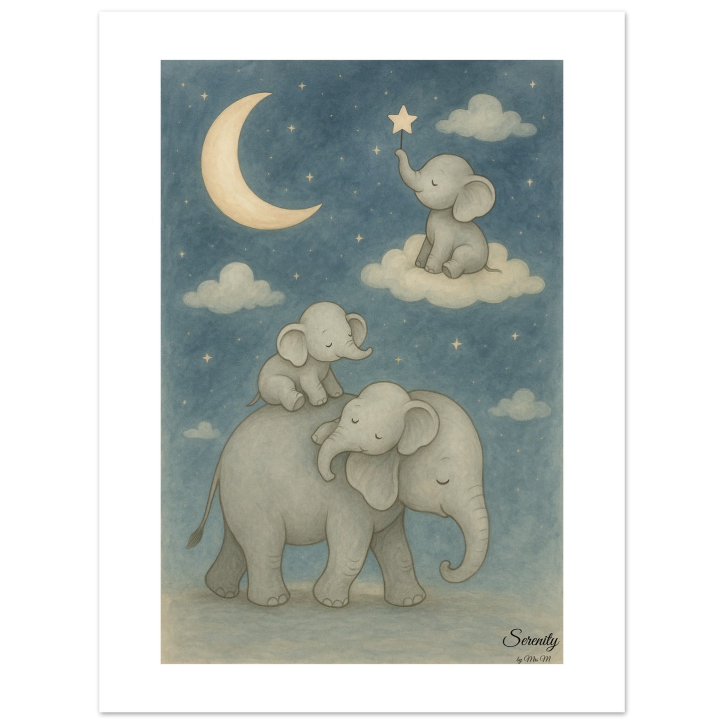 Invite a sense of calm and wonder into any space with our enchanting 'Dreamy Elephant Family & Star' poster. Featuring an adorable elephant family nestled under a moonlit, star-dusted sky, this artwork, titled 'Serenity by Mrs. M', evokes a heartwarming feeling of peace and gentle dreams. The soft watercolor palette of muted blues, grays, and creams creates a soothing atmosphere, perfect for a nursery, child's room, or any area where tranquility is cherished.
