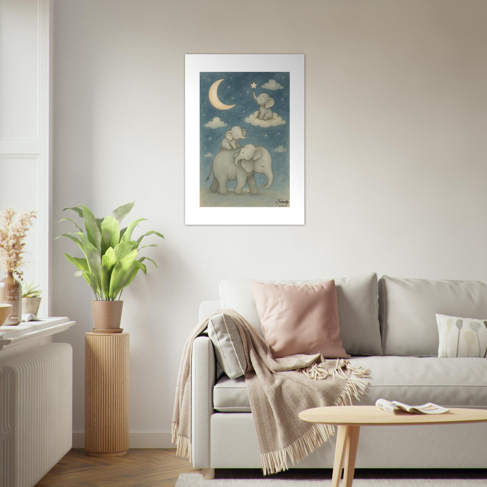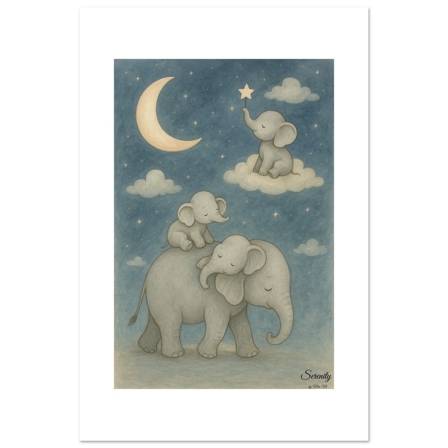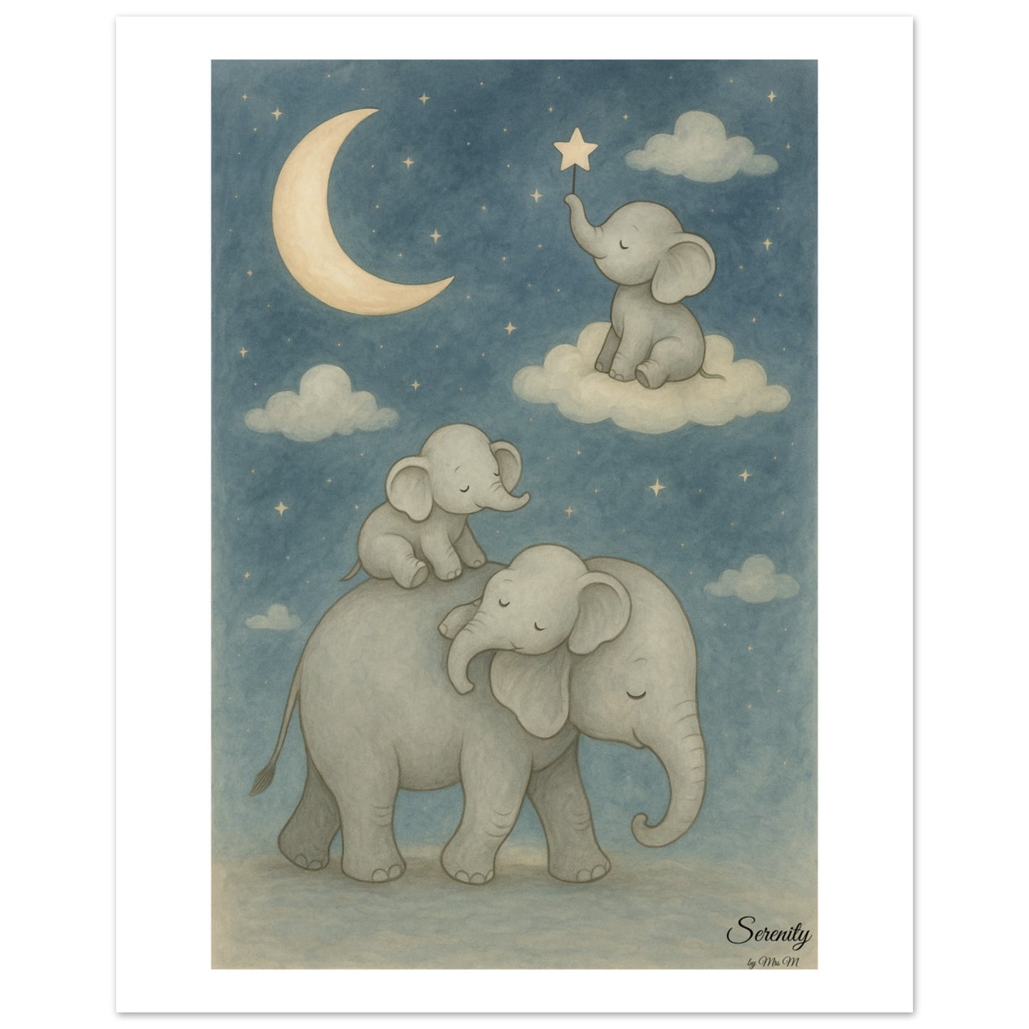 Invite a sense of calm and wonder into any space with our enchanting 'Dreamy Elephant Family & Star' poster. Featuring an adorable elephant family nestled under a moonlit, star-dusted sky, this artwork, titled 'Serenity by Mrs. M', evokes a heartwarming feeling of peace and gentle dreams. The soft watercolor palette of muted blues, grays, and creams creates a soothing atmosphere, perfect for a nursery, child's room, or any area where tranquility is cherished.