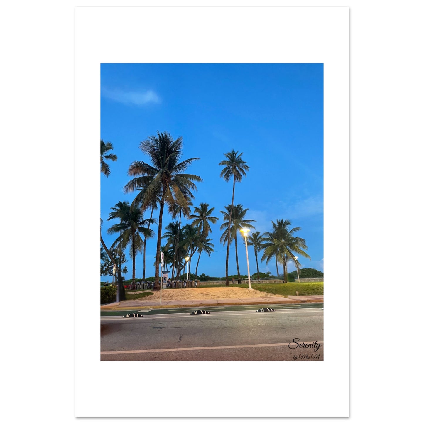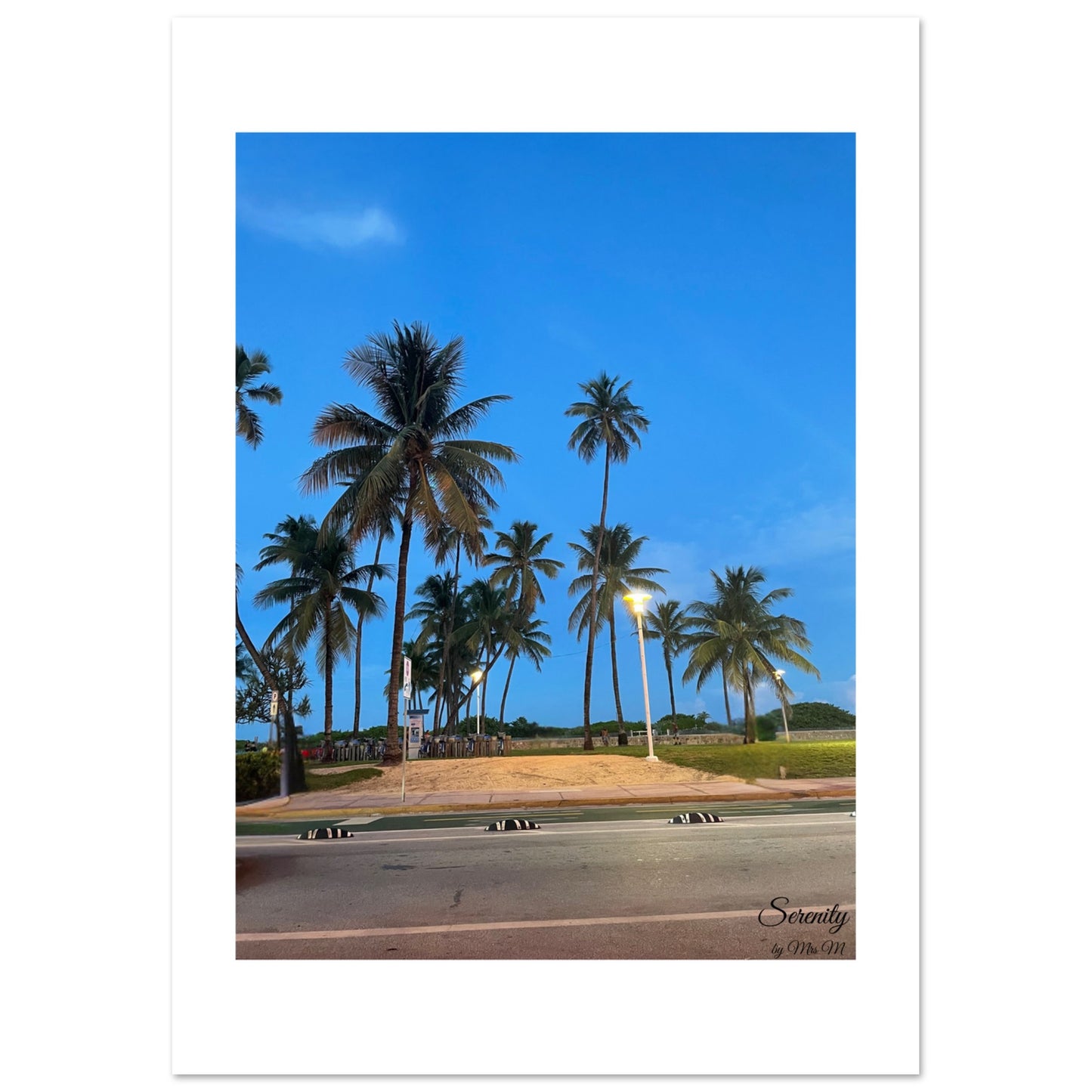 Transport yourself to a tranquil tropical evening with our 'Evening Palm Paradise' poster. The deep blues of twilight meet the silhouette of majestic palm trees, illuminated softly by distant lights, creating an atmosphere of serene escape. This stunning print captures the peaceful essence of a coastal sunset, perfect for adding a touch of calm sophistication and natural beauty to any room in your home or office.