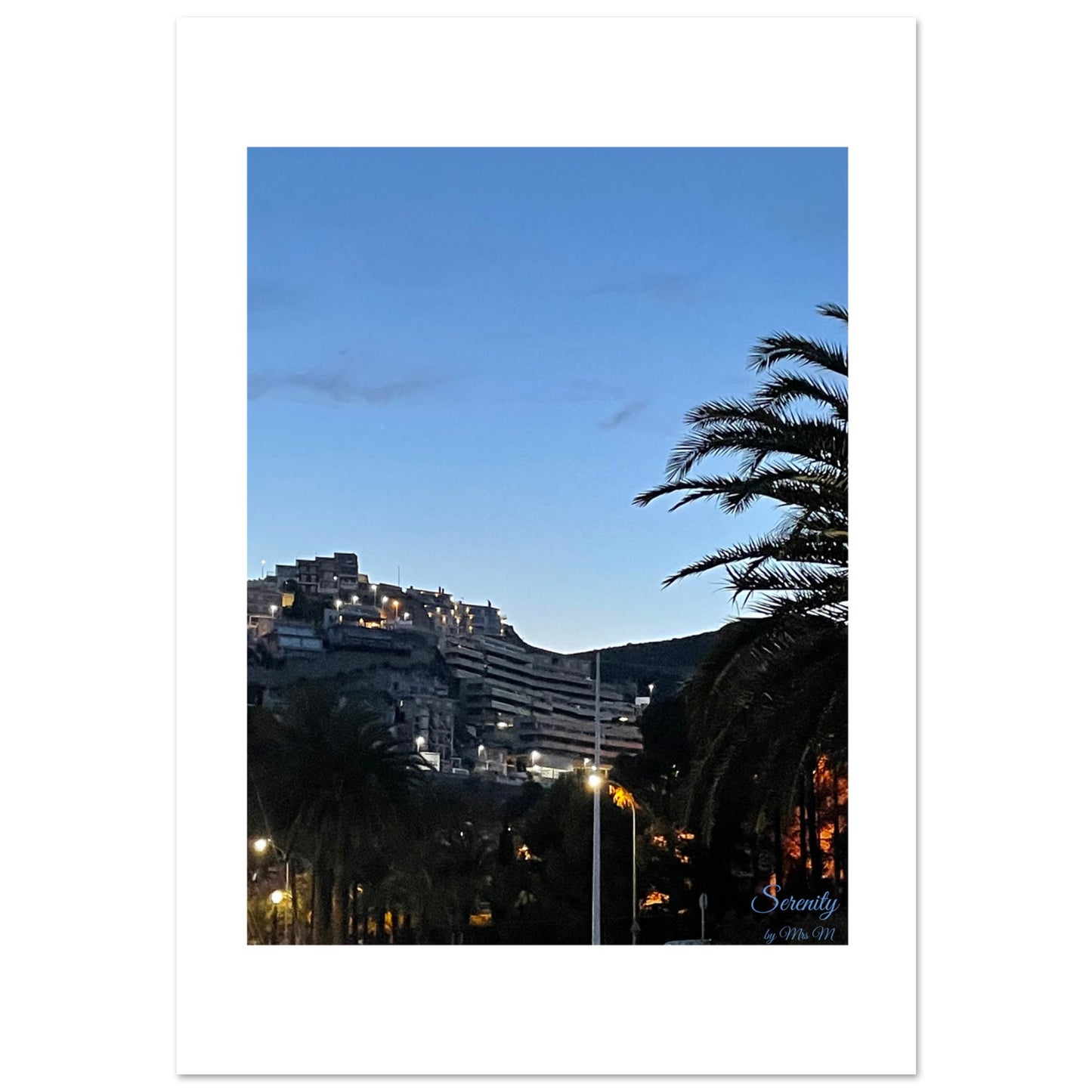 Bring the peaceful tranquility of a twilight hillside view into your home with our "Evening Serenity" poster. This captivating print captures the magical moment when day transitions to night, with warm lights dotting the distant hillside under a serene blue sky. The calming atmosphere and subtle glow make it a perfect addition to any space seeking a touch of peaceful elegance.