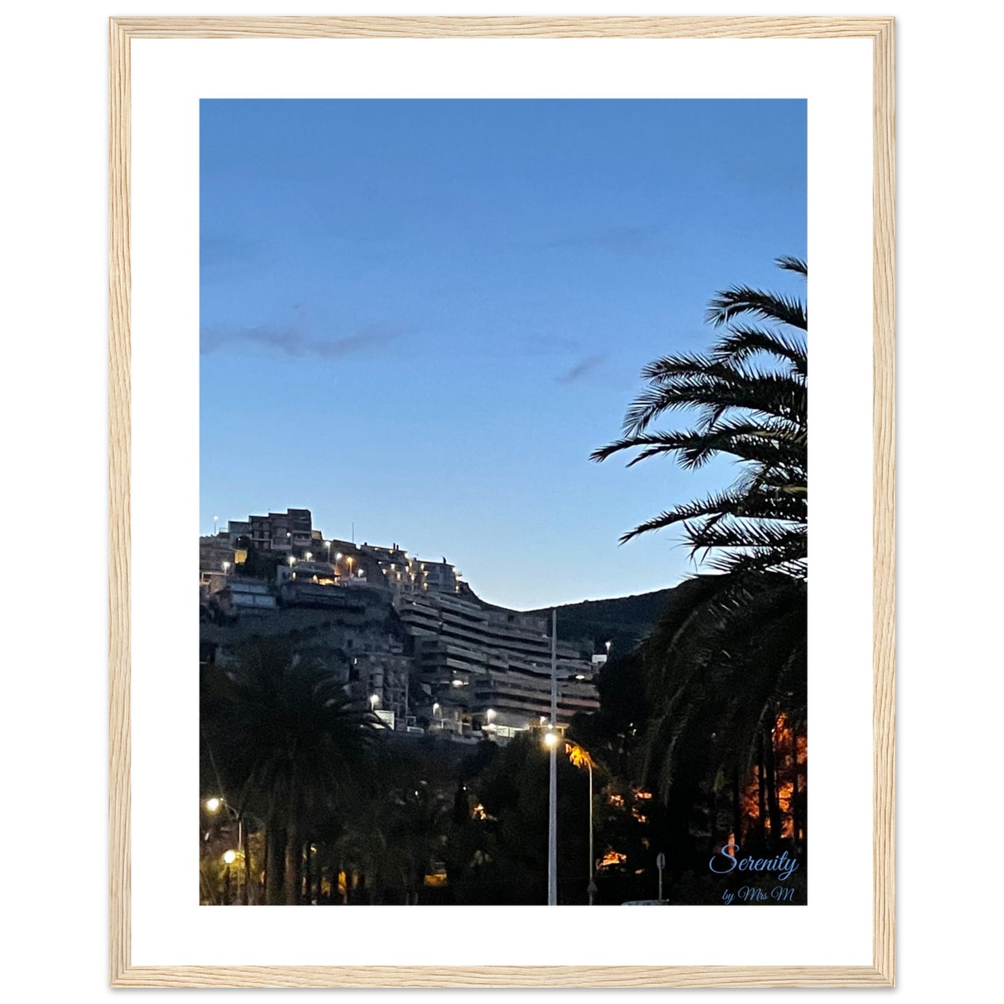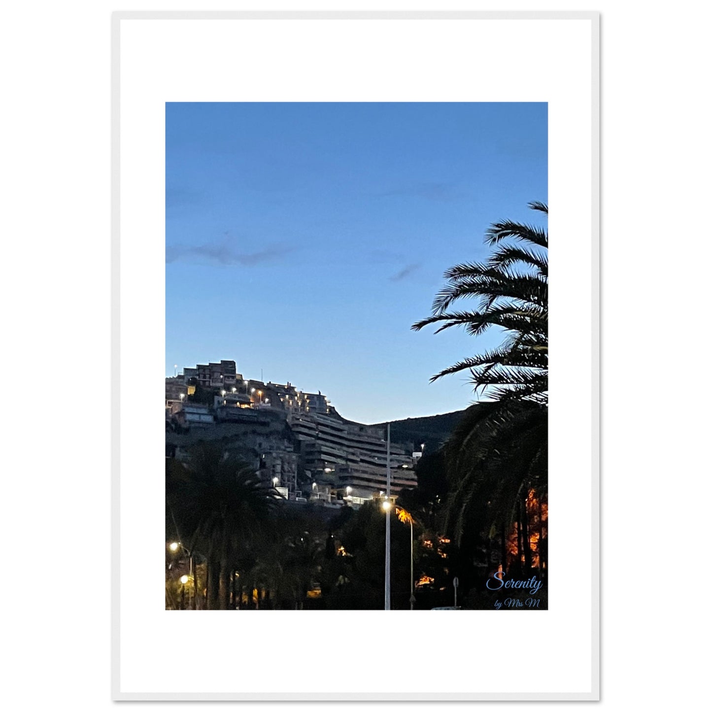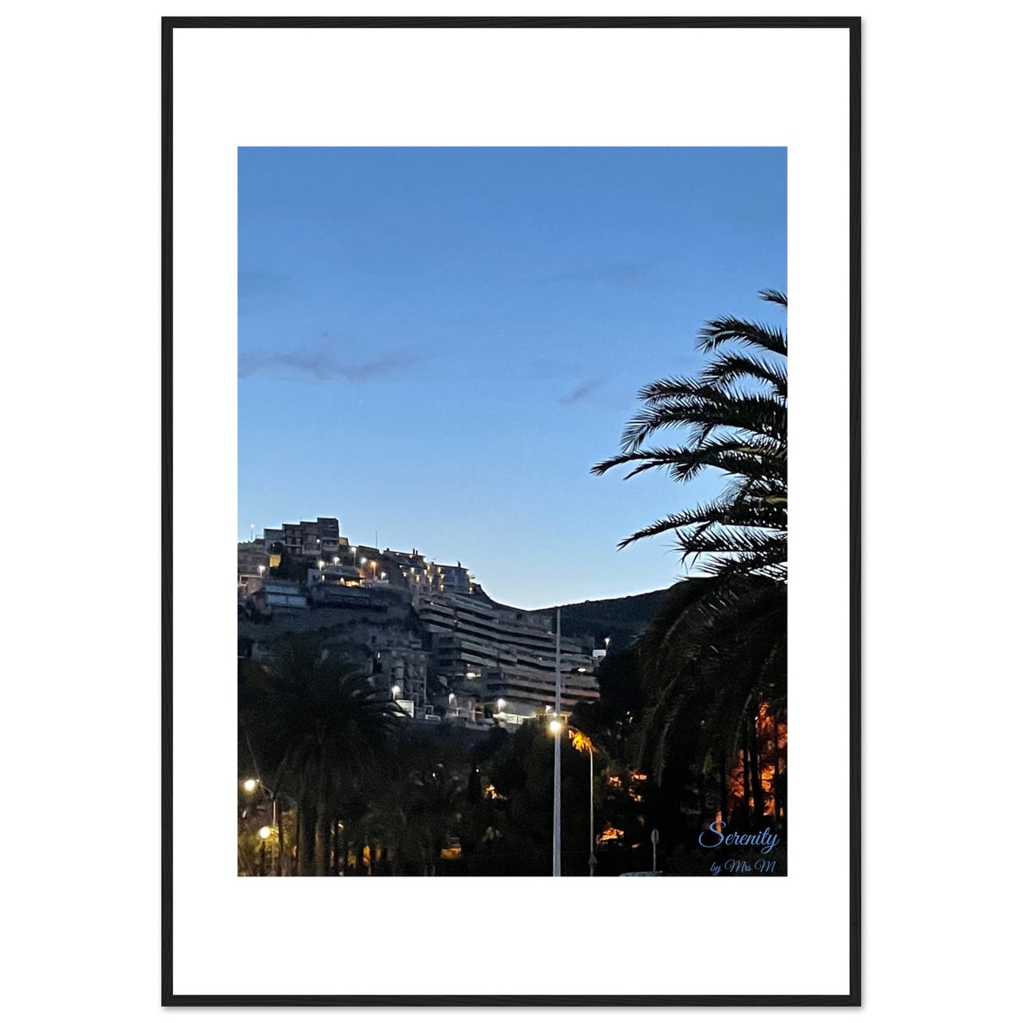 Capture the tranquil beauty of an evening seascape with our 'Evening Serenity' framed poster. This stunning print transports you to a peaceful coastal town, where the warm glow of lights dots a hillside against the serene backdrop of a twilight sky and silhouetted palm trees. It’s the perfect piece to bring a calming, sophisticated ambiance to any room, inviting moments of quiet reflection.