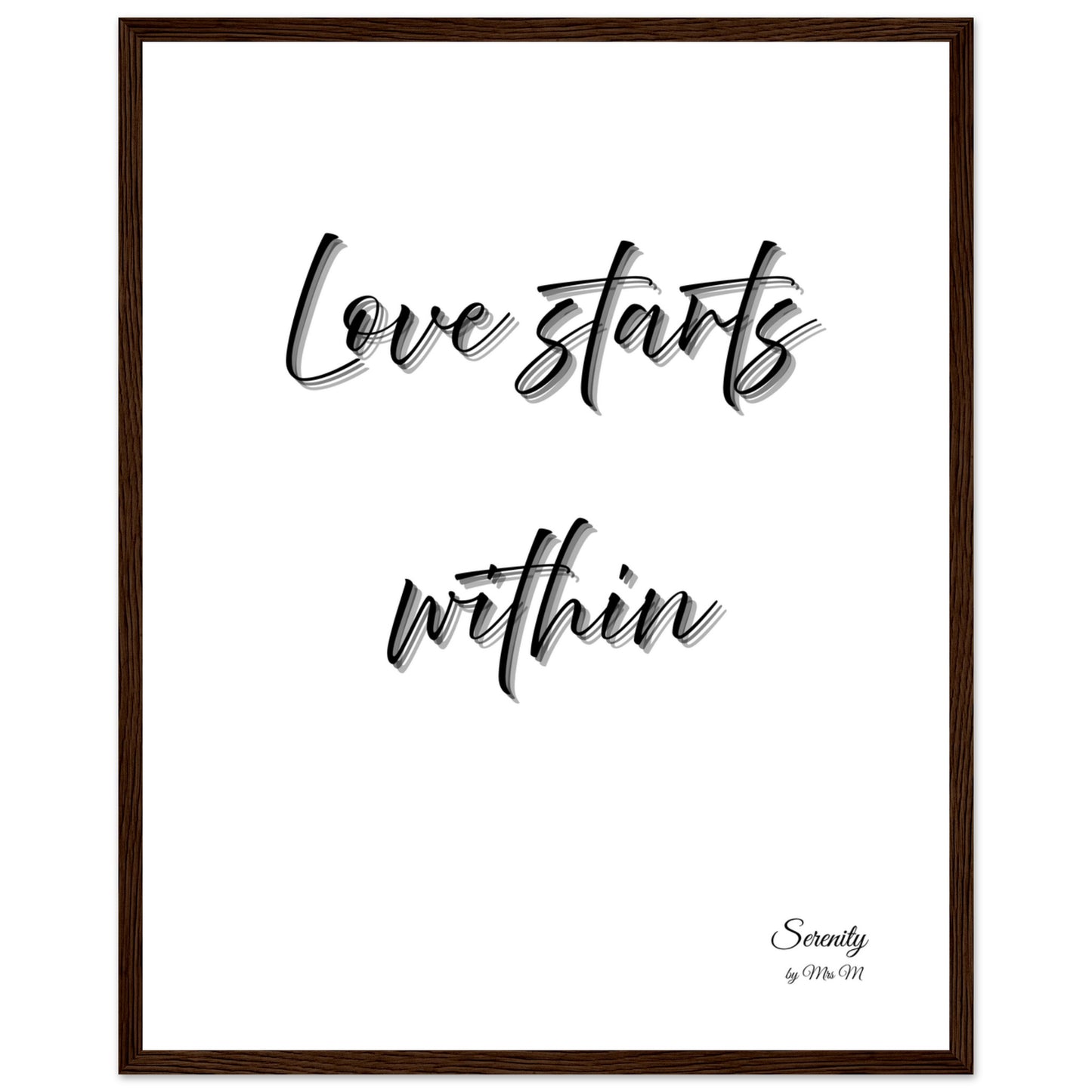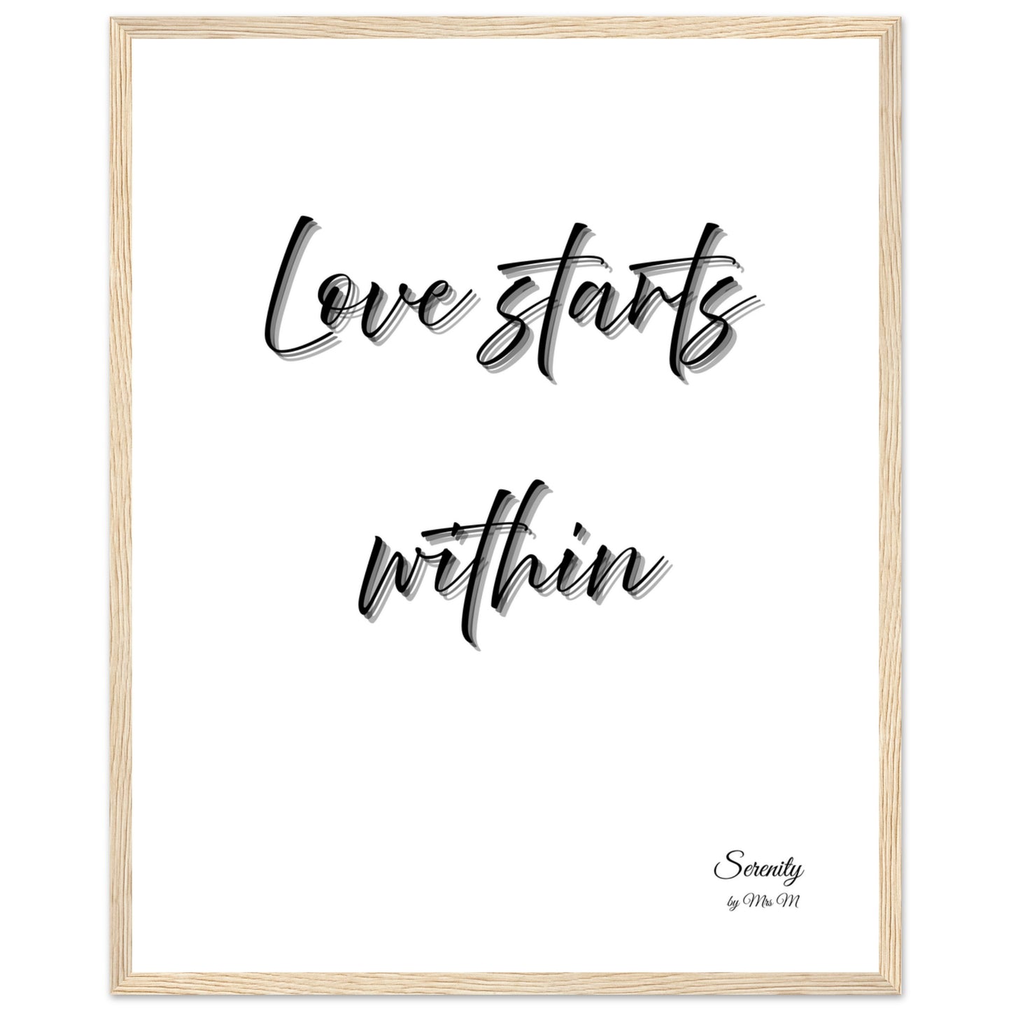 Embrace a message of self-love and inner peace with our “love starts within” framed poster. Featuring a graceful script with a subtle shadow effect against a crisp white background, this piece from the 'Serenity by Mrs M' collection offers a touch of timeless elegance and profound meaning to any space. It's an ideal addition to a tranquil bedroom, a calming meditation corner, or a minimalist living area, serving as a beautiful daily reminder of what truly matters.