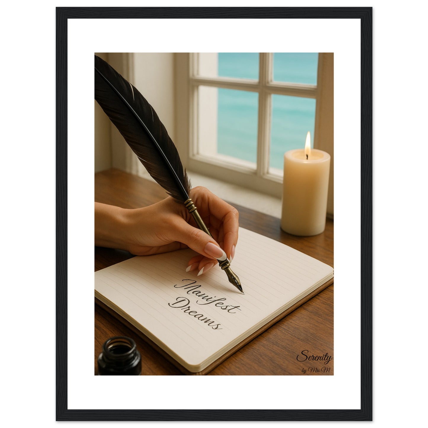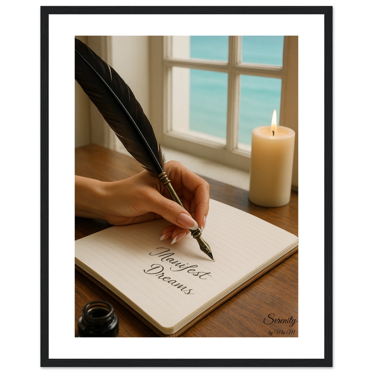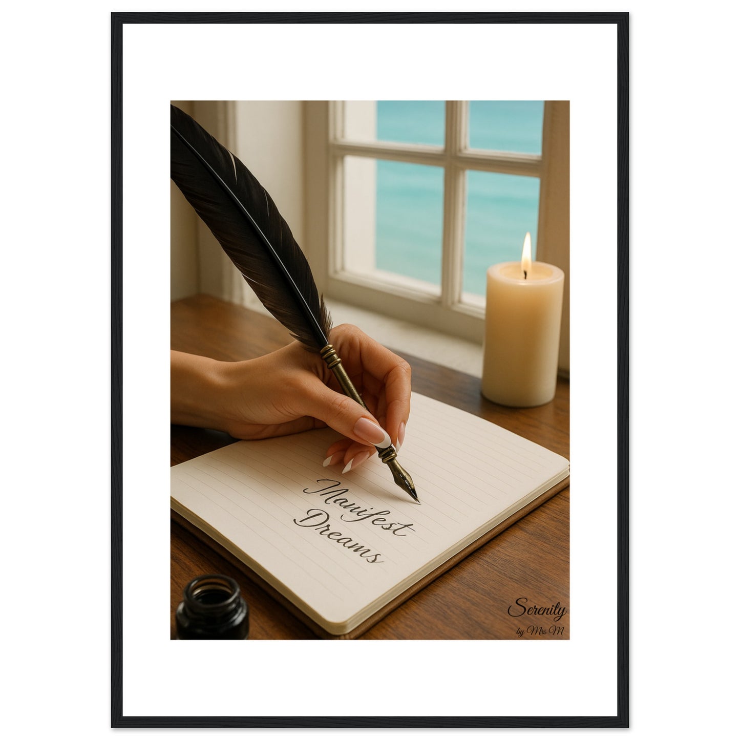 Embrace the tranquil inspiration of "Manifest Dreams" with this elegant framed poster, perfect for igniting creativity and calm in any space. Featuring a graceful hand holding a feather quill, poised over a notebook, against a serene backdrop of a sunlit window and turquoise horizon, this piece is a beautiful reminder to pursue your aspirations with intention and peace. The soft candlelight adds a touch of warmth and introspection, making it an ideal addition to your home office, bedroom, or meditation corner.