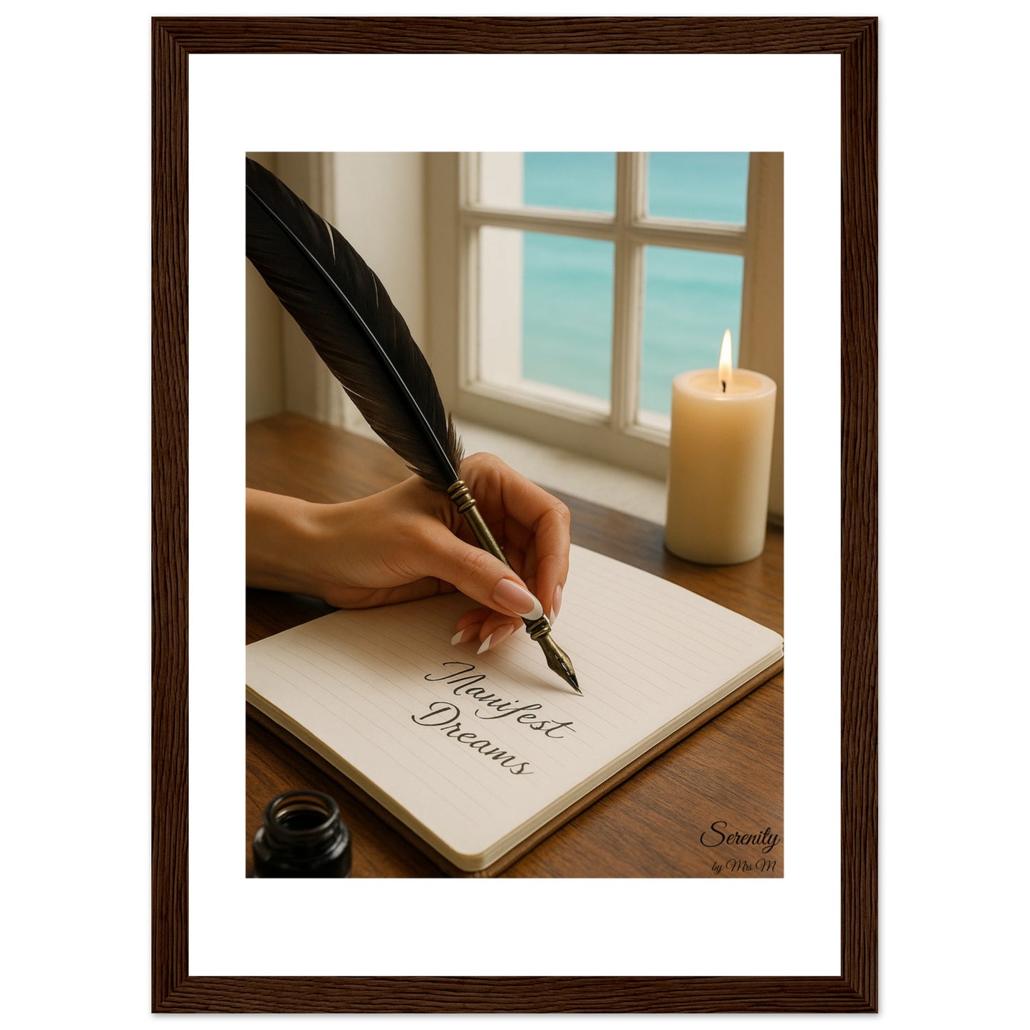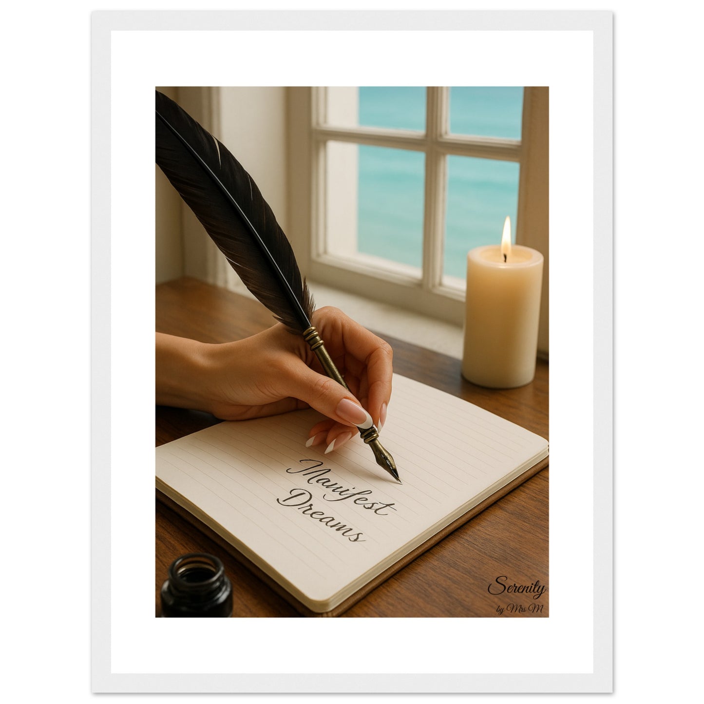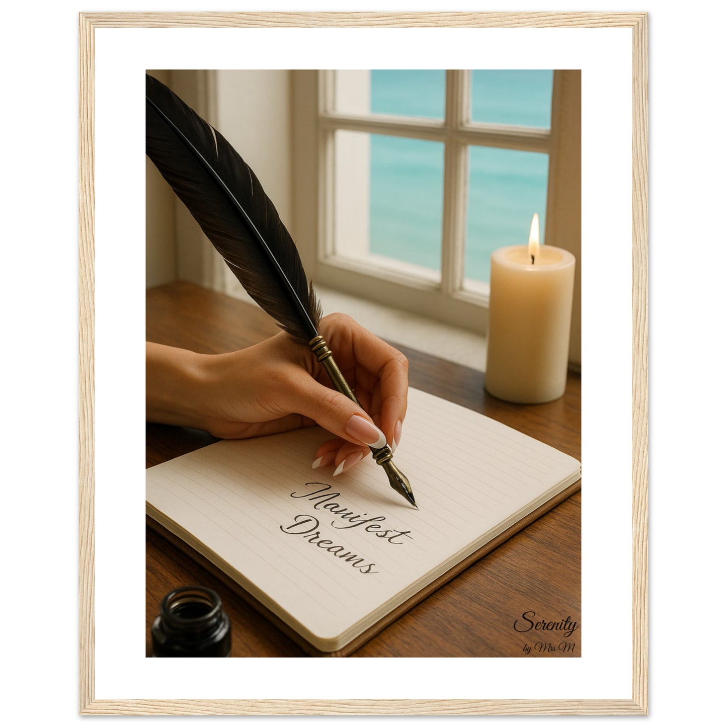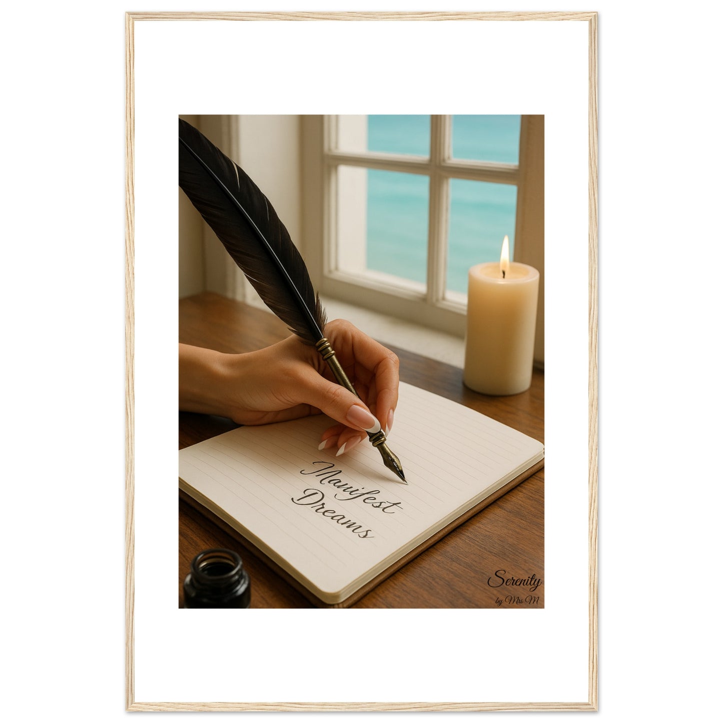 Embrace the tranquil inspiration of "Manifest Dreams" with this elegant framed poster, perfect for igniting creativity and calm in any space. Featuring a graceful hand holding a feather quill, poised over a notebook, against a serene backdrop of a sunlit window and turquoise horizon, this piece is a beautiful reminder to pursue your aspirations with intention and peace. The soft candlelight adds a touch of warmth and introspection, making it an ideal addition to your home office, bedroom, or meditation corner.