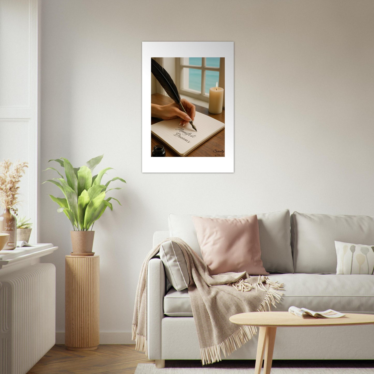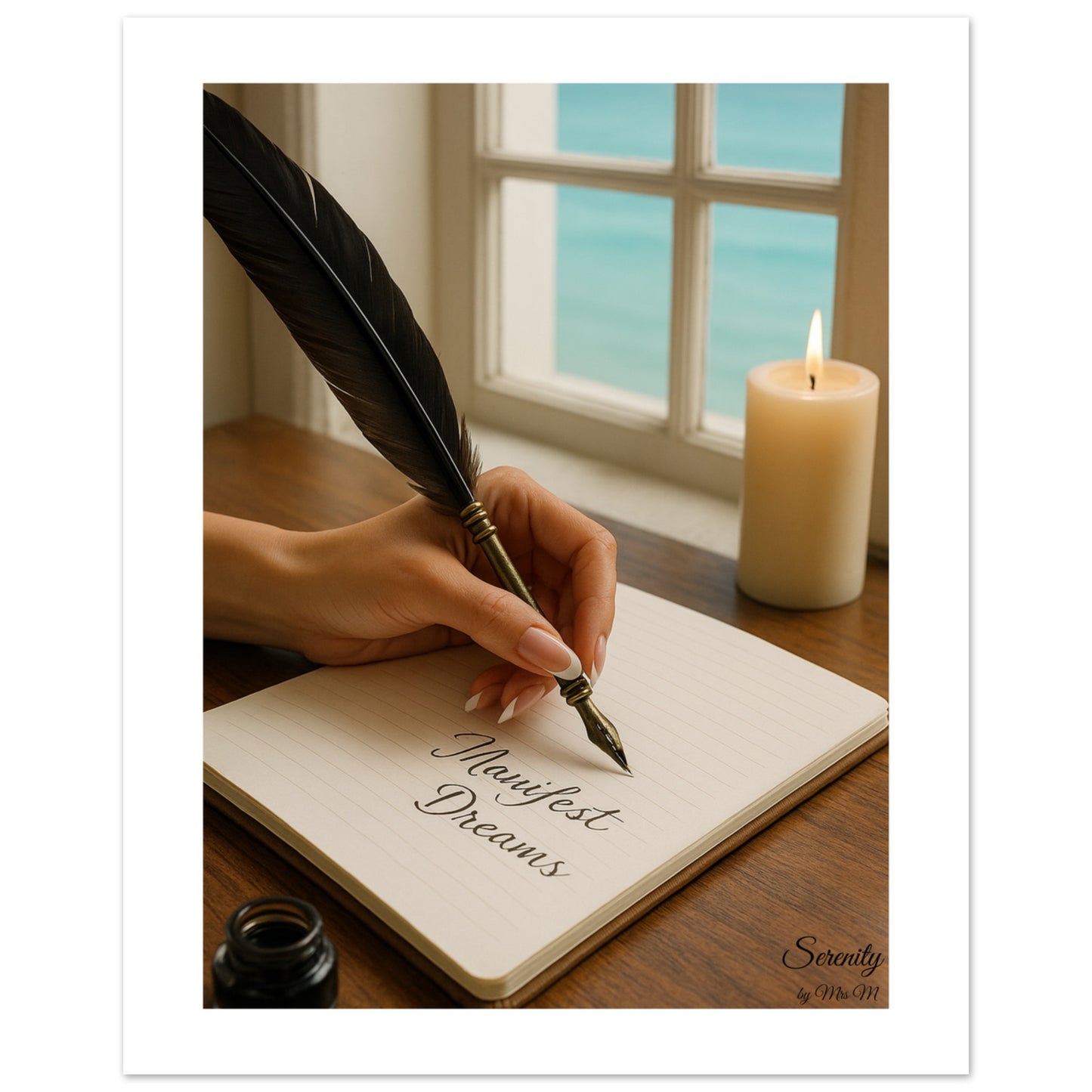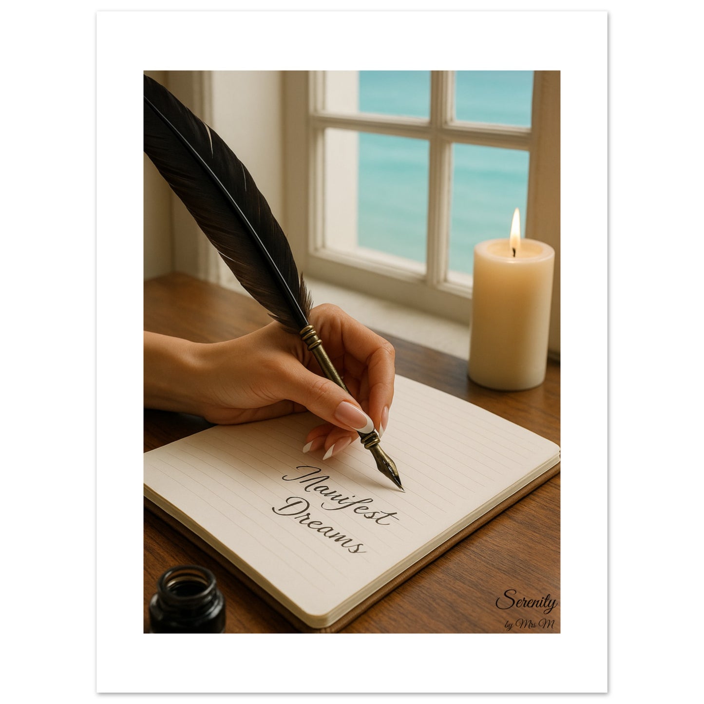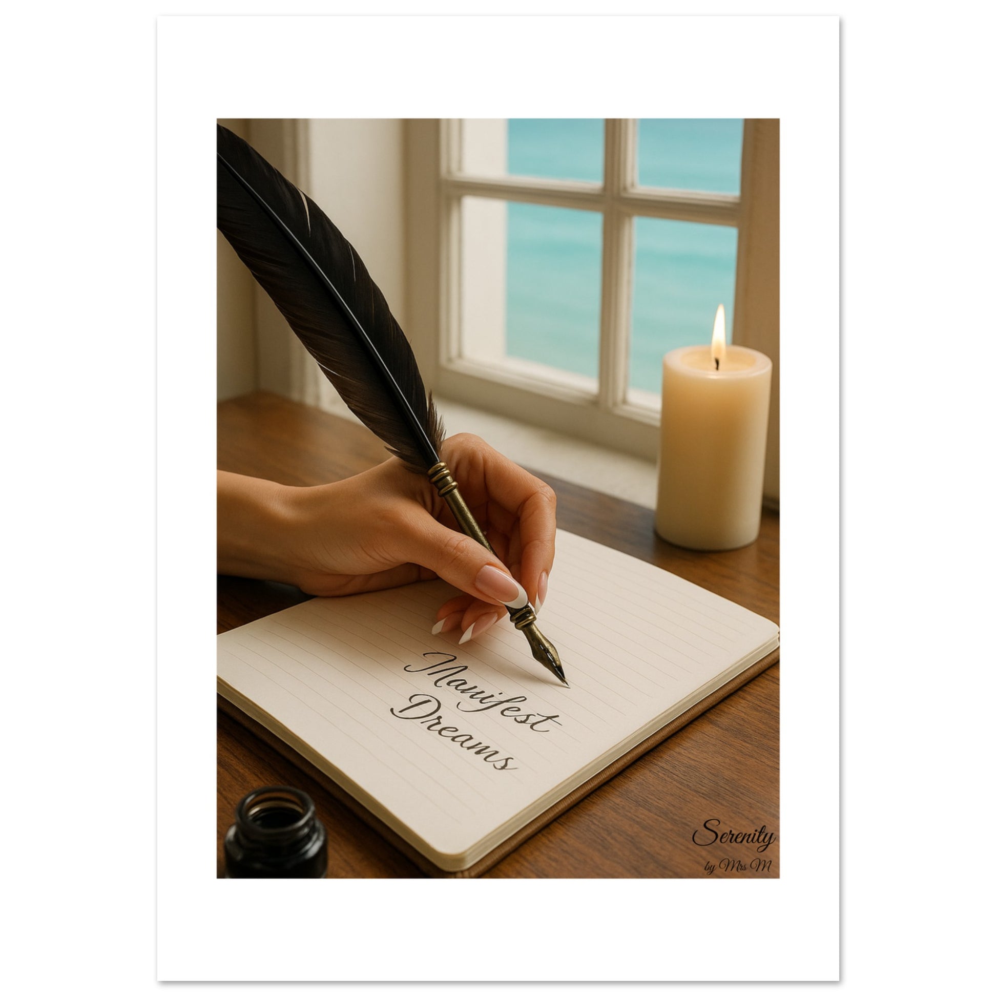Embrace a moment of tranquil inspiration with our "Manifest Dreams" Poster. This captivating piece beautifully captures the essence of focused intention, featuring a hand gracefully holding a vintage feather pen, poised over a notebook with the elegant script "Manifest Dreams." Bathed in the soft glow of a nearby candle and set against the calming backdrop of an ocean view through a window, this artwork evokes a sense of peace, purpose, and limitless possibility.