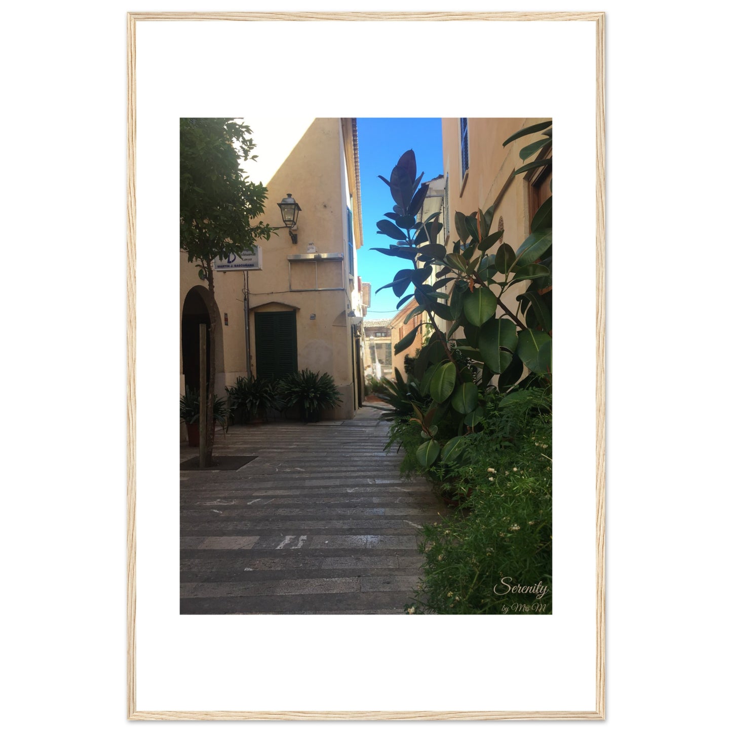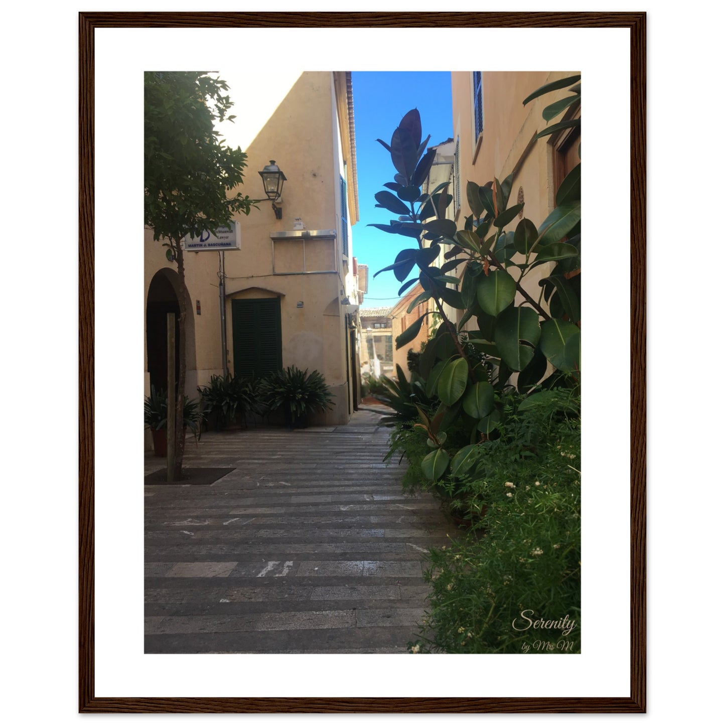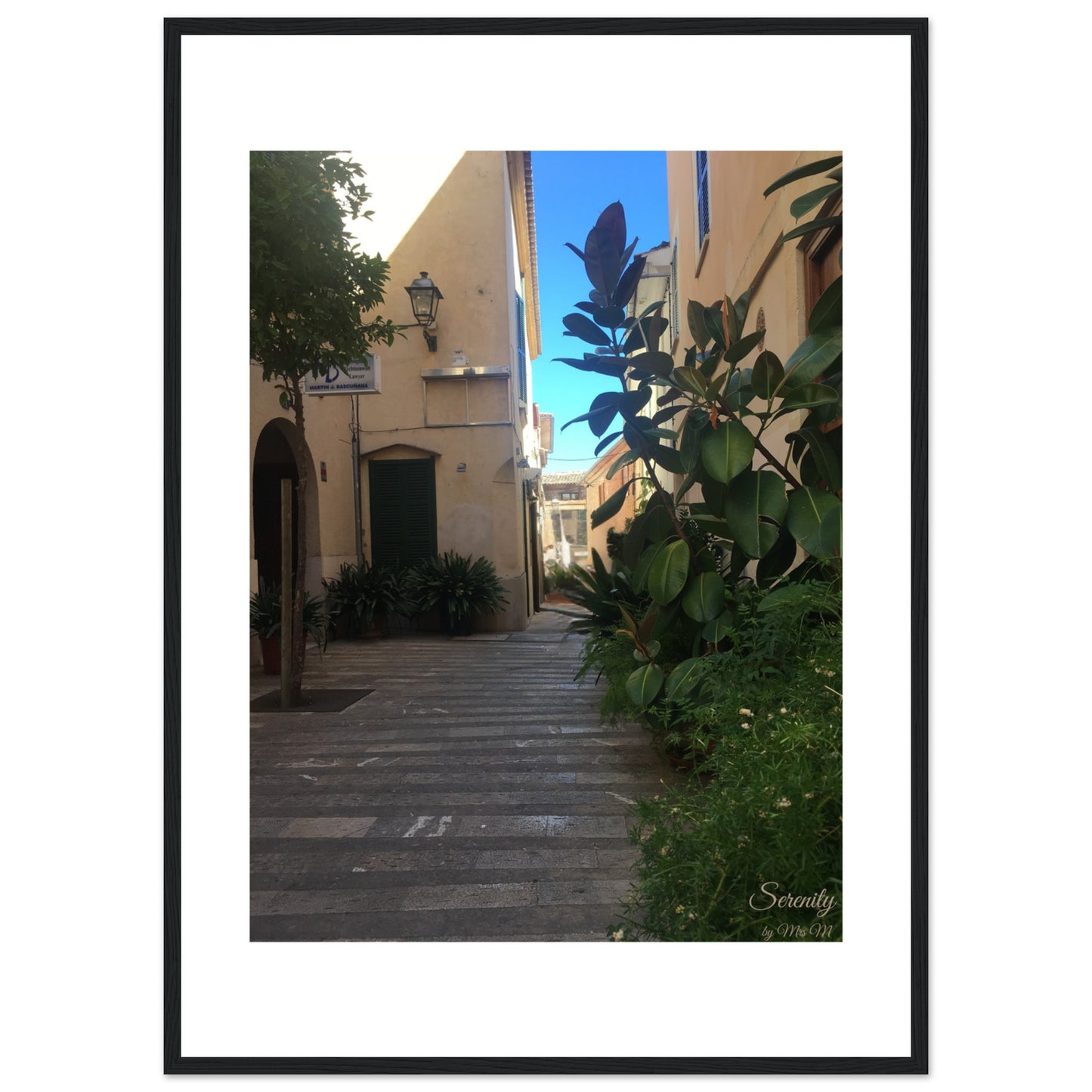 Escape to a tranquil Mediterranean alley with this stunning framed poster, capturing the serene beauty of sun-drenched streets and lush greenery. Let the vibrant blue sky and warm architectural tones transport you to a peaceful moment, right in your own home or office. It's more than just a picture; it's an invitation to pause and breathe.