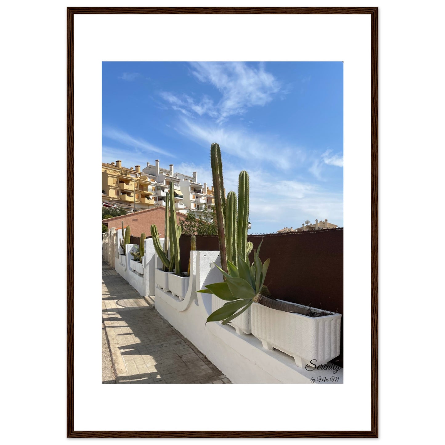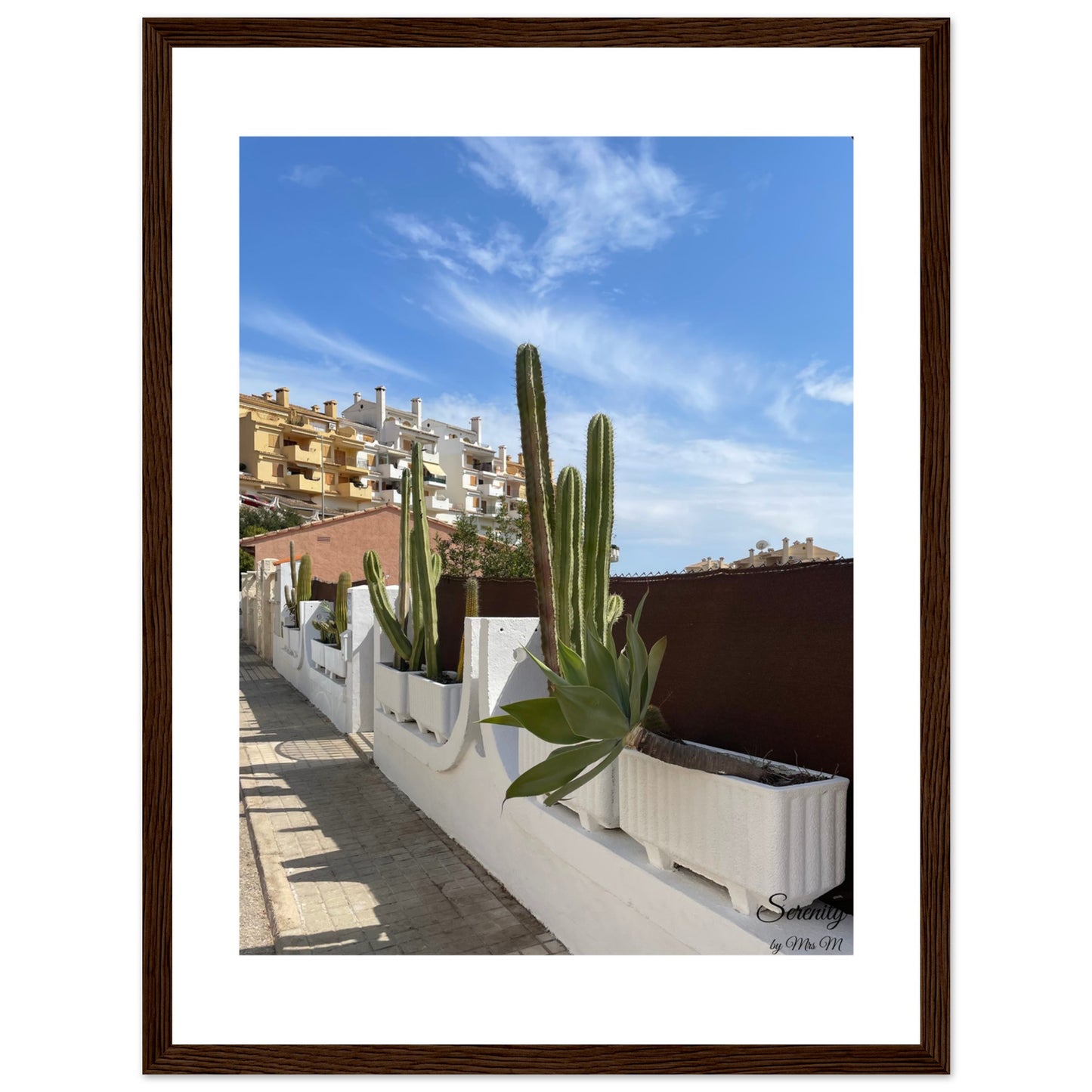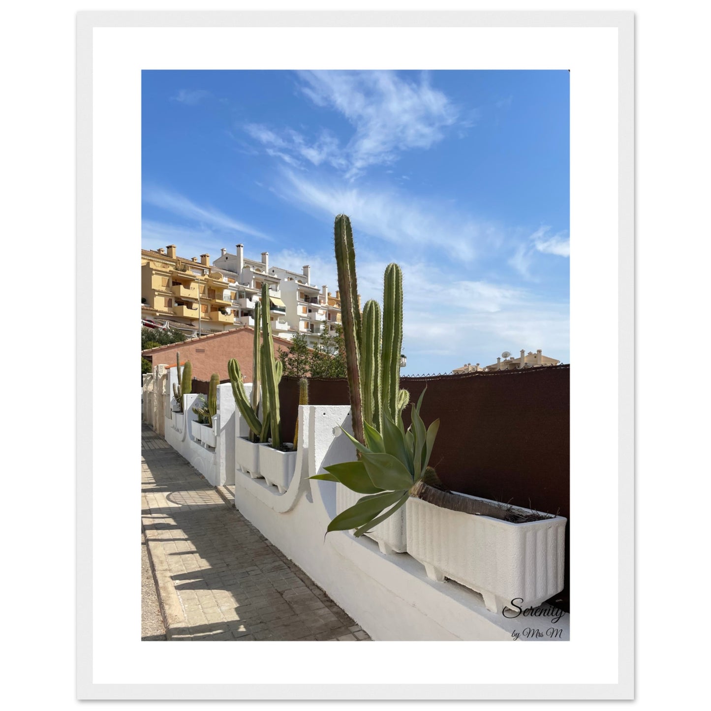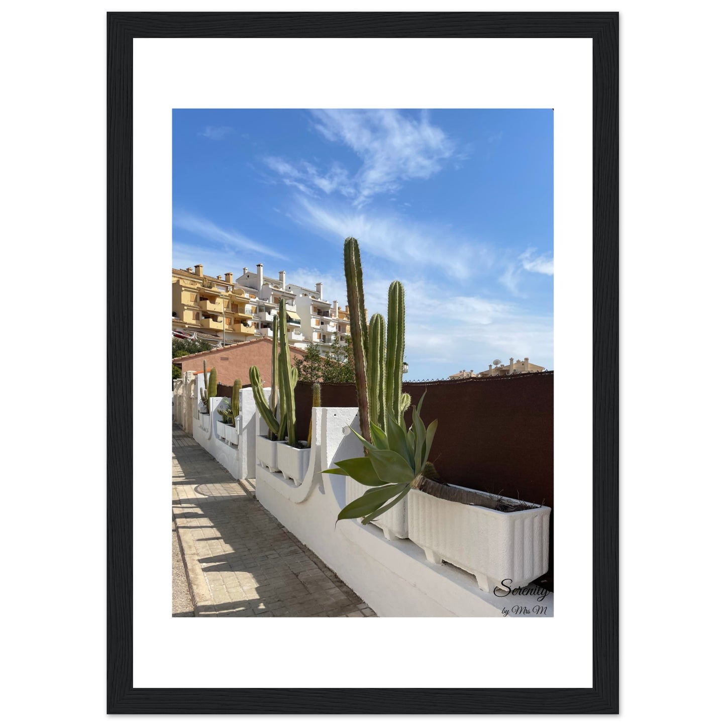 Bring the tranquil vibes of a Mediterranean street scene into your home with this stunning framed poster. Featuring vibrant green cacti against a brilliant blue sky and charming architecture, this piece captures the essence of sun-drenched serenity, perfect for adding a touch of peaceful warmth to any room.