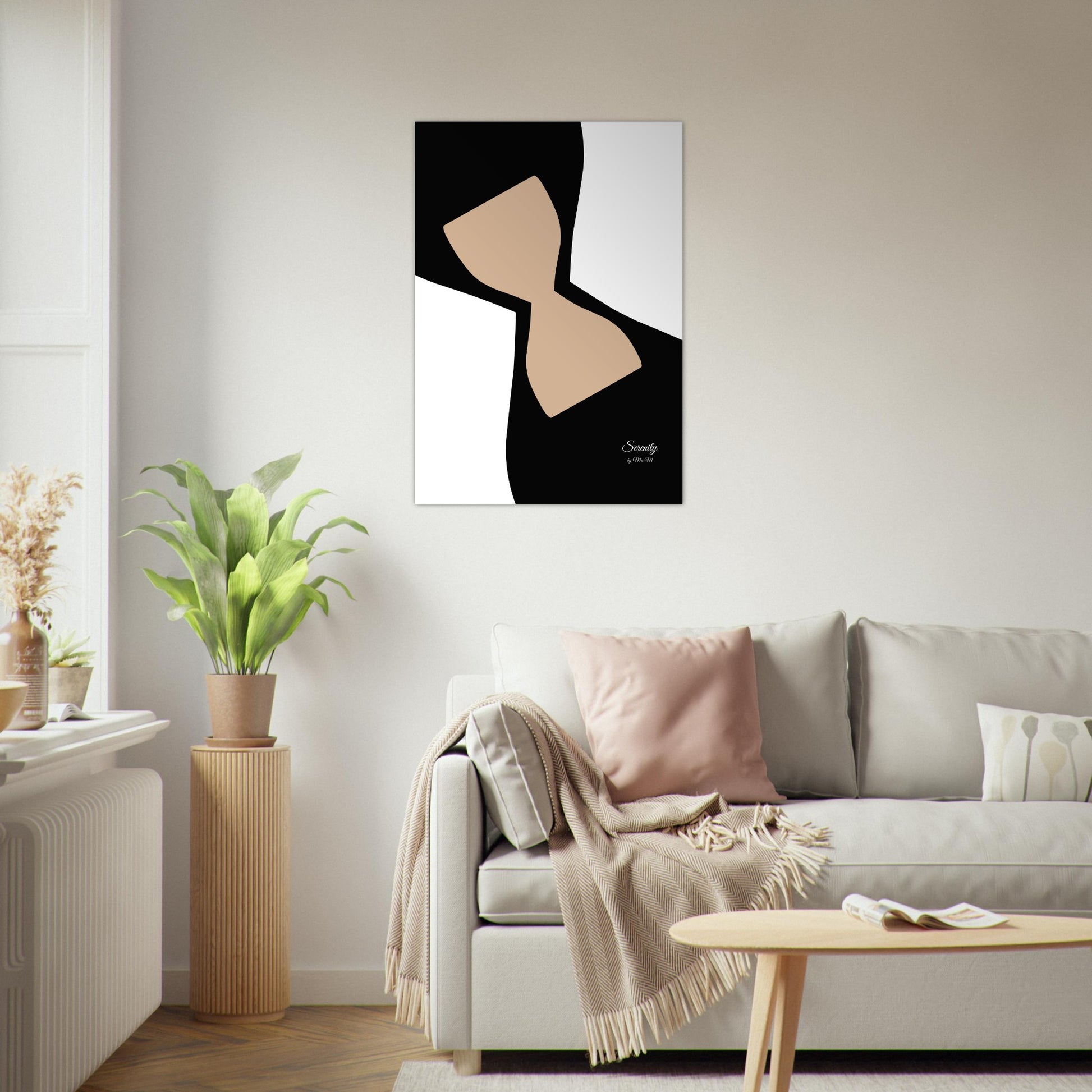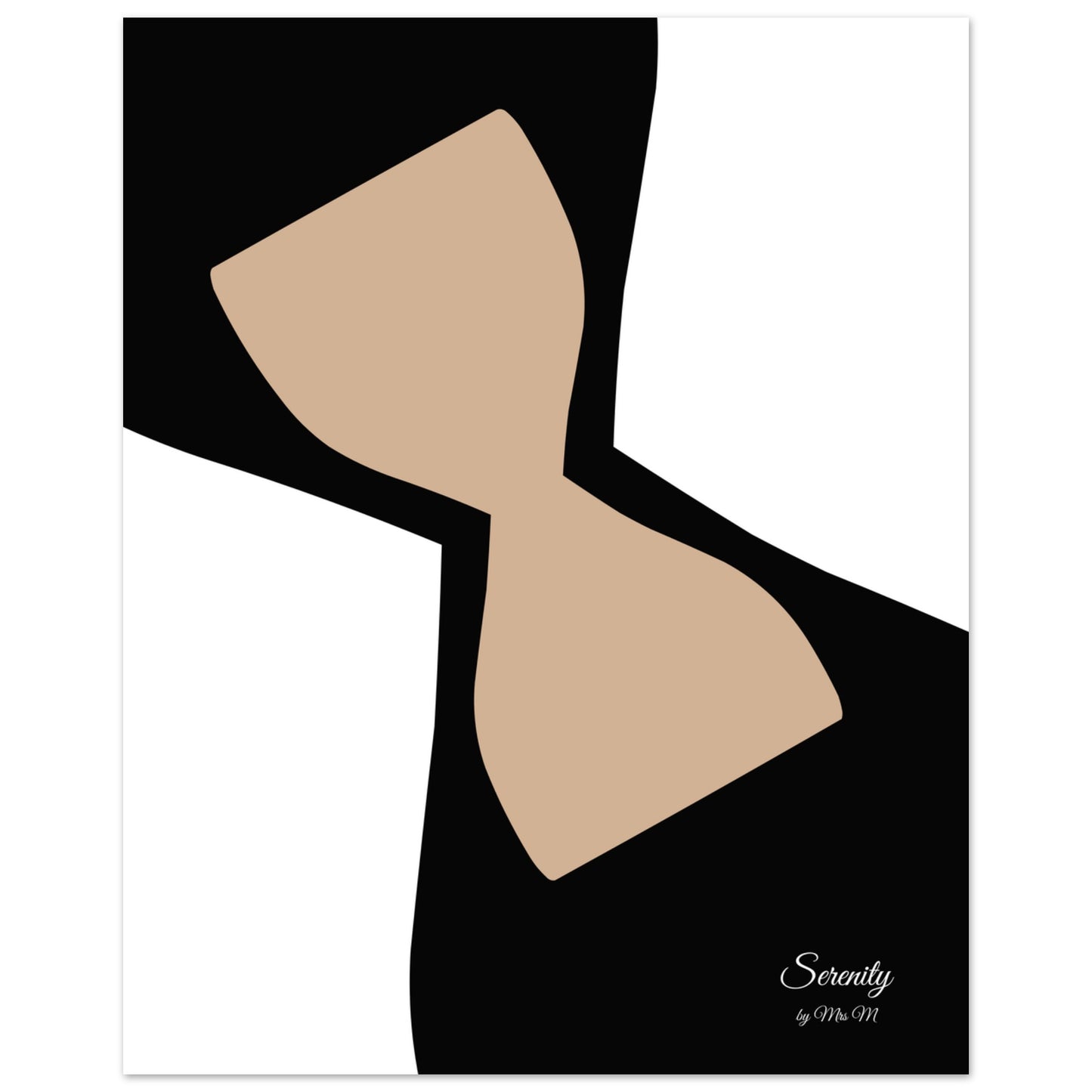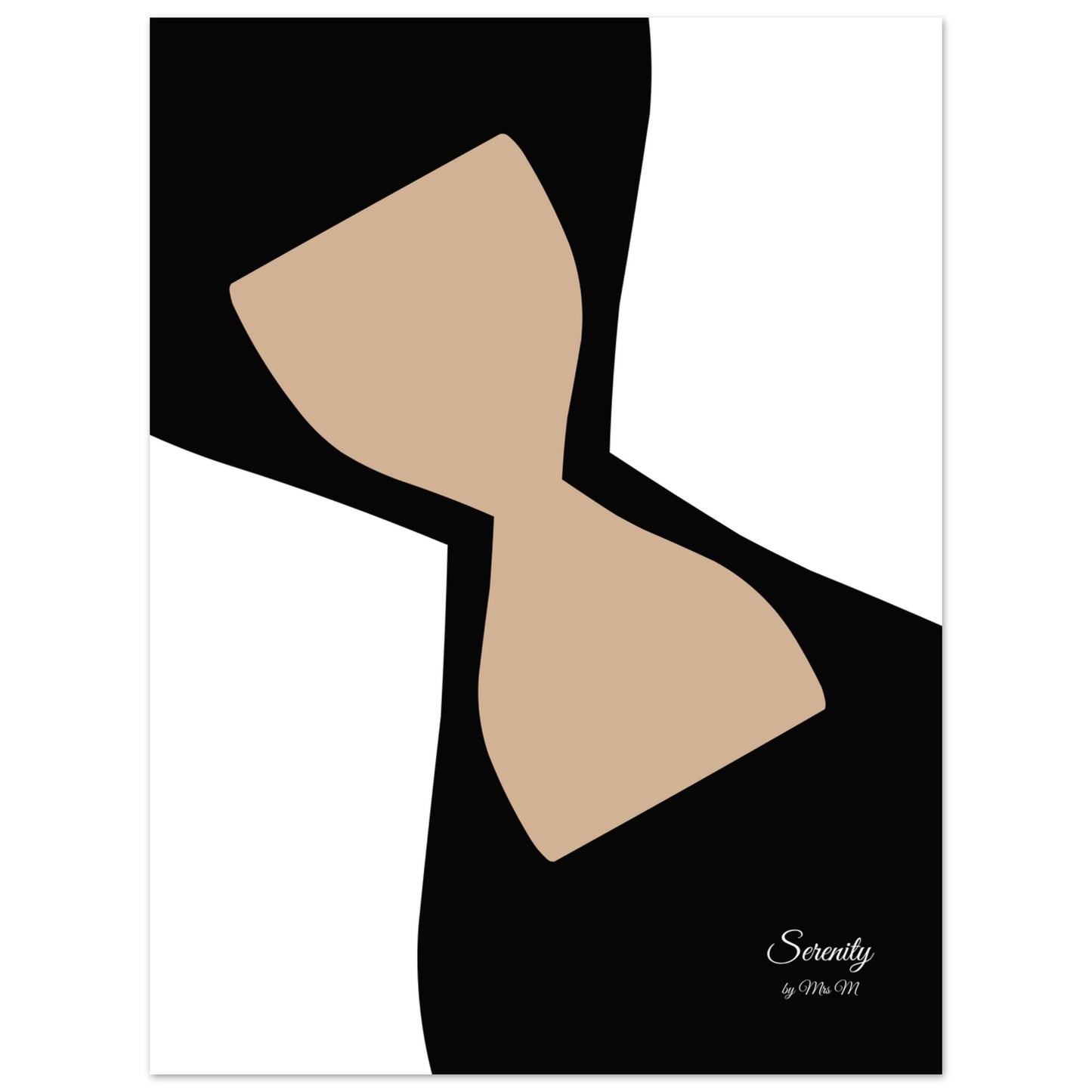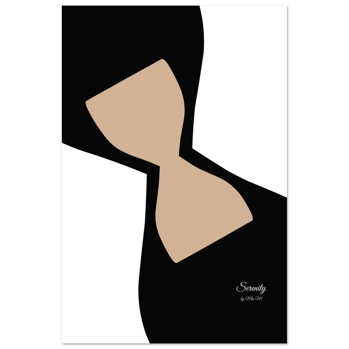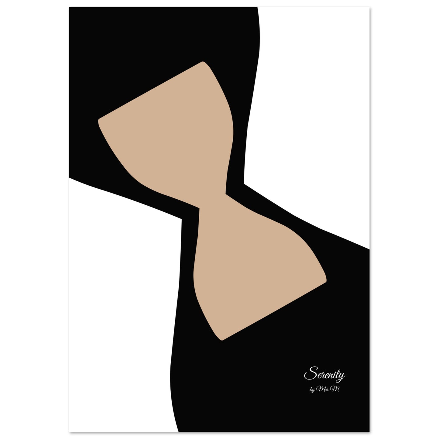 Embrace timeless elegance and a sense of calm with our 'Serenity' abstract poster. Featuring a sophisticated minimalist design, this art print showcases striking black and beige tones, forming an hourglass-like silhouette that speaks to the gentle passage of time and the beauty of simplicity. It's the perfect accent to bring a touch of modern tranquility and refined style to any living space, office, or bedroom.
