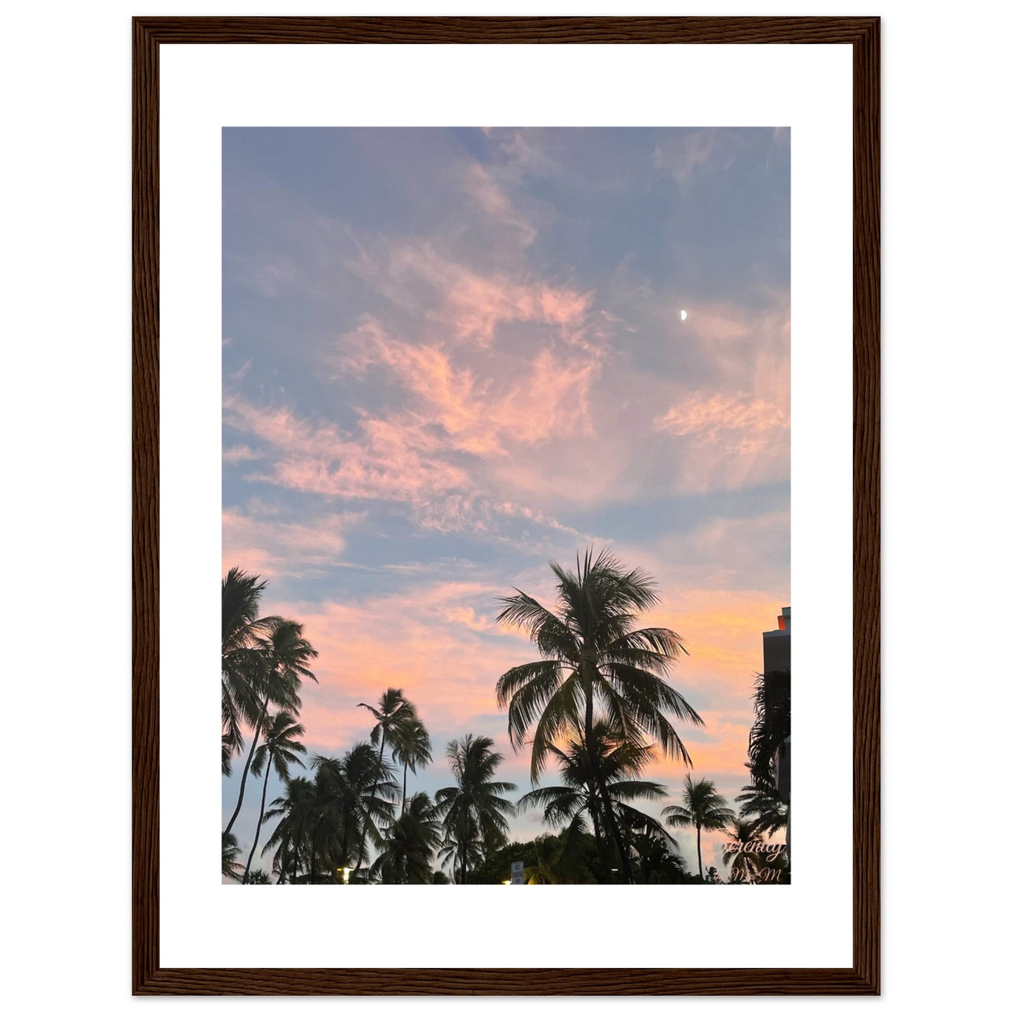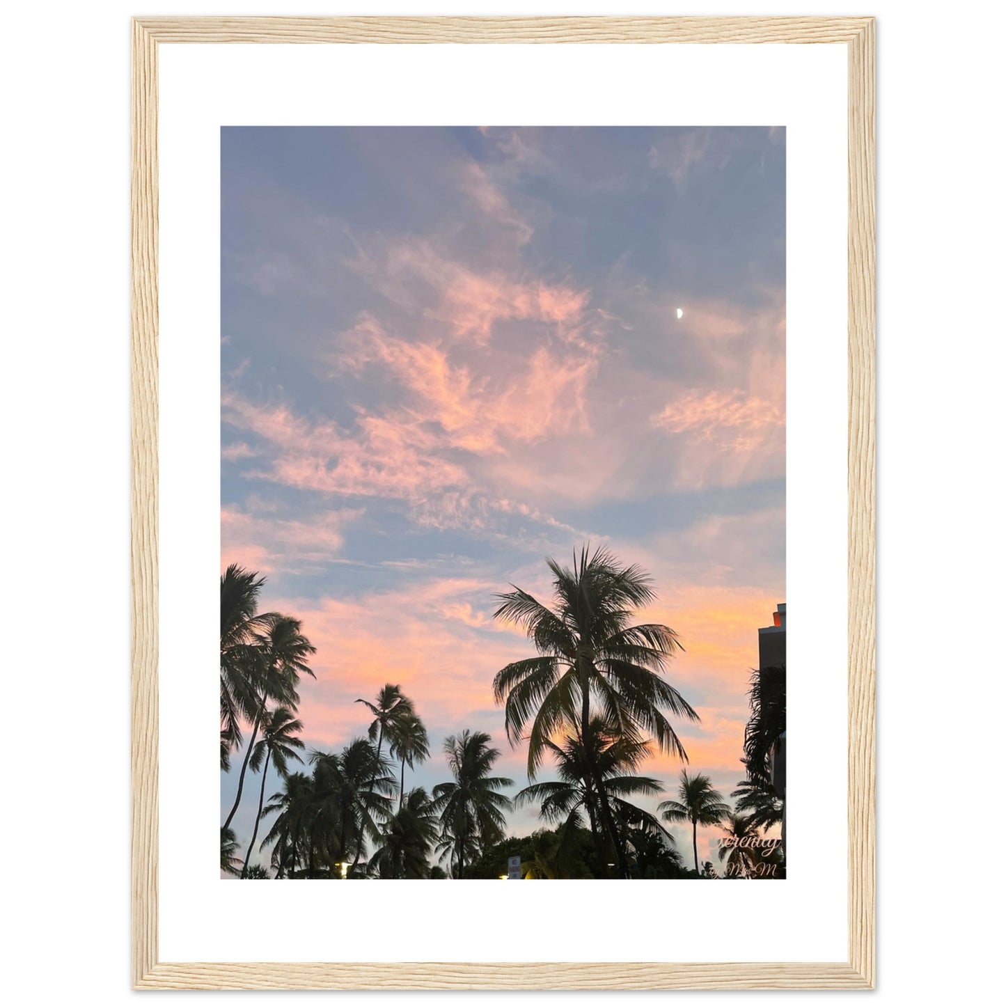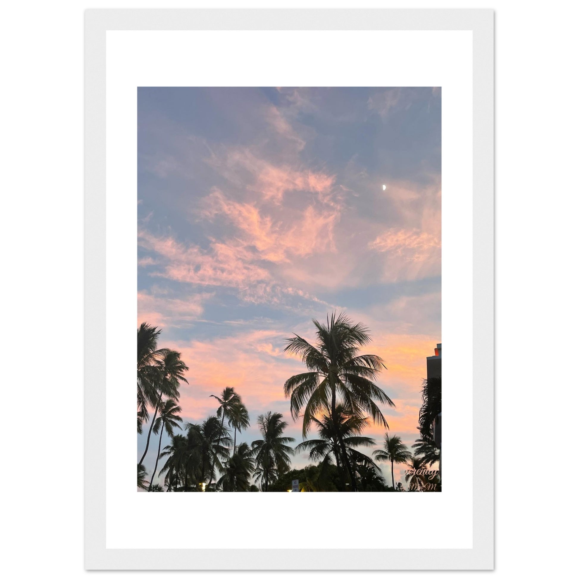 Escape to a tranquil tropical paradise every day with our "Pastel Sunset Palm Trees " framed poster. This enchanting piece captures the breathtaking beauty of a dusk sky, where soft pinks and gentle blues merge in a harmonious dance above swaying palm silhouettes, with the subtle elegance of a crescent moon gracing the scene. It's an invitation to unwind, reflect, and bring a touch of serene, dreamy escapism into your living space.
