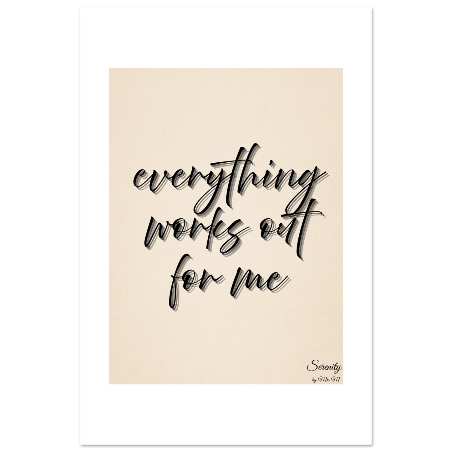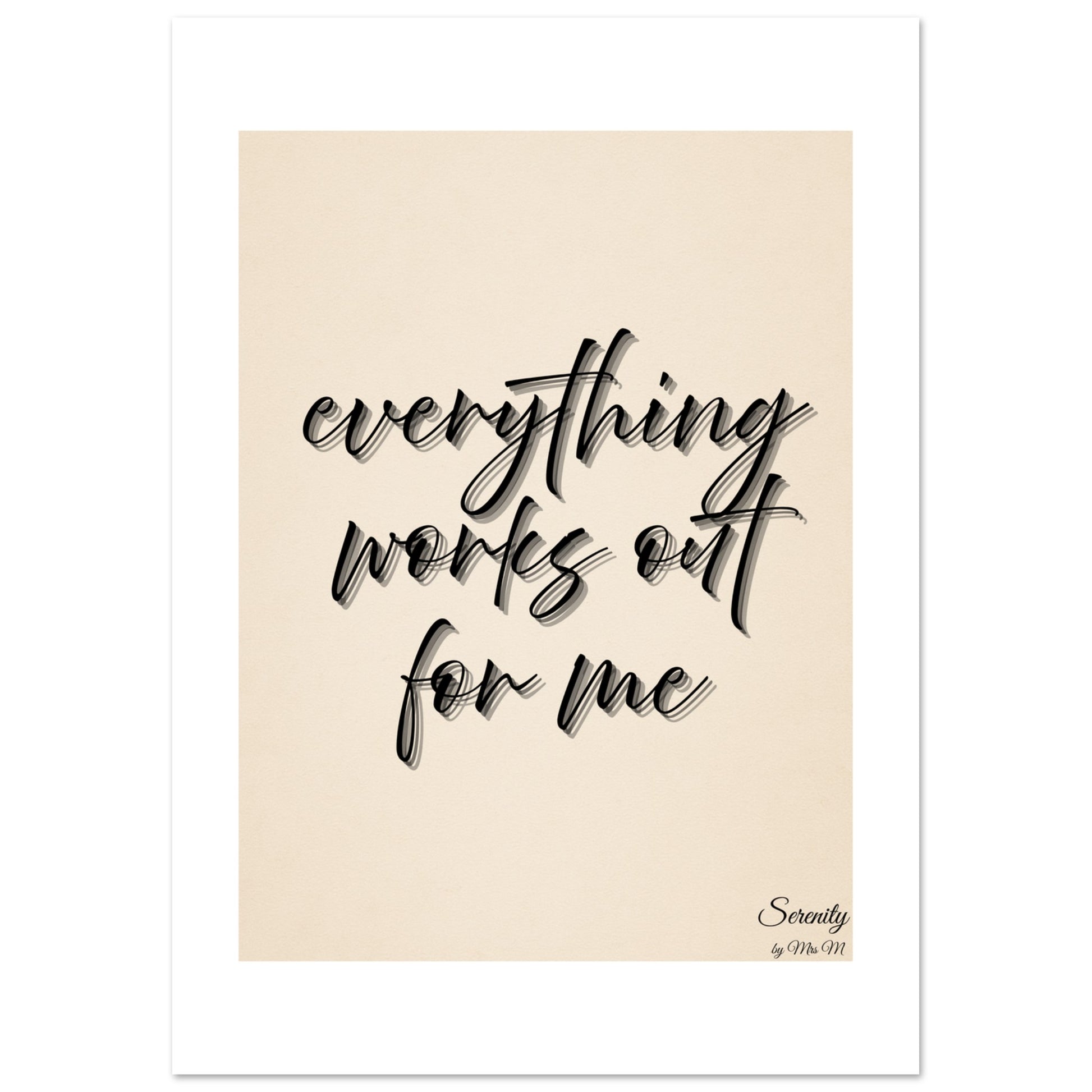 Embrace a positive mindset every day with our "everything works out for me" Serenity Poster. This elegant art print features a beautiful, flowing script that brings a sense of calm and assurance to any space. The gentle, neutral background with its subtle texture perfectly complements the empowering message, making it an ideal addition to your bedroom, office, or meditation corner. Let this daily affirmation inspire confidence and tranquility in your life.