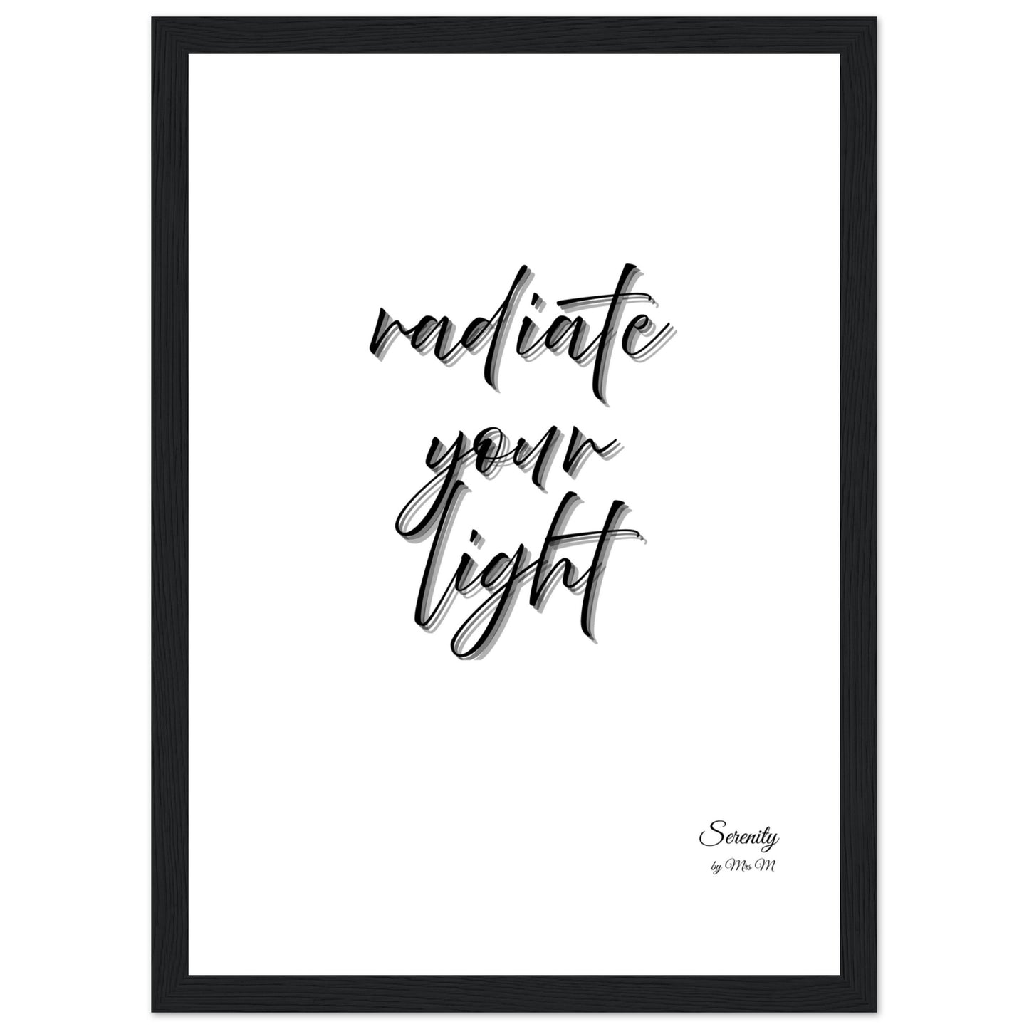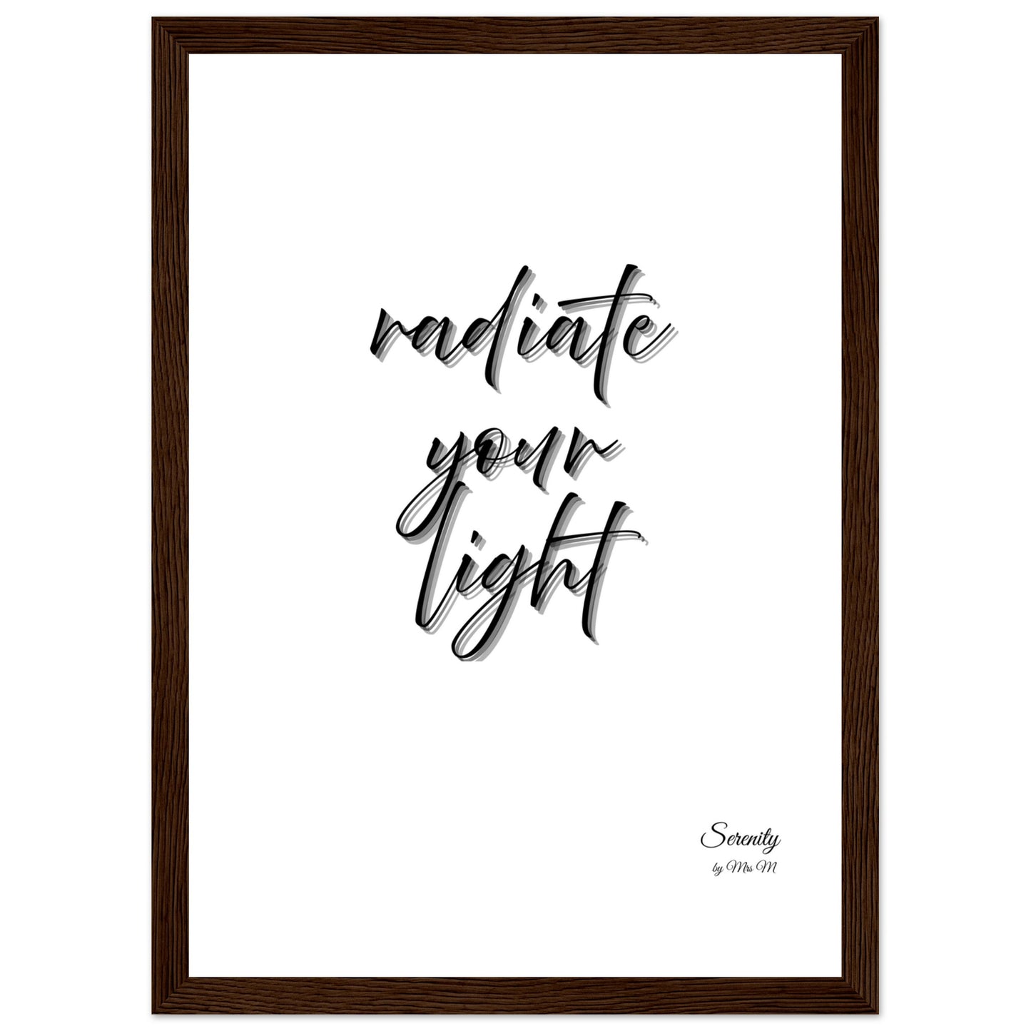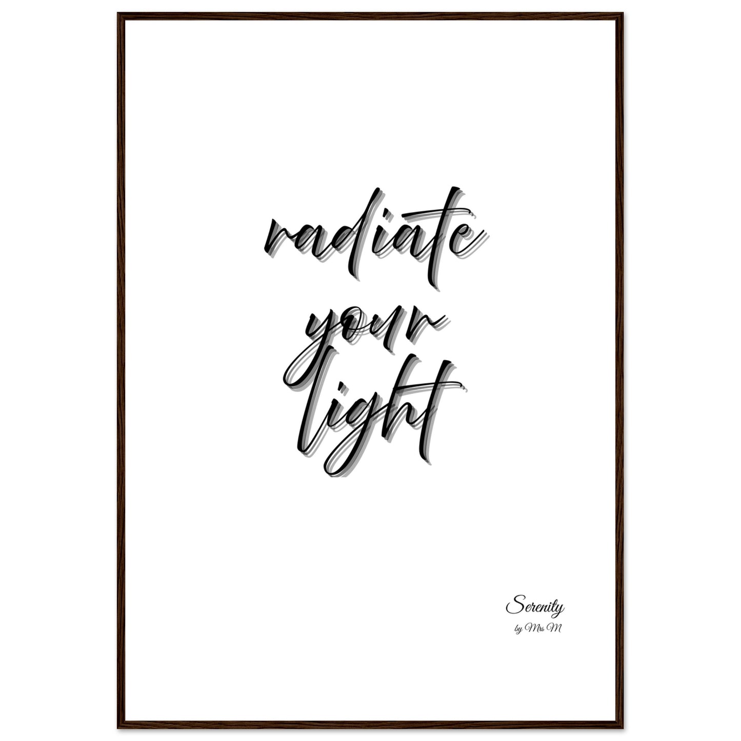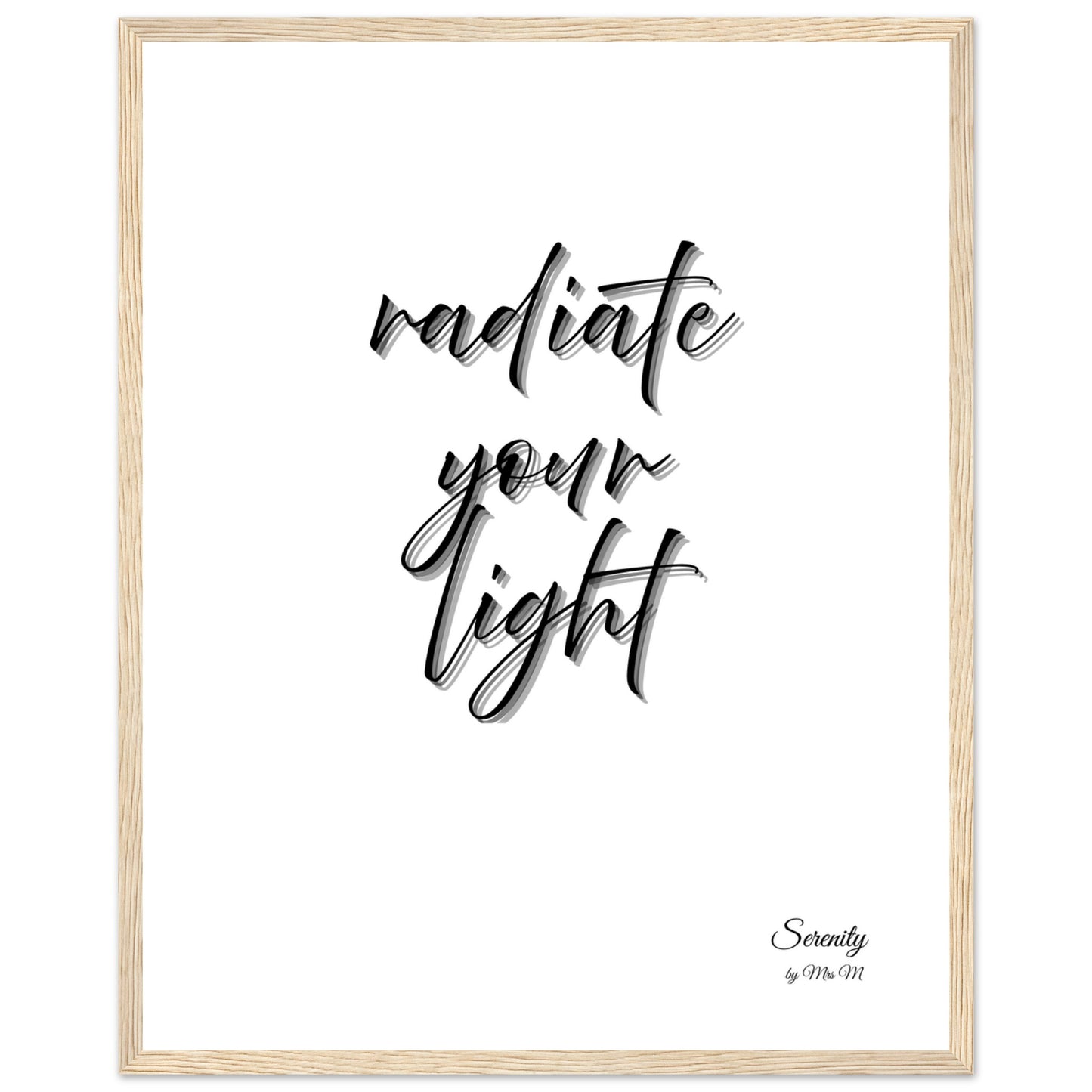 Elevate your space with a touch of modern inspiration! Our "radiate your light" framed poster features elegant, flowing script typography with a captivating layered shadow effect, creating a dynamic and stylish focal point for any room. This piece, signed "Serenity by Mrs M," is designed to bring a calm yet empowering vibe to your home or office, reminding you daily to let your inner brilliance shine.