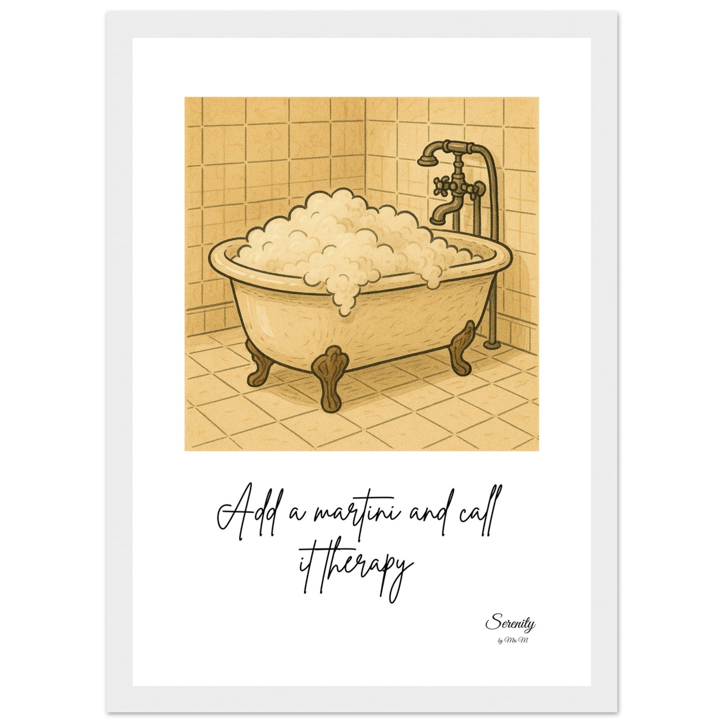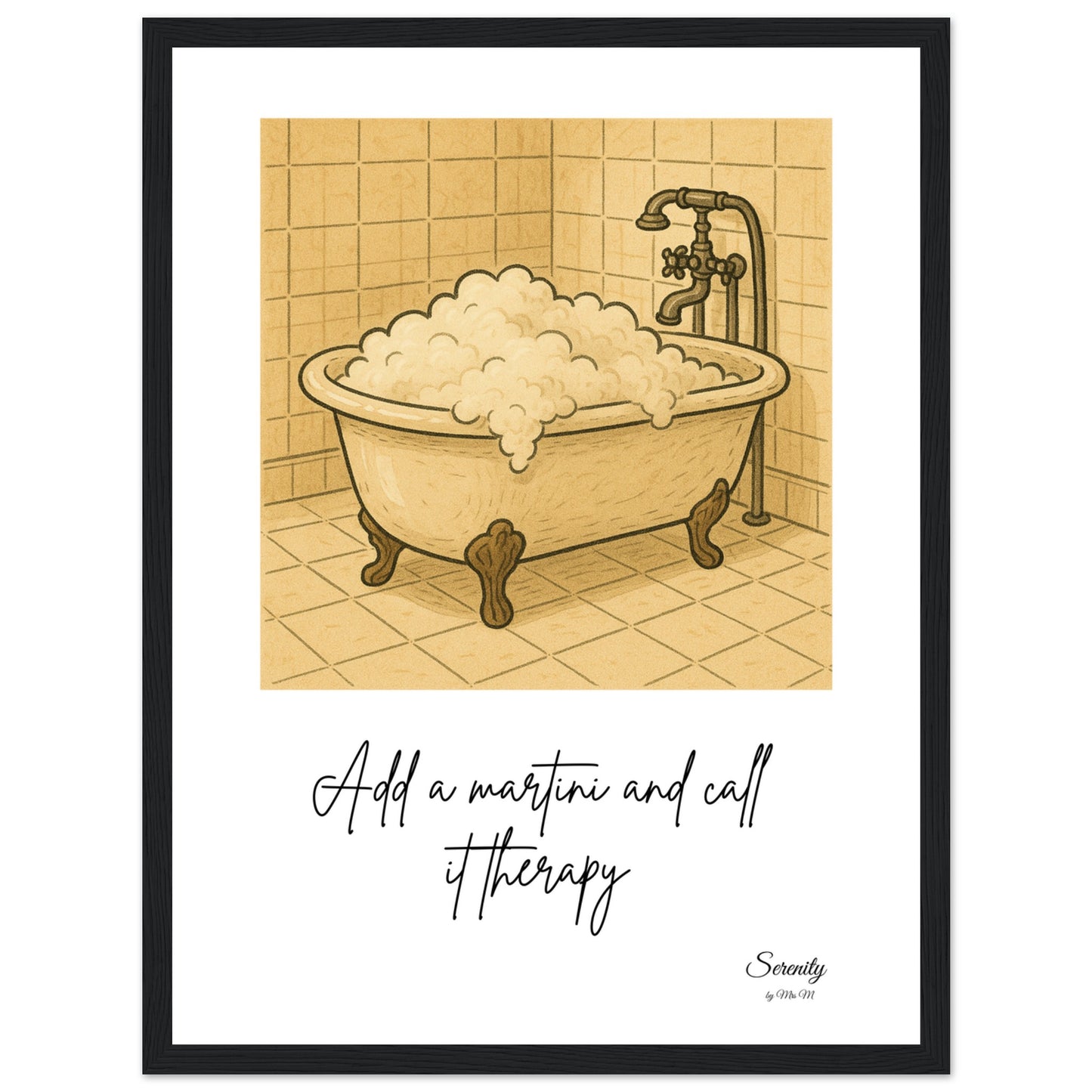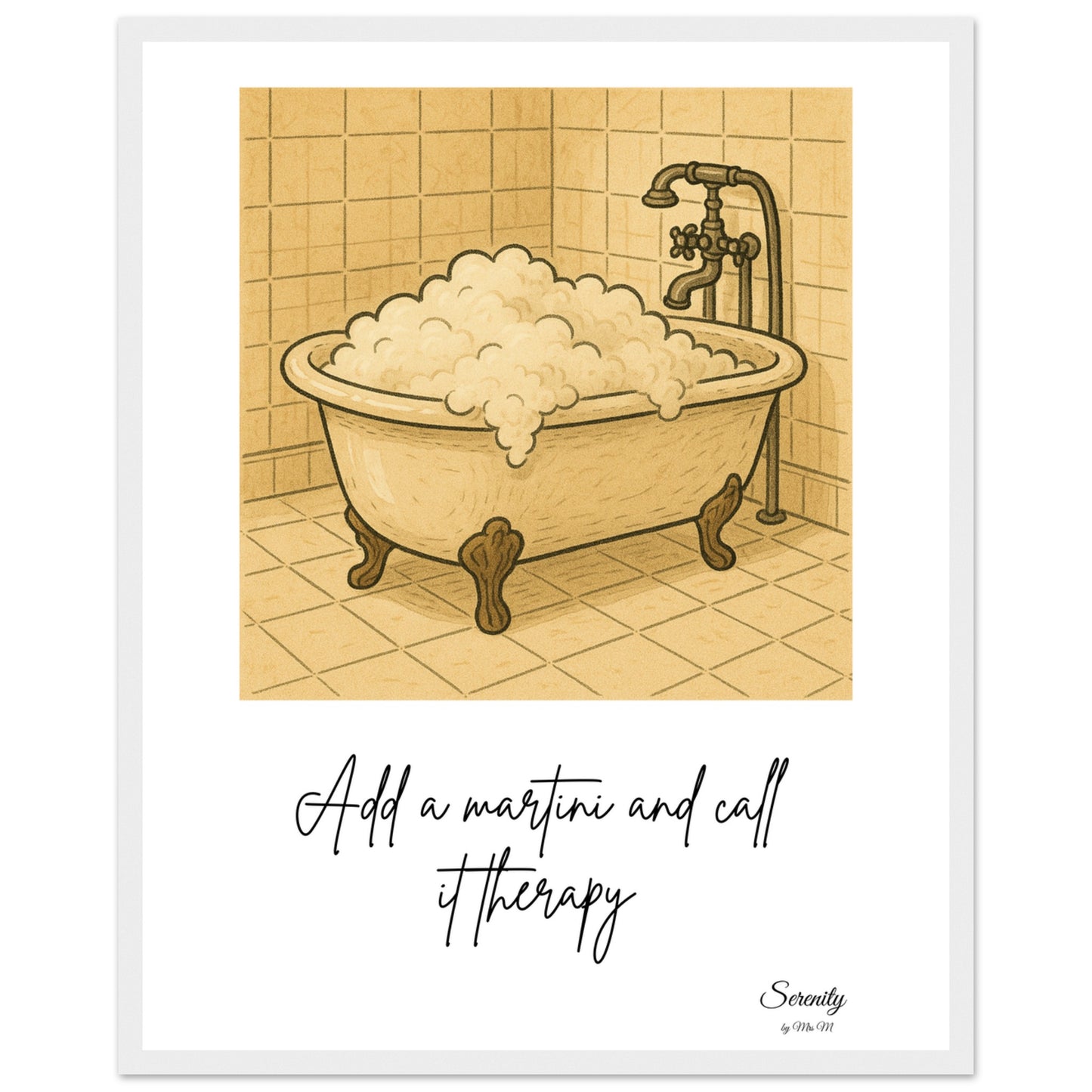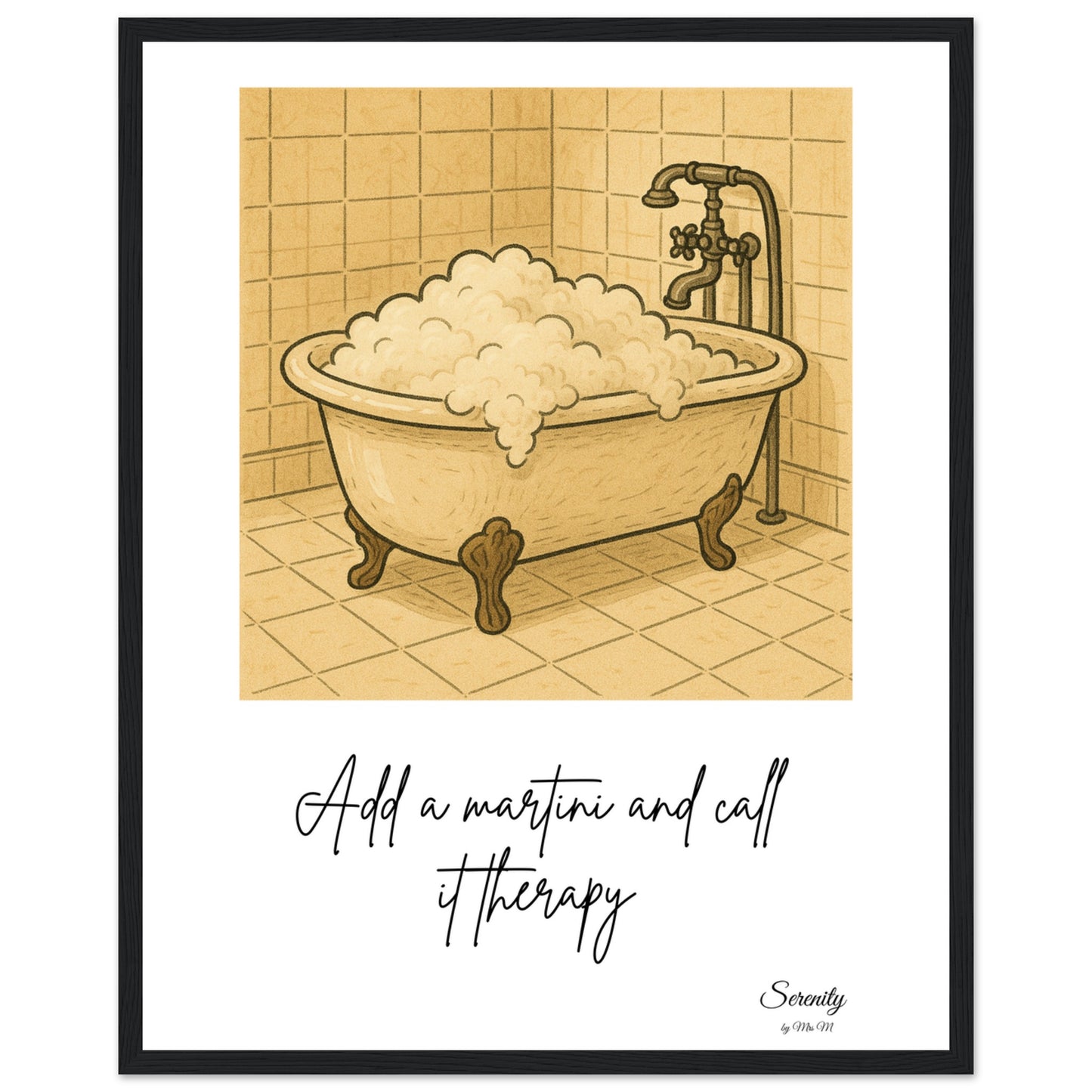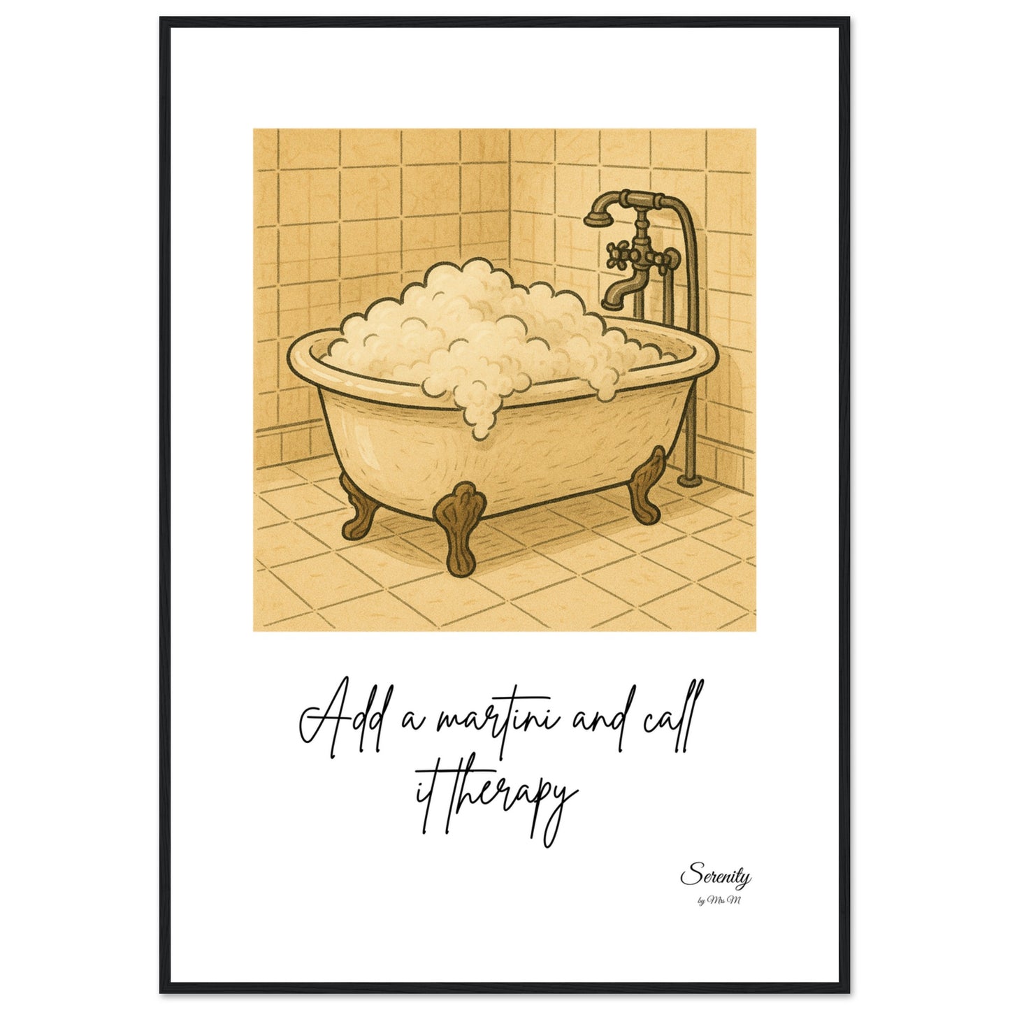 Embrace the art of self-care with our charming "Add a Martini and Call it Therapy" framed poster. This delightful piece captures the simple luxury of a bubble bath, rendered in a warm, inviting vintage style. It’s a gentle reminder to slow down, unwind, and find your moment of peace amidst life's hustle. Perfect for adding a touch of playful elegance to your bathroom, bedroom, or living space, this poster invites tranquility and a bit of witty charm into your home.