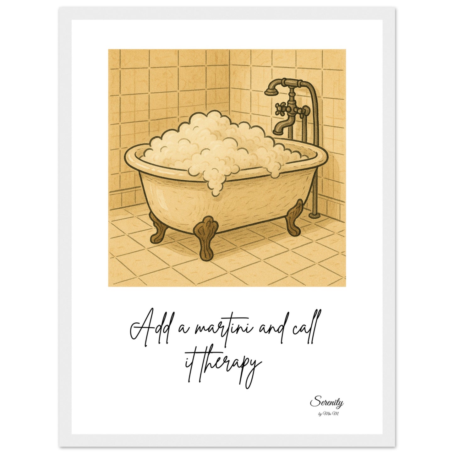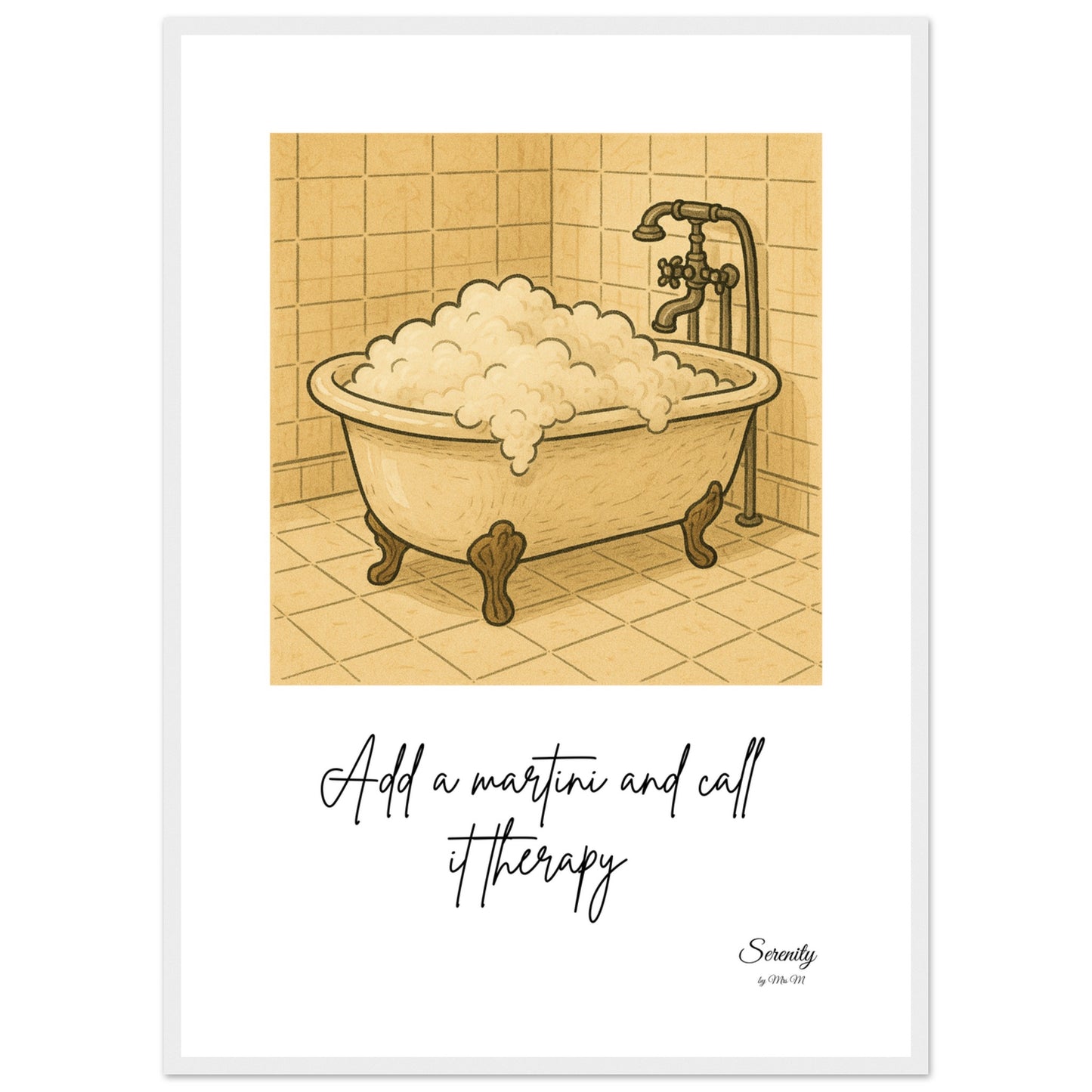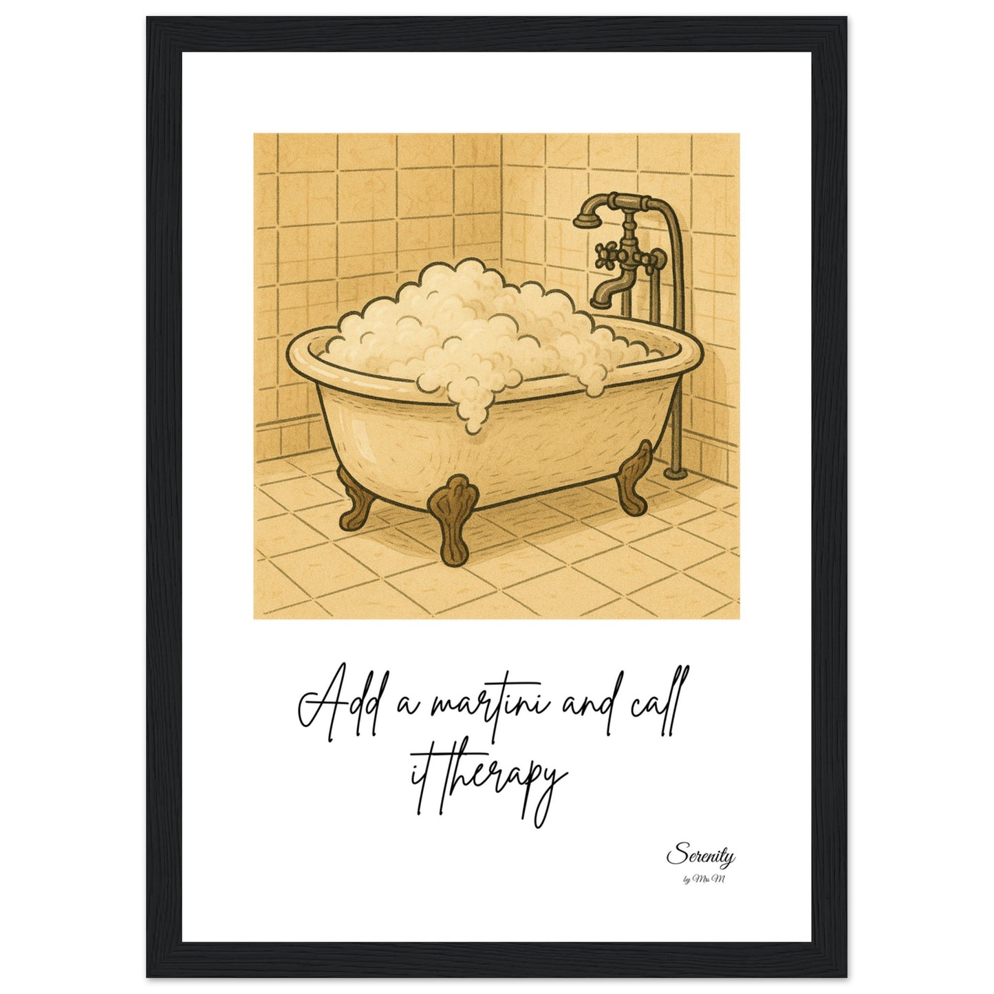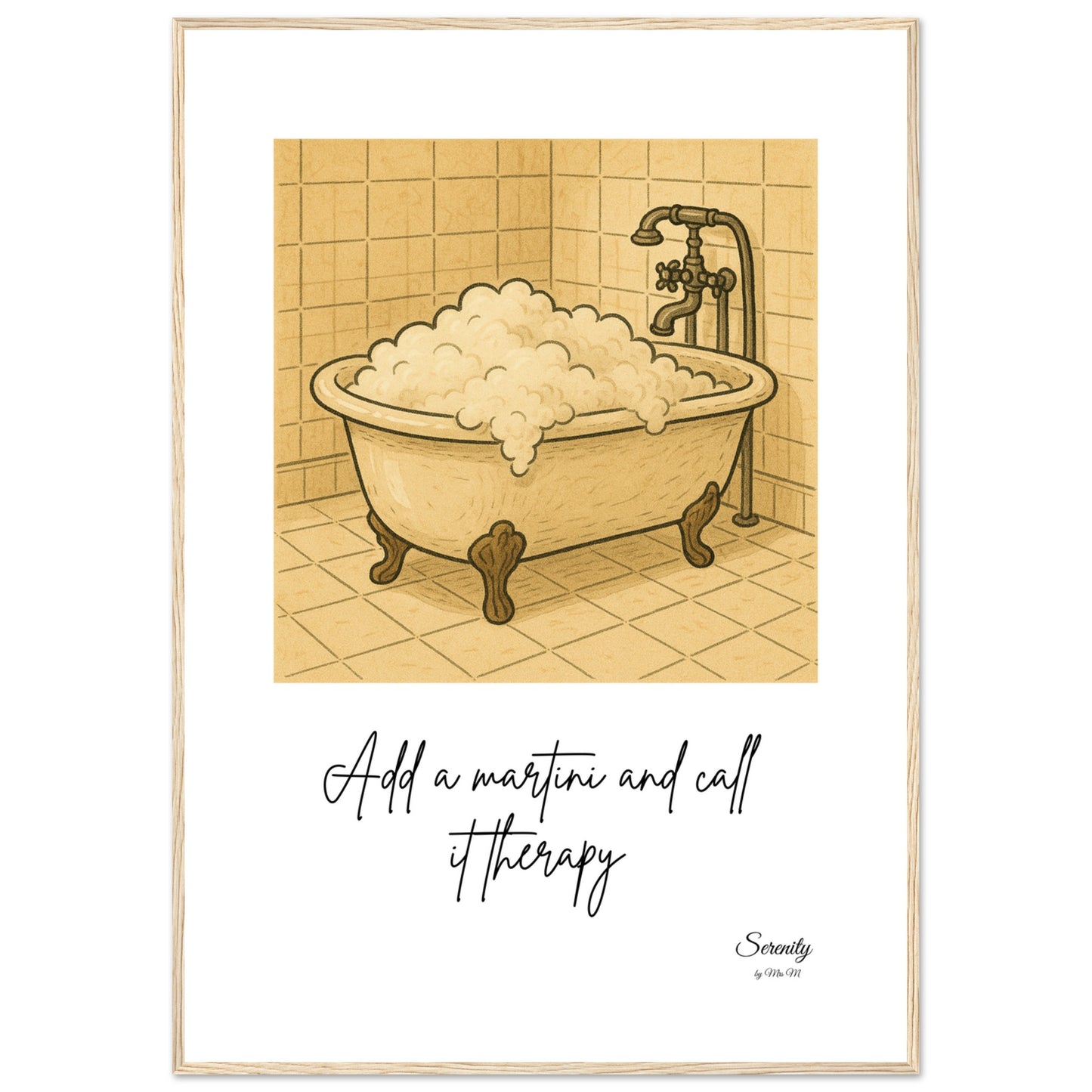 Embrace the art of self-care with our charming "Add a Martini and Call it Therapy" framed poster. This delightful piece captures the simple luxury of a bubble bath, rendered in a warm, inviting vintage style. It’s a gentle reminder to slow down, unwind, and find your moment of peace amidst life's hustle. Perfect for adding a touch of playful elegance to your bathroom, bedroom, or living space, this poster invites tranquility and a bit of witty charm into your home.