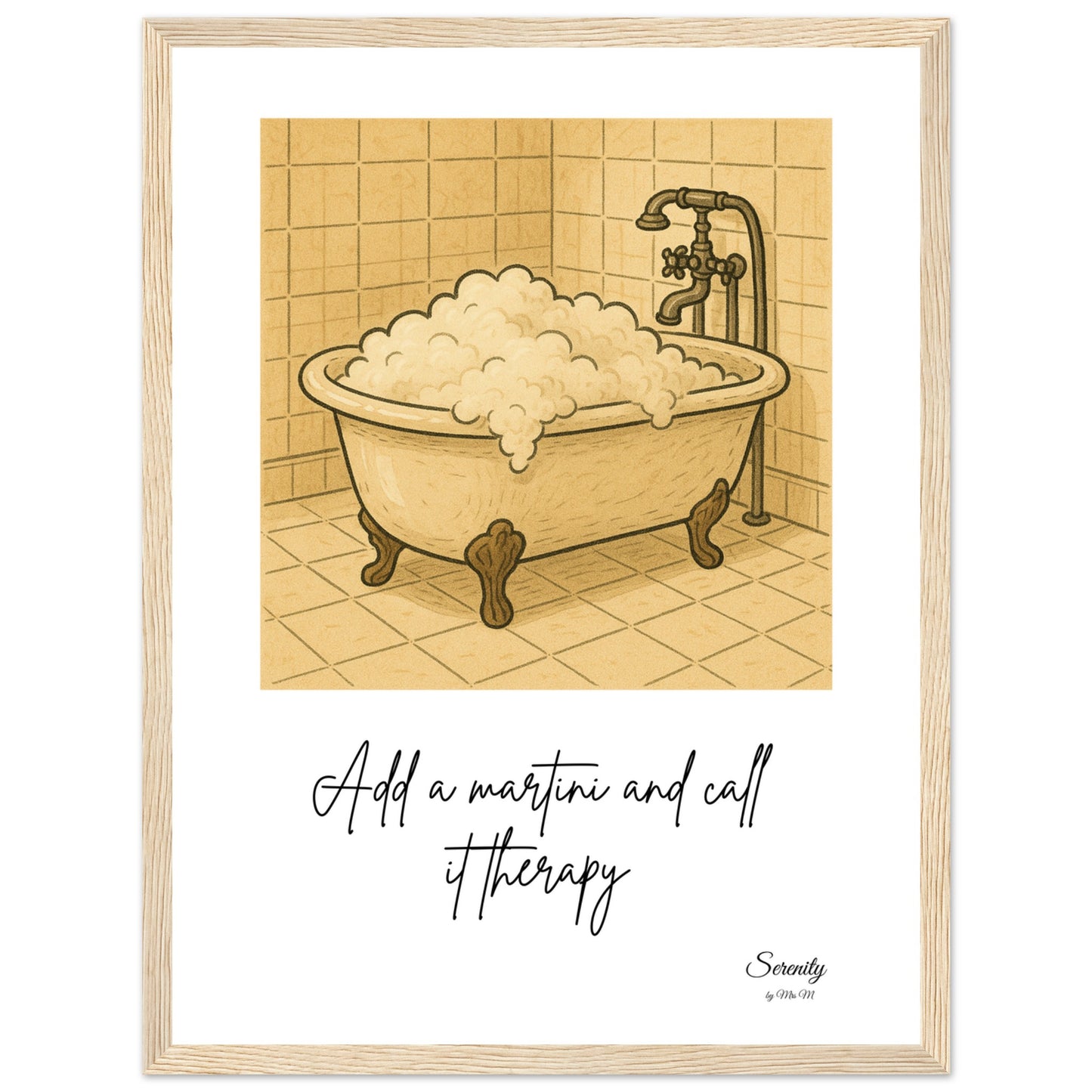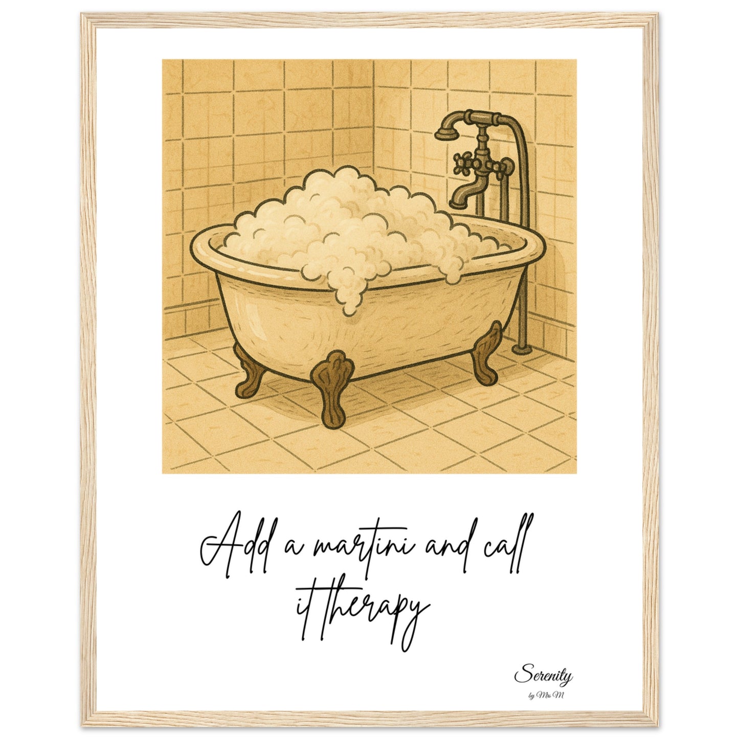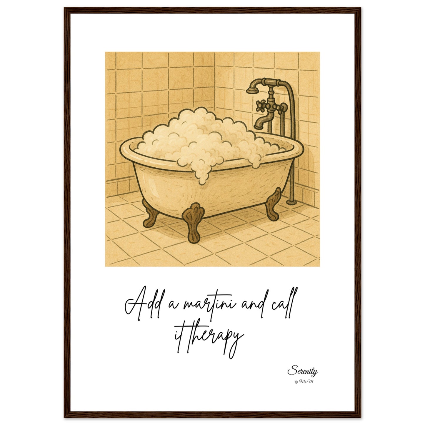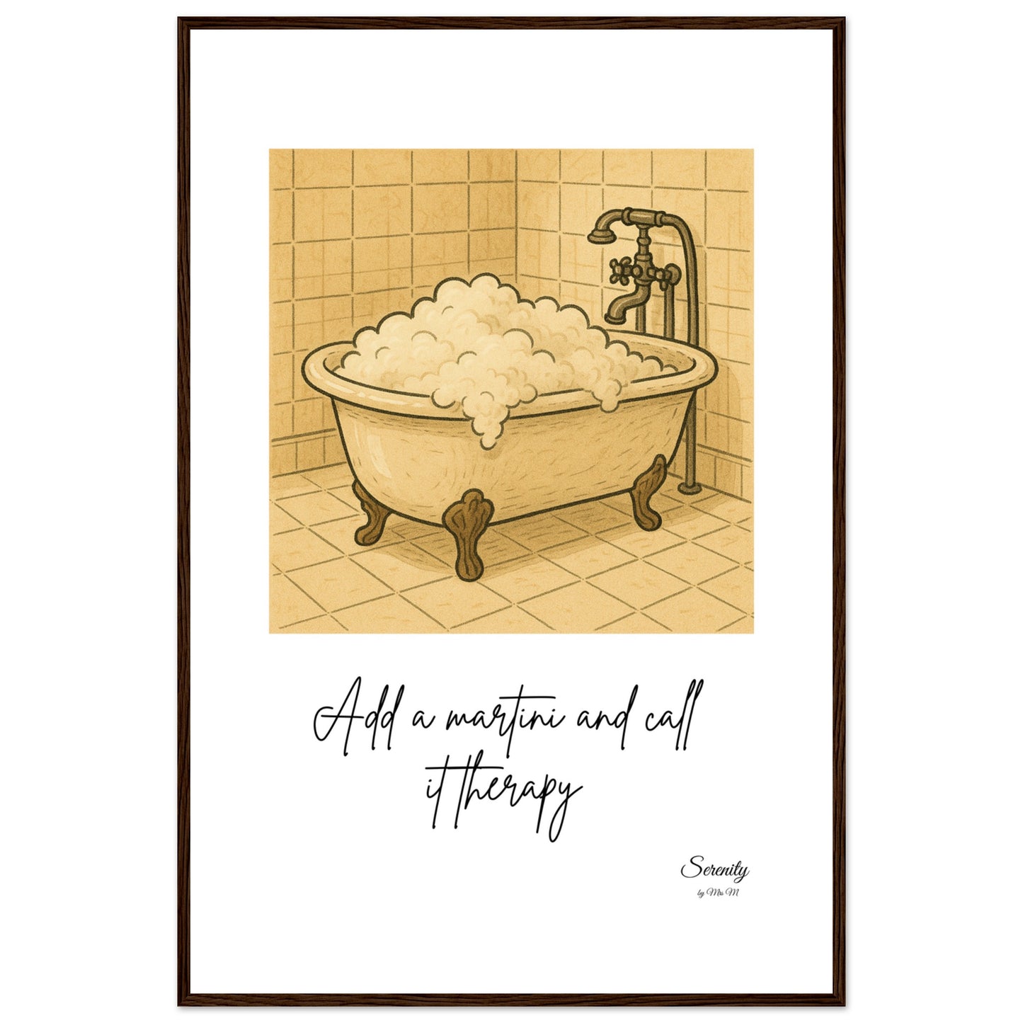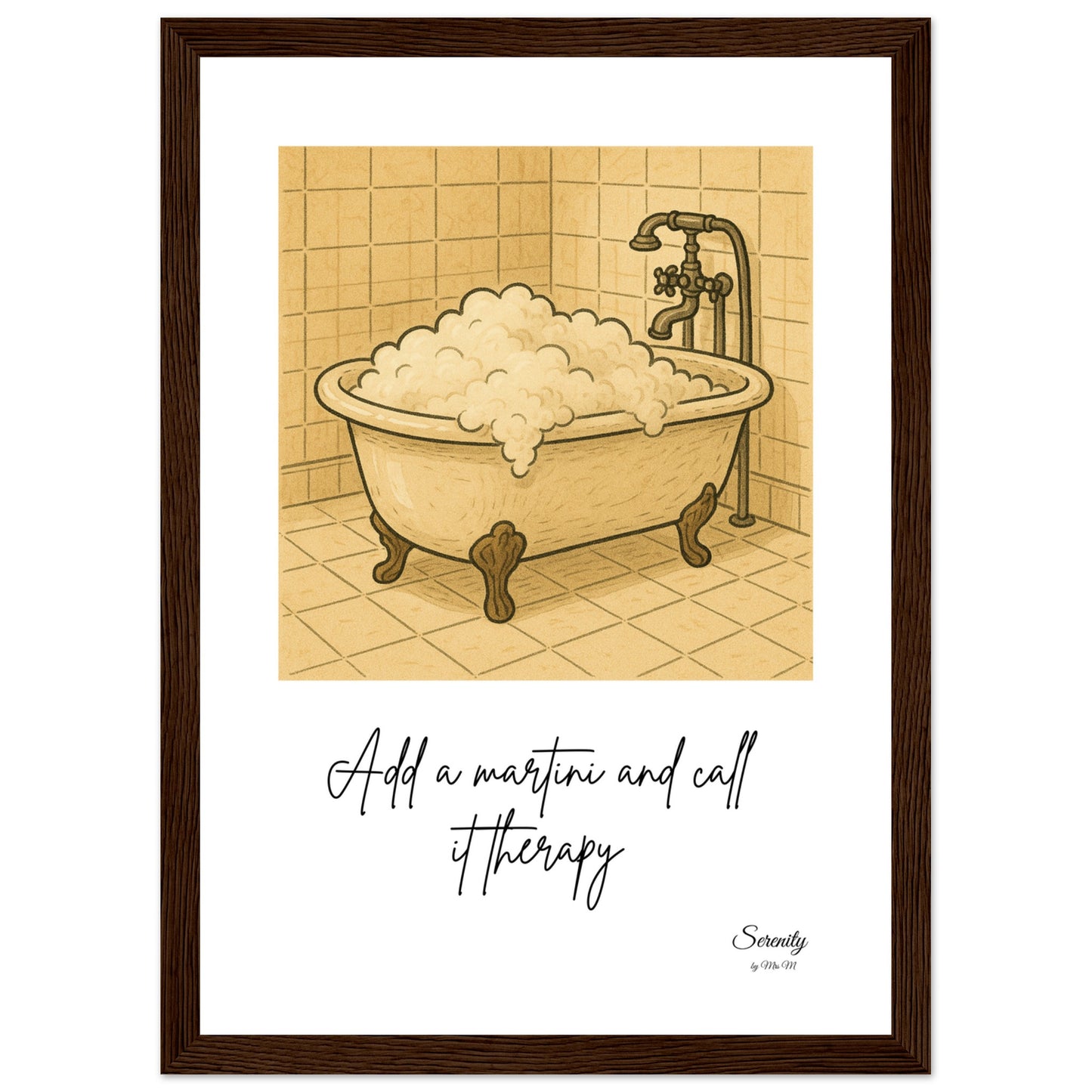 Embrace the art of self-care with our charming "Add a Martini and Call it Therapy" framed poster. This delightful piece captures the simple luxury of a bubble bath, rendered in a warm, inviting vintage style. It’s a gentle reminder to slow down, unwind, and find your moment of peace amidst life's hustle. Perfect for adding a touch of playful elegance to your bathroom, bedroom, or living space, this poster invites tranquility and a bit of witty charm into your home.