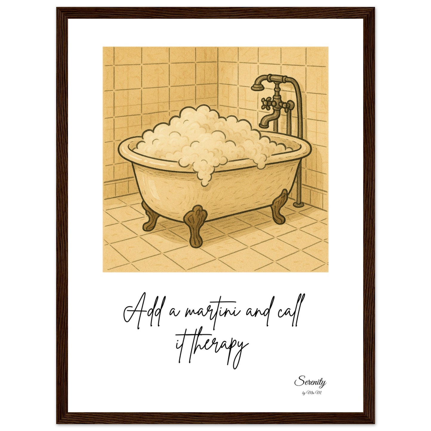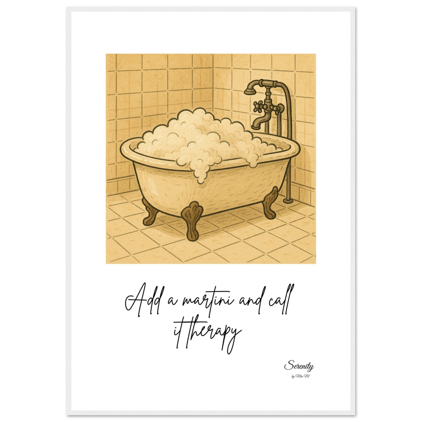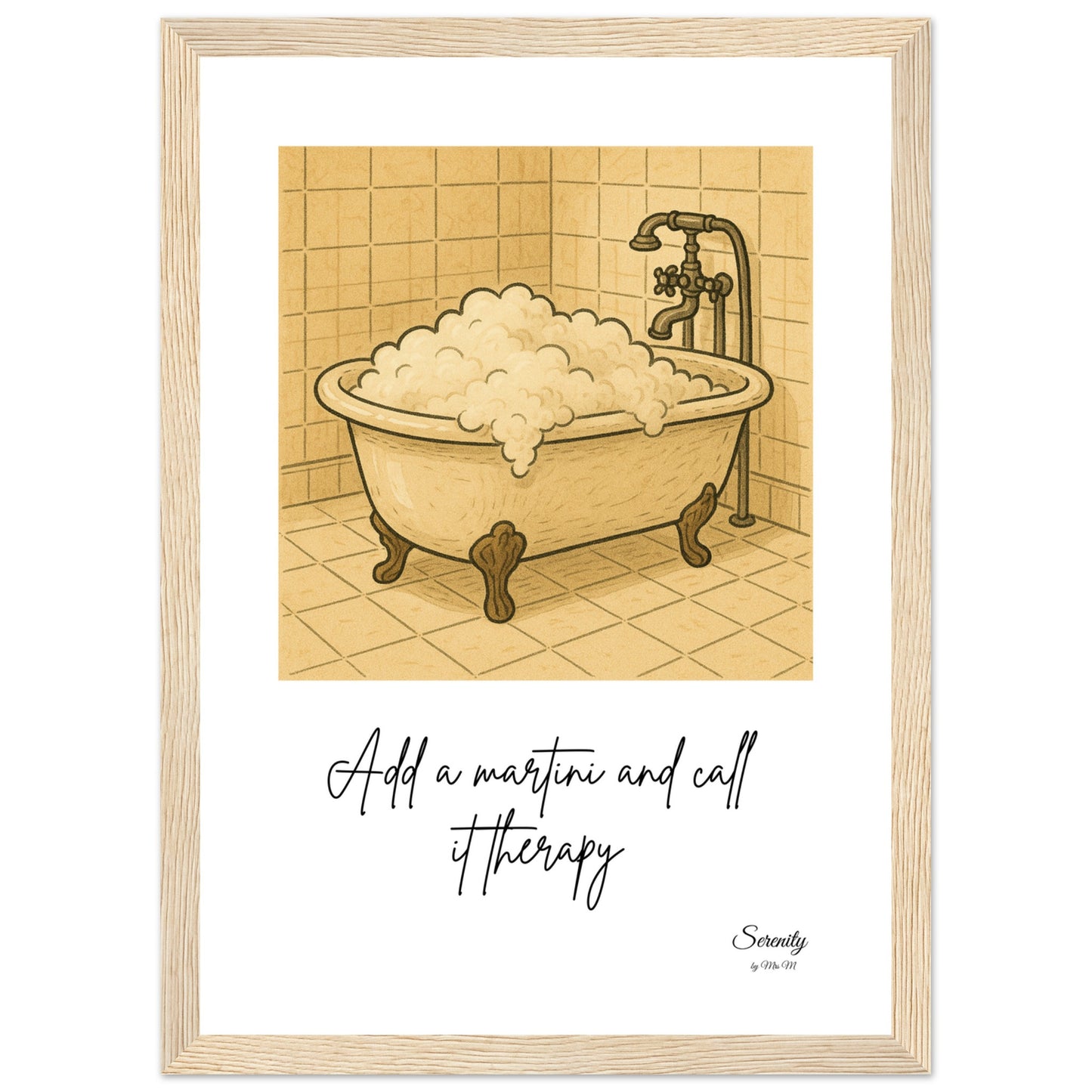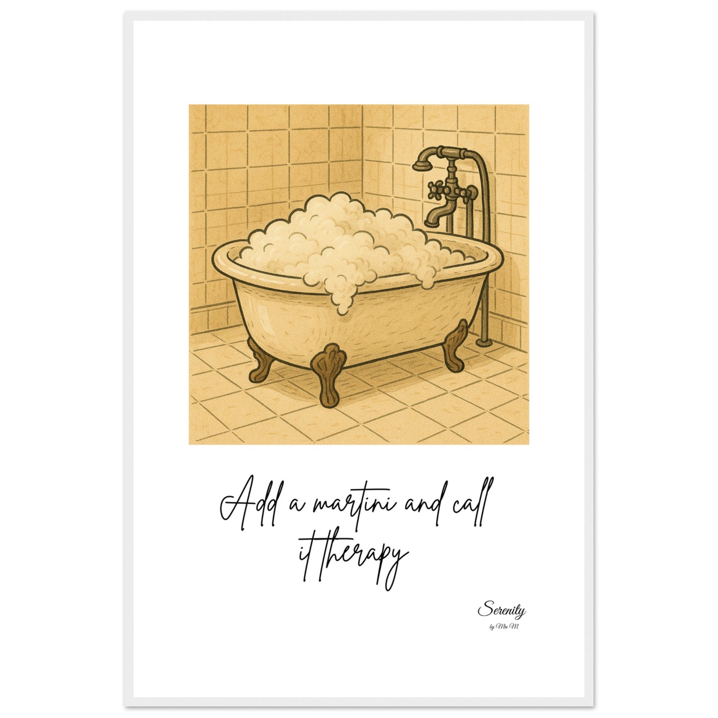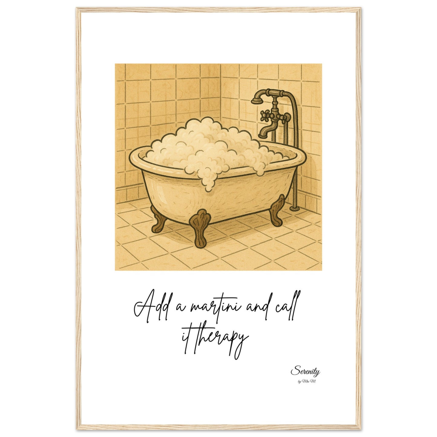 Embrace the art of self-care with our charming "Add a Martini and Call it Therapy" framed poster. This delightful piece captures the simple luxury of a bubble bath, rendered in a warm, inviting vintage style. It’s a gentle reminder to slow down, unwind, and find your moment of peace amidst life's hustle. Perfect for adding a touch of playful elegance to your bathroom, bedroom, or living space, this poster invites tranquility and a bit of witty charm into your home.