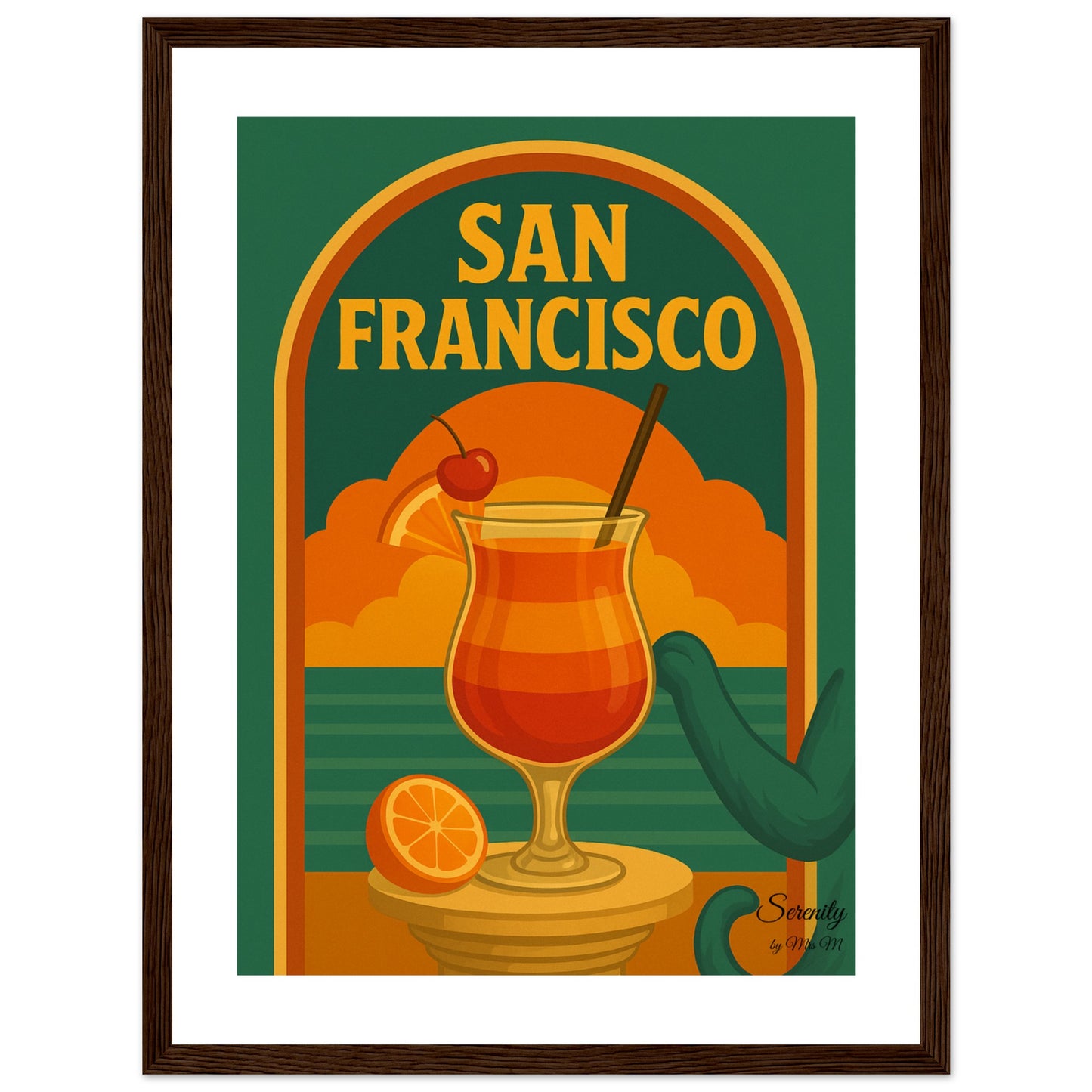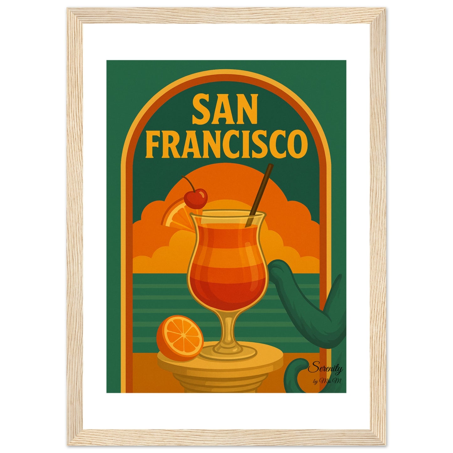 Bring a splash of vibrant, nostalgic San Francisco charm to your space with this stunning Art Deco-inspired framed poster. Evoking the warm glow of a California sunset over the city, complete with a refreshing cocktail, this piece is perfect for anyone who loves retro travel aesthetics, bold colors, and the iconic spirit of San Francisco.