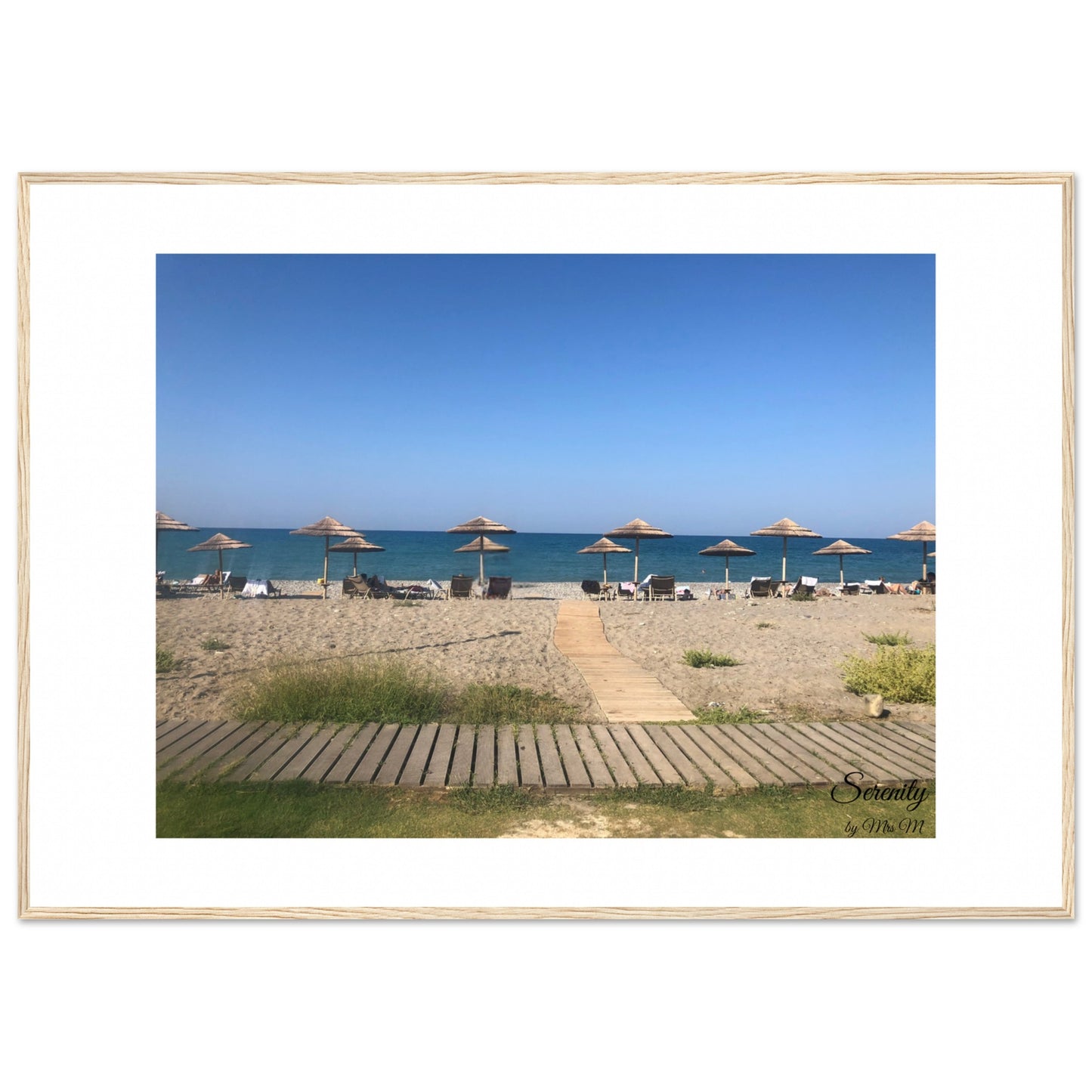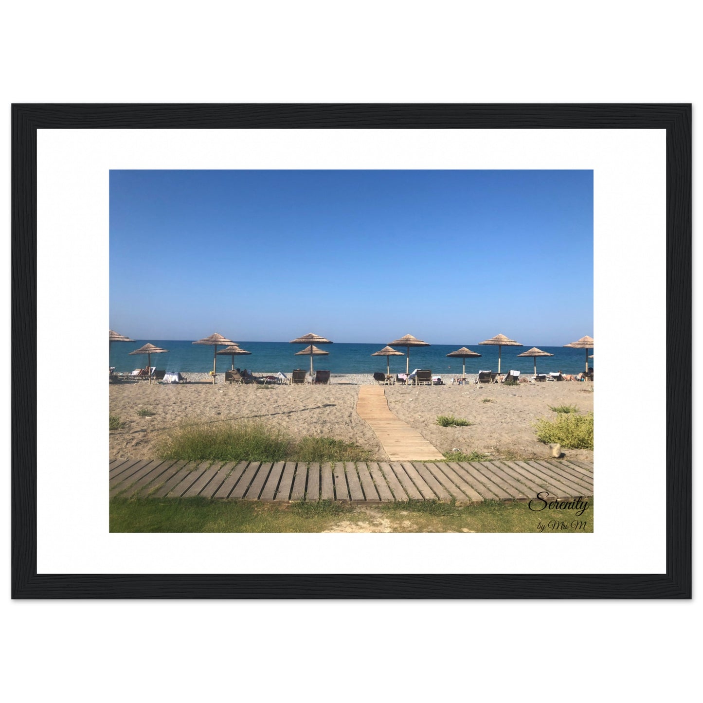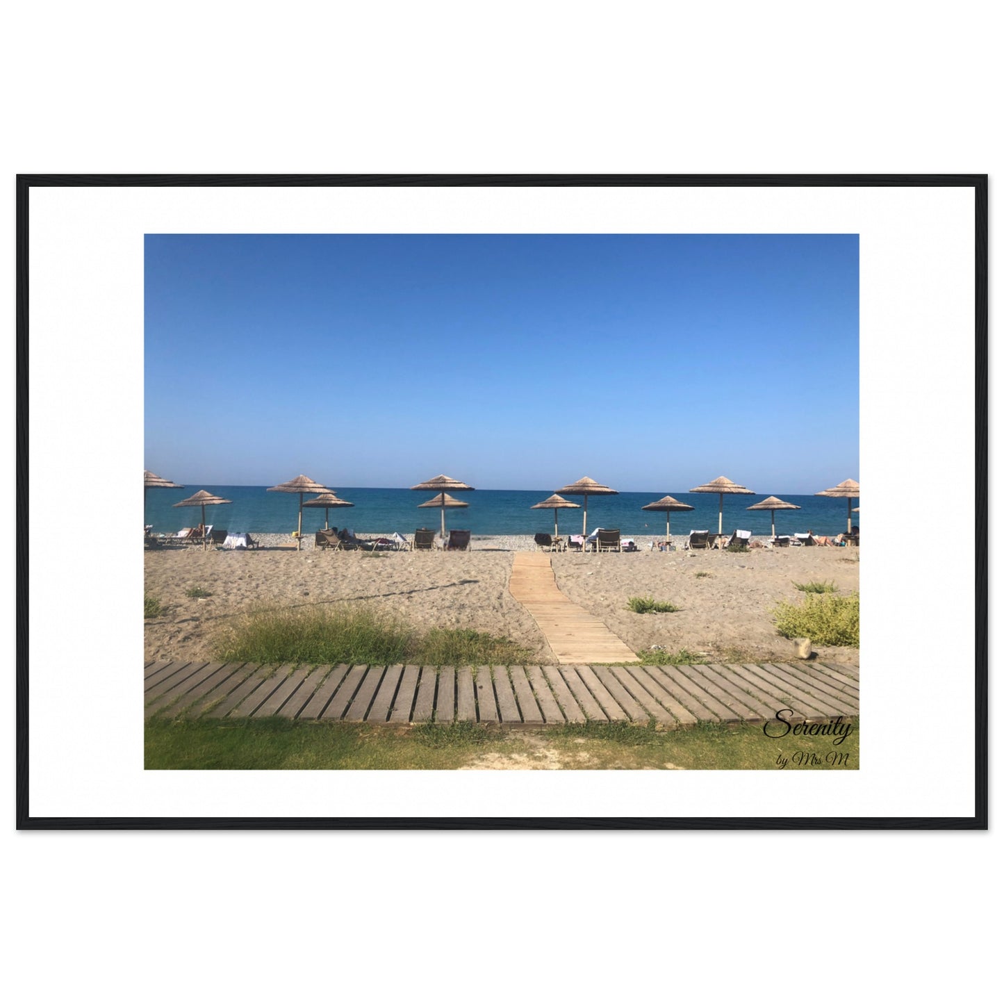 Bring the tranquil beauty of a sun-drenched beach right into your home with our serene framed poster. Capturing the soothing blue of the sky and ocean, dotted with charming straw umbrellas, this artwork offers an instant escape to a peaceful shore. Imagine unwinding as you gaze upon this tranquil scene, a perfect reminder of blissful summer days.