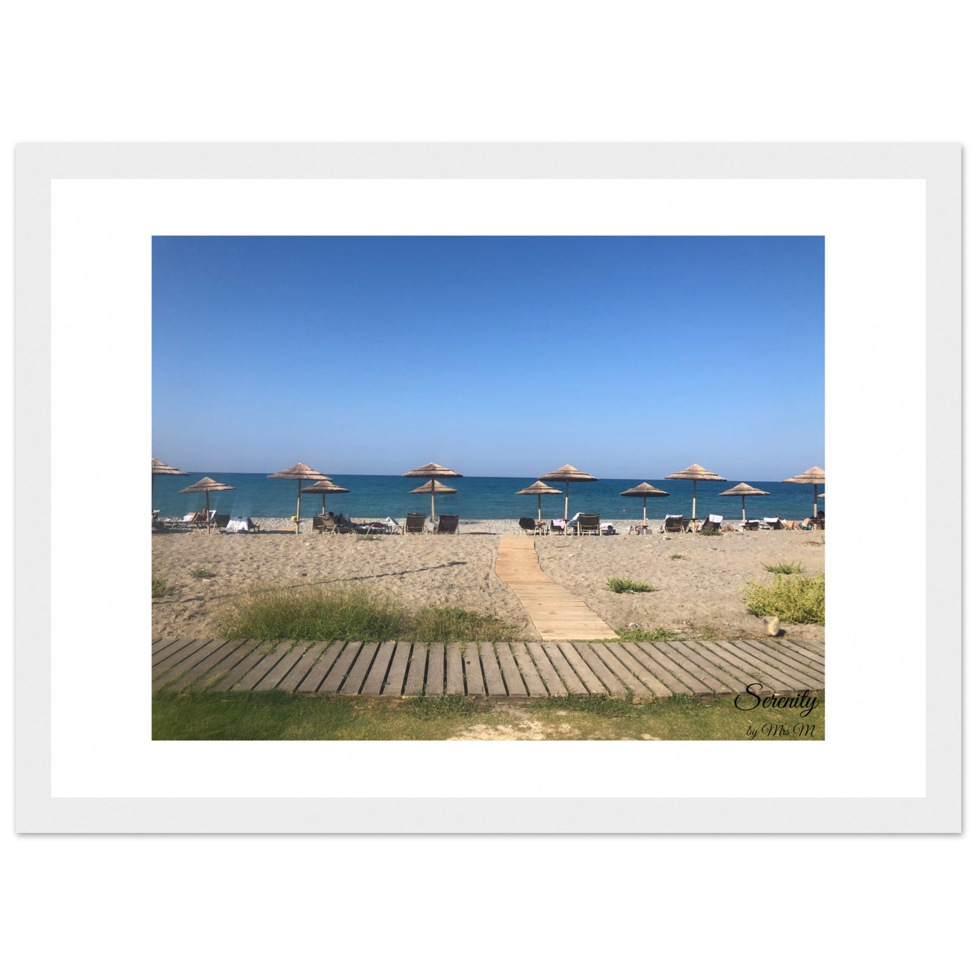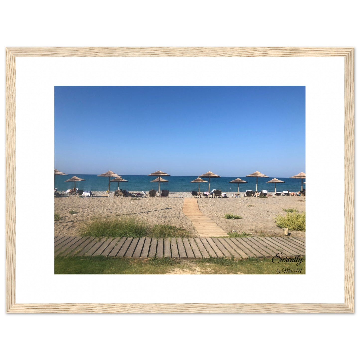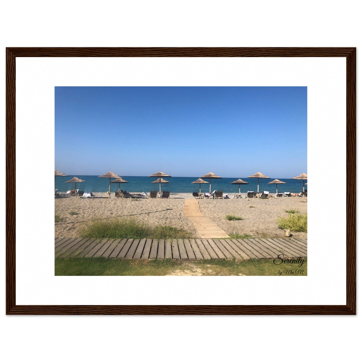 Bring the tranquil beauty of a sun-drenched beach right into your home with our serene framed poster. Capturing the soothing blue of the sky and ocean, dotted with charming straw umbrellas, this artwork offers an instant escape to a peaceful shore. Imagine unwinding as you gaze upon this tranquil scene, a perfect reminder of blissful summer days.