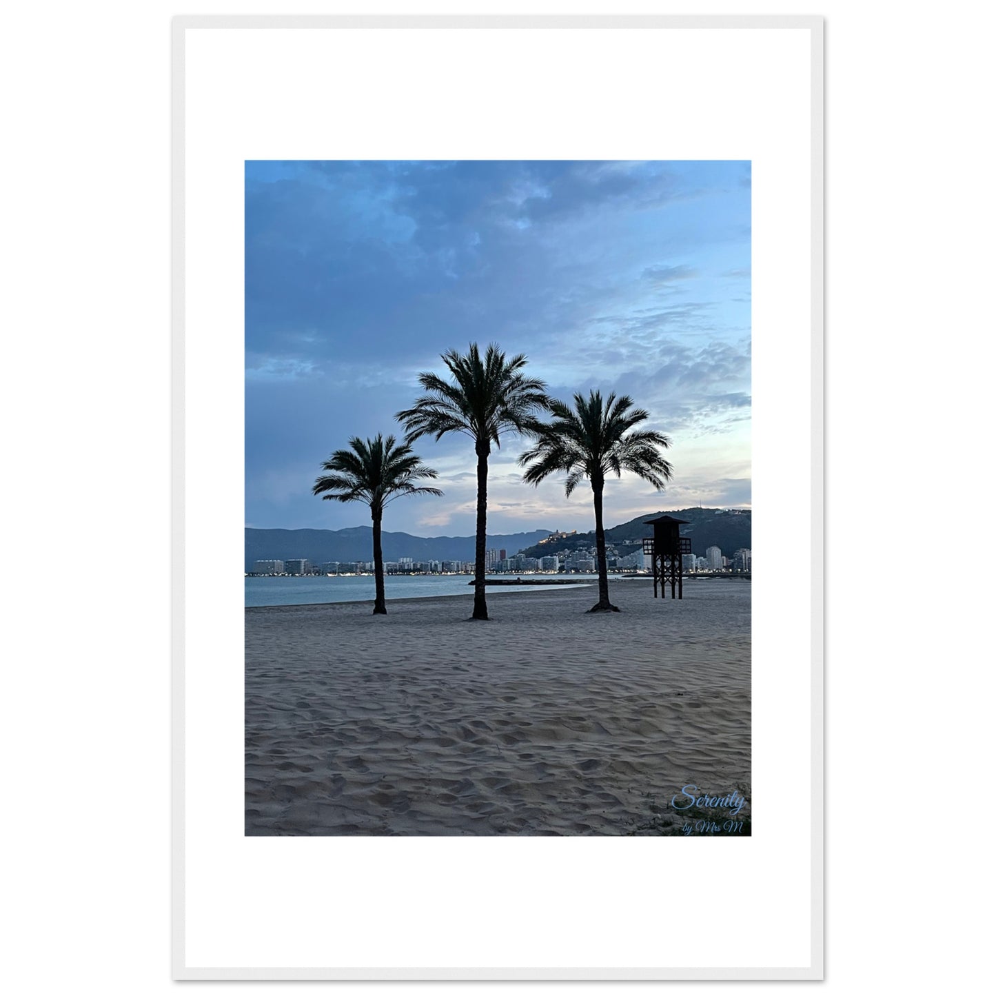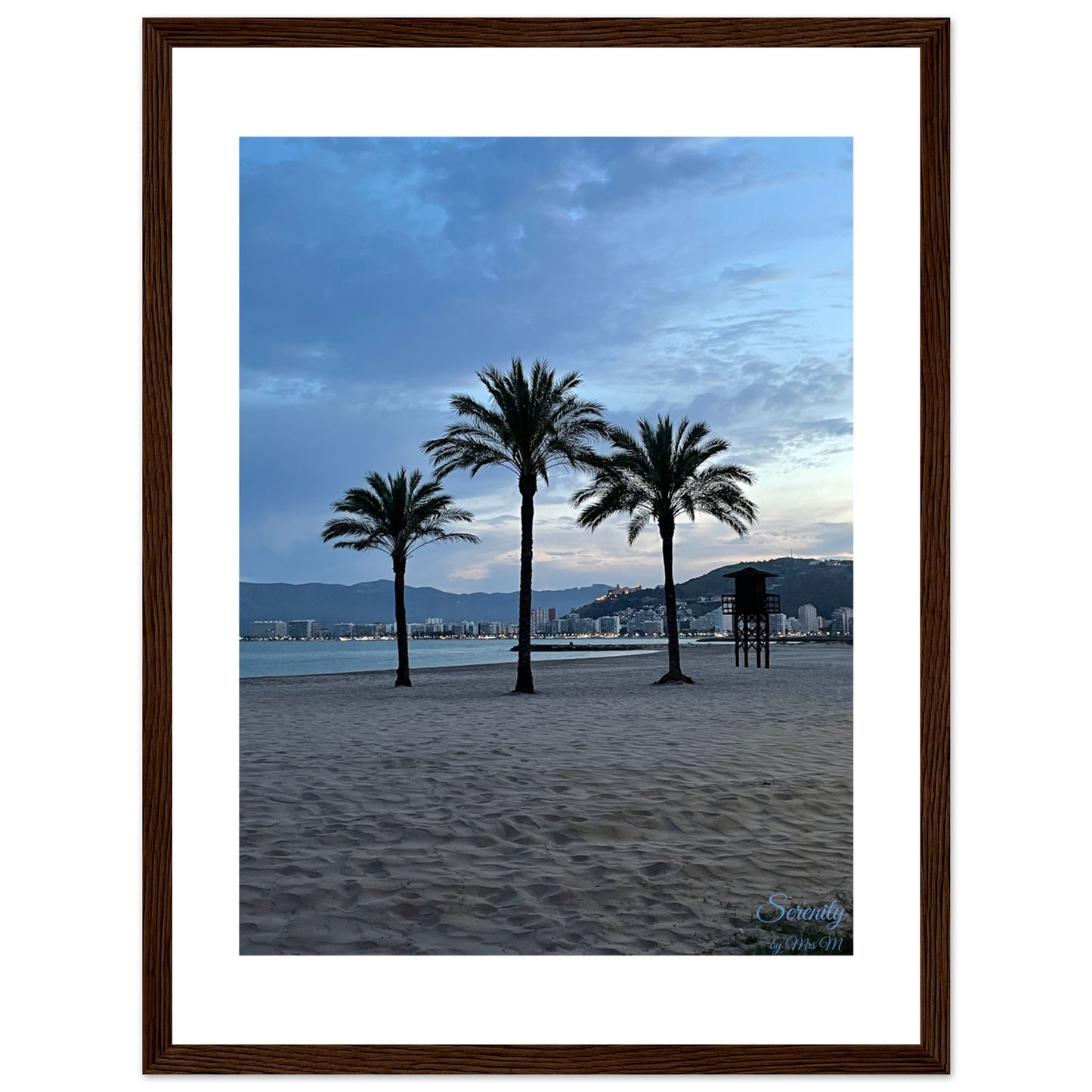 Capture the tranquil beauty of a twilight beach with our Serenity Shoreline Sunset framed poster. This stunning print evokes a sense of calm with its deep blue skies, silhouetted palm trees, and the gentle fade of daylight over the distant city lights. It’s the perfect piece to bring a peaceful, resort-like ambiance into any room, transforming your space into a serene escape.