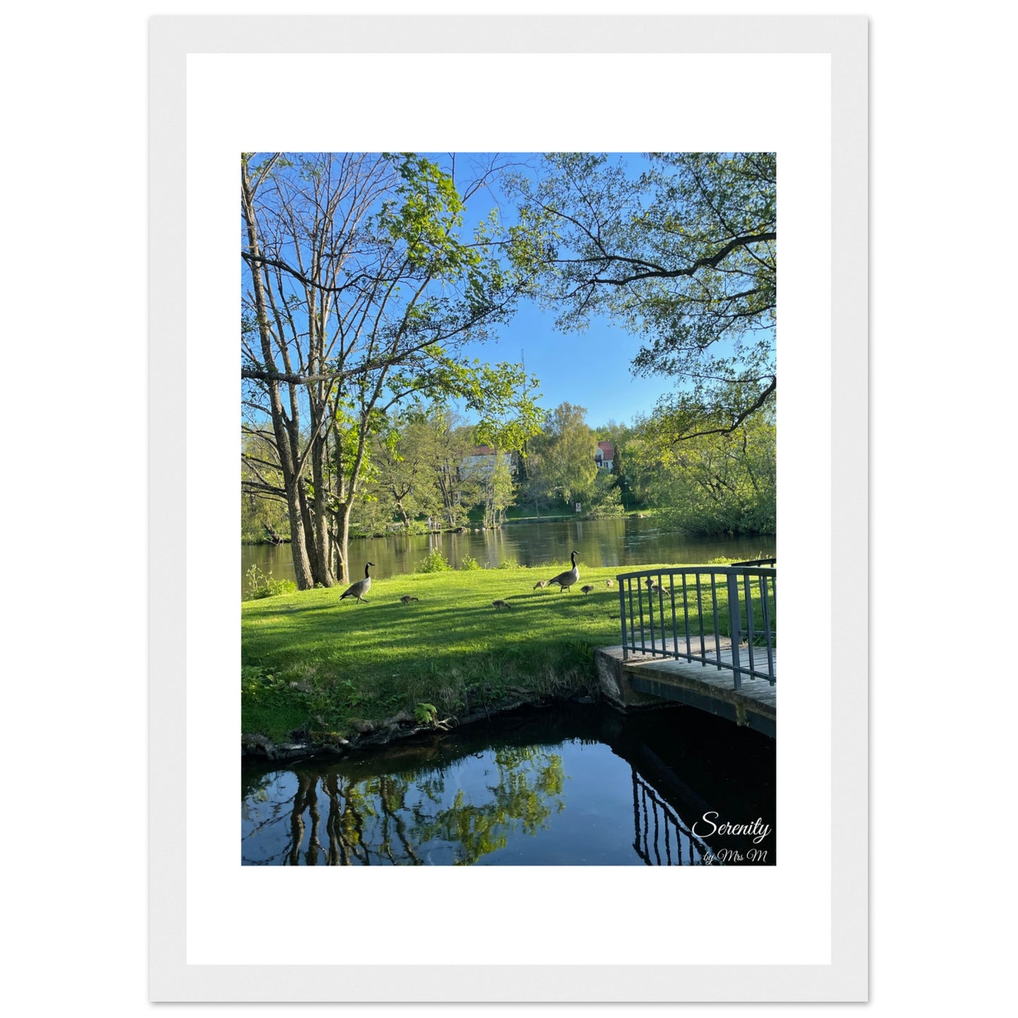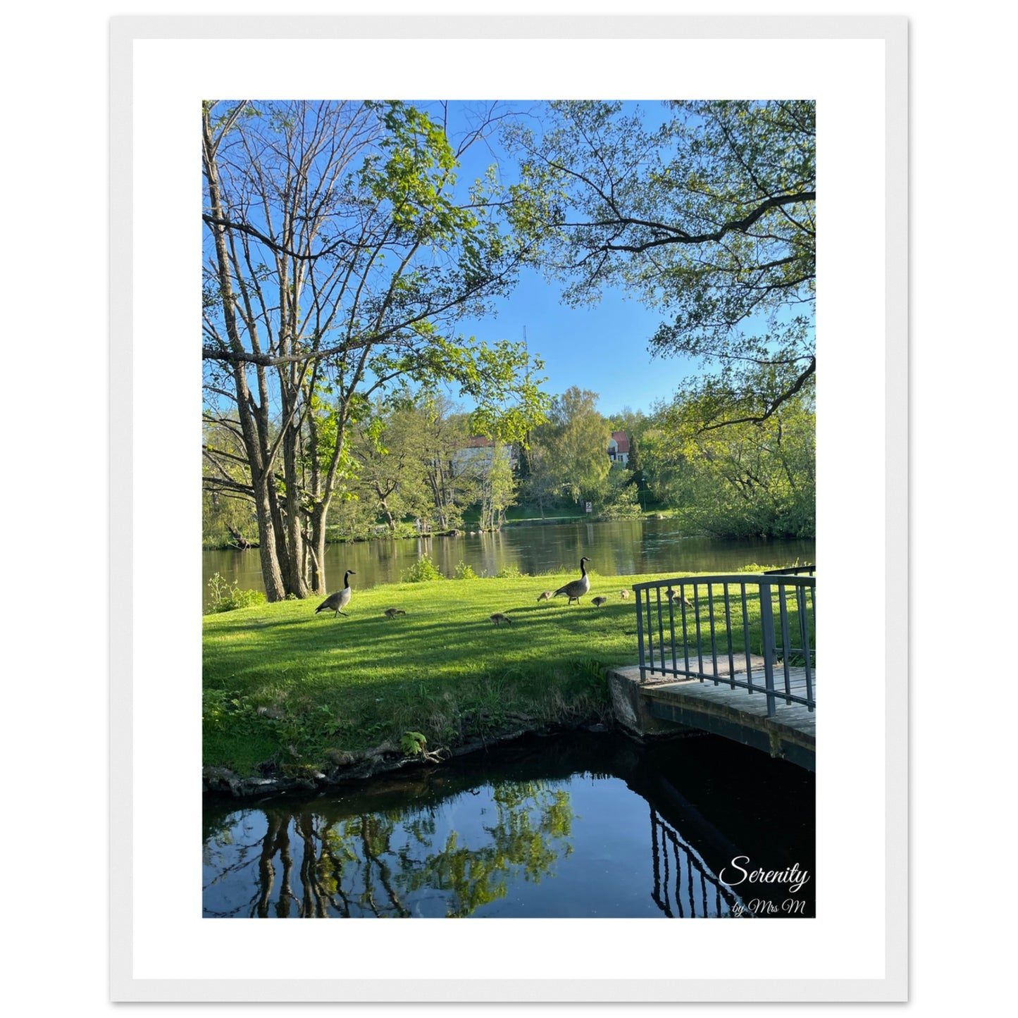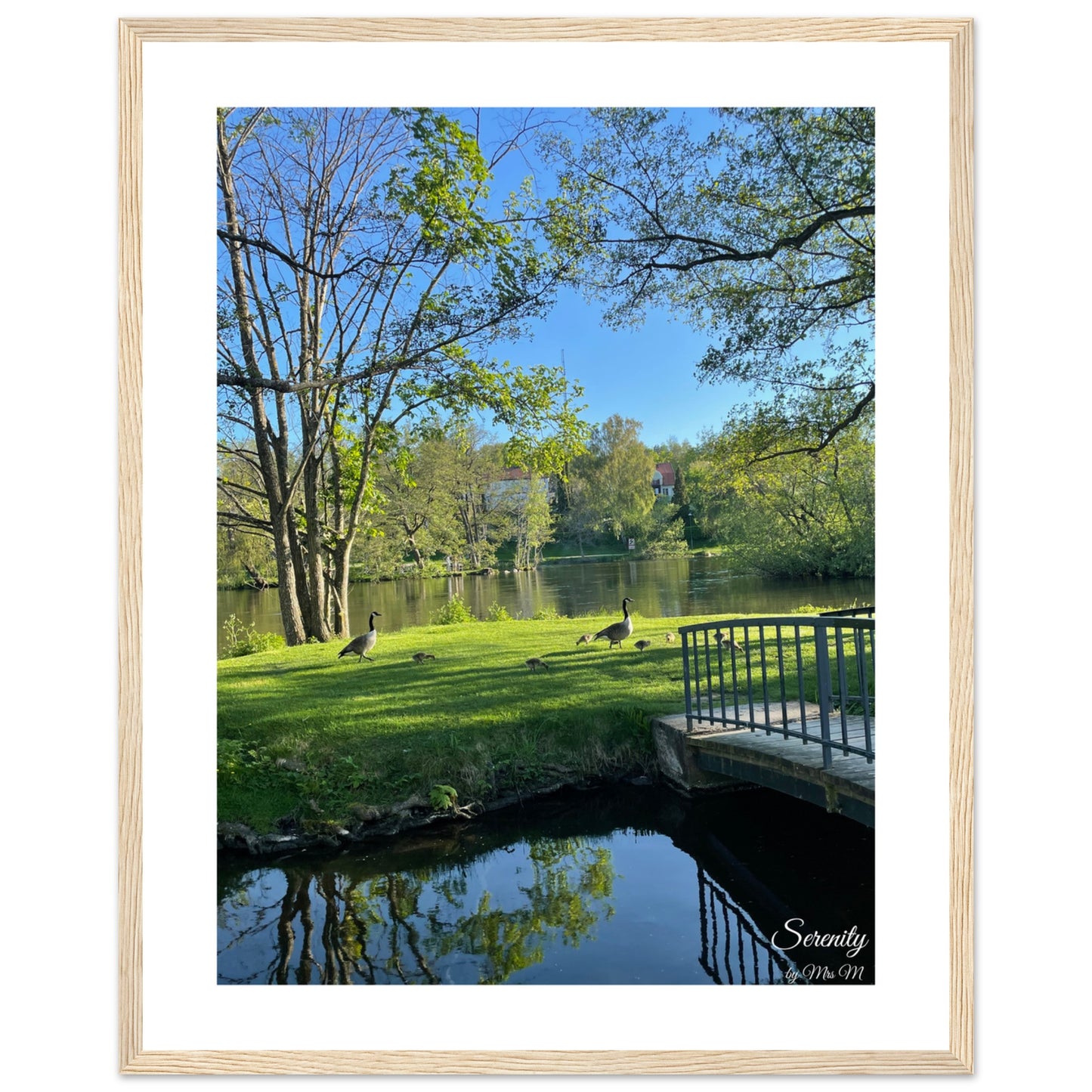 Escape into a moment of pure tranquility with our "Serenity" framed poster, capturing the idyllic scene of geese and their adorable goslings by a shimmering lakeside. The vibrant greens of spring foliage and the calming blue of the sky and water invite a sense of peace and natural beauty into any room. This captivating artwork is perfect for those who appreciate the quiet charm of wildlife and serene landscapes.