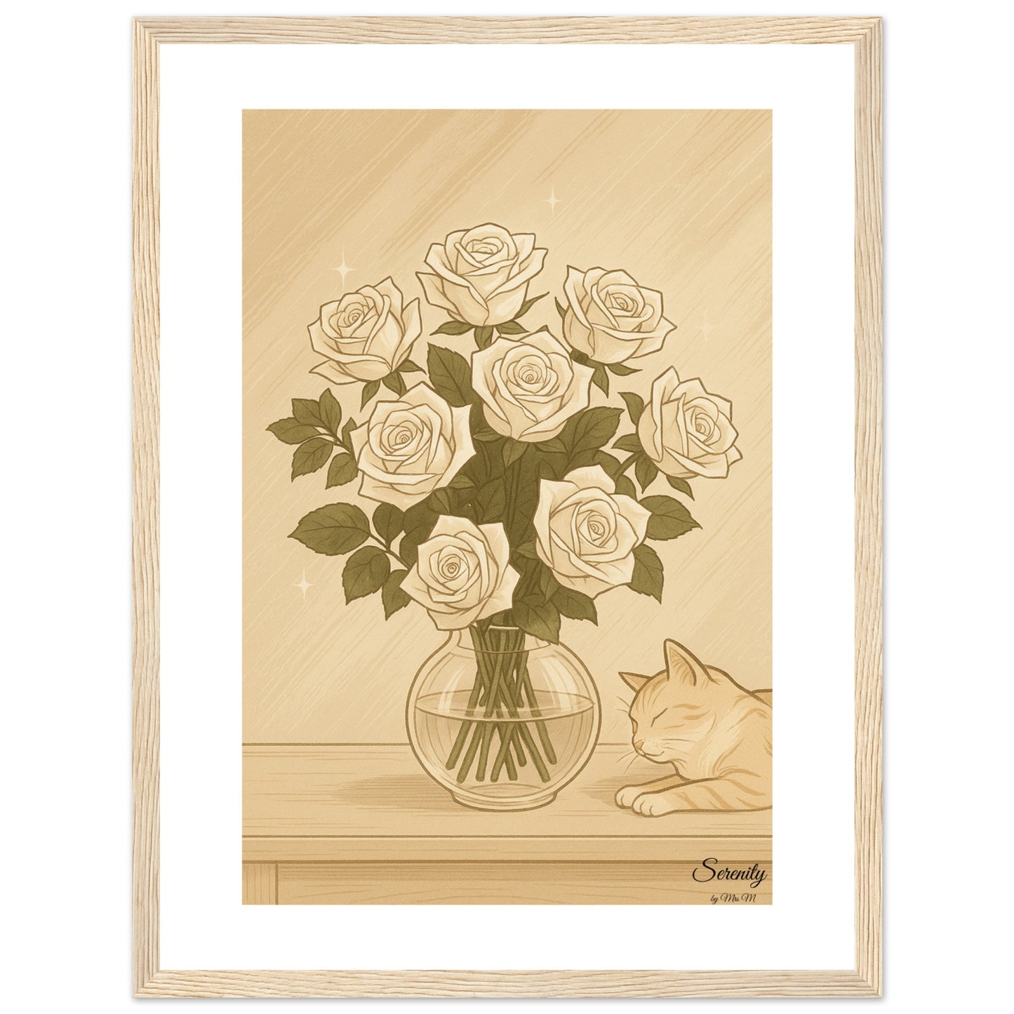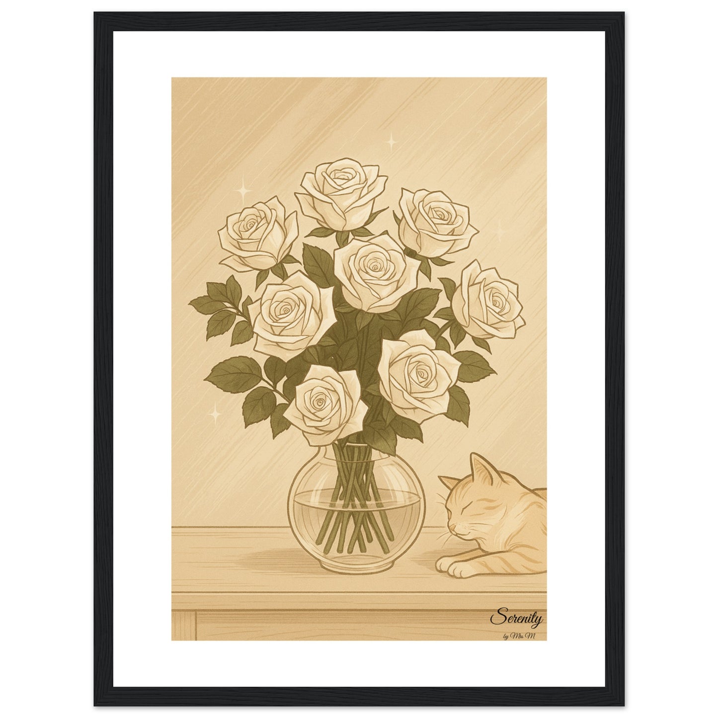 Bring a touch of calm and cozy elegance into your home with our "Serene Roses & Cat Art" framed poster. This charming illustration, featuring a peaceful cat nestled beside a beautiful bouquet of roses, evokes a feeling of gentle tranquility and warmth. The soft, sepia-toned palette creates a timeless aesthetic, perfect for adding a subtle, soothing accent to any room.