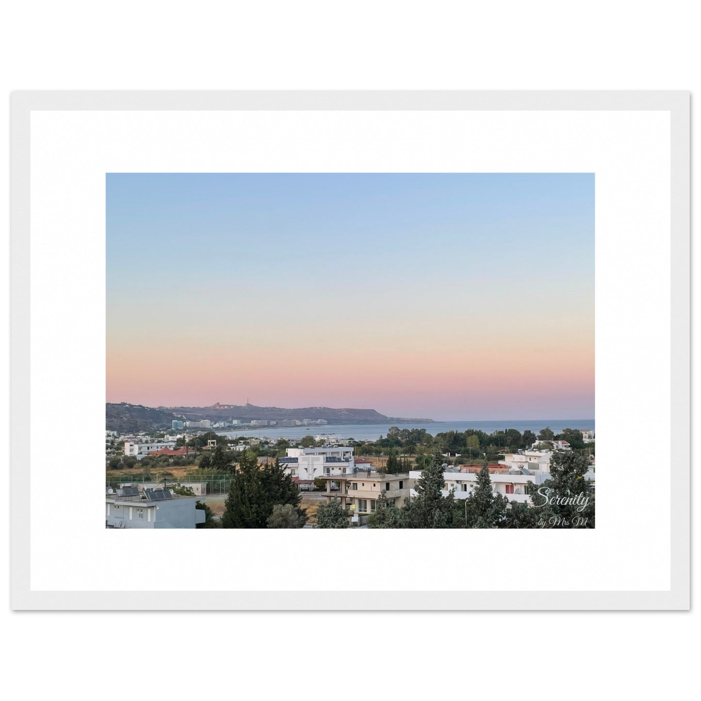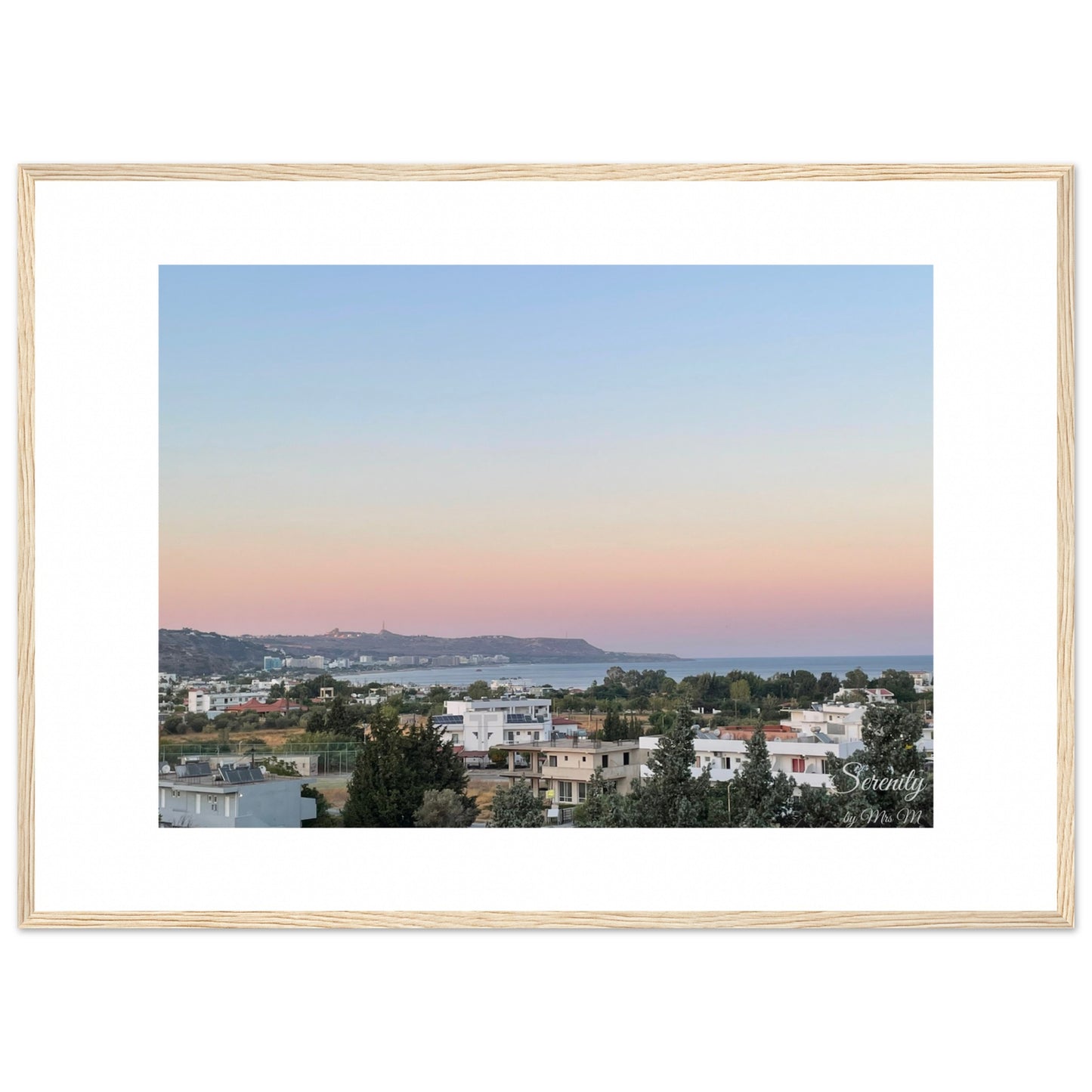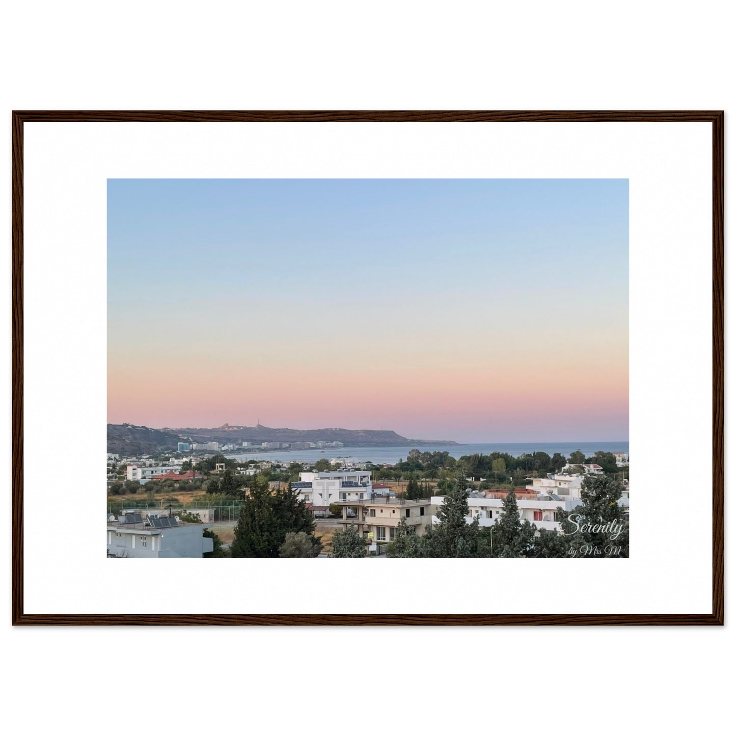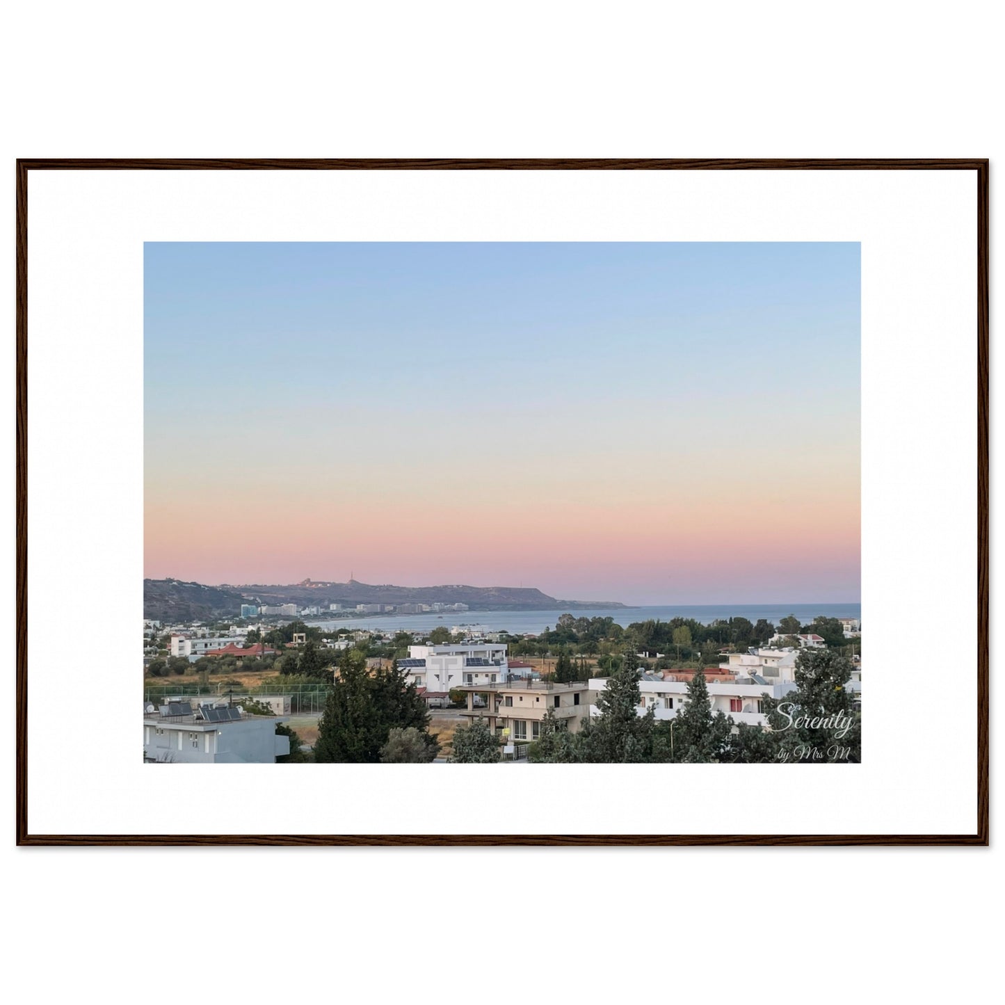 Bring the tranquil beauty of a coastal sunset into your home with this stunning framed poster. Capturing the soft, ethereal glow of dusk over a serene cityscape by the sea, this piece evokes a sense of peace and calm, making it the perfect addition to any space in need of a touch of natural elegance.
