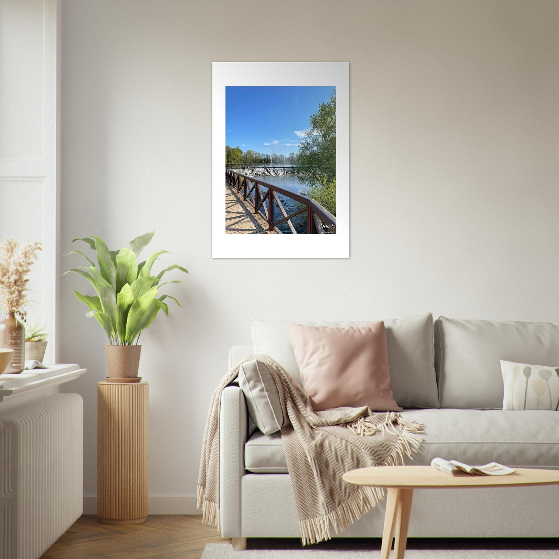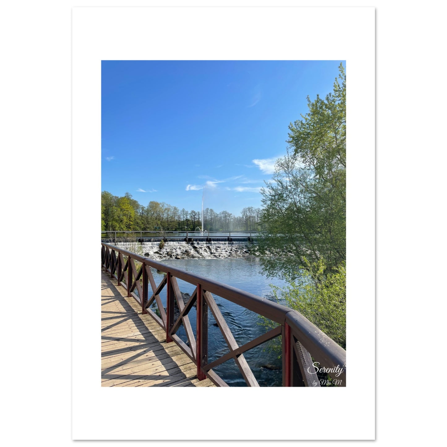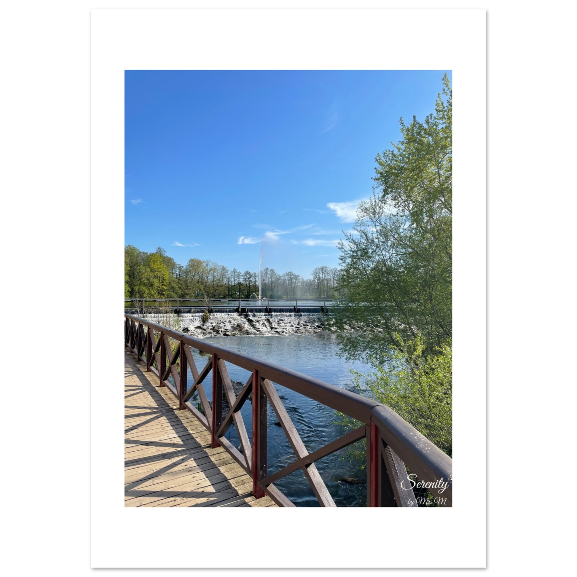 Bring the peaceful tranquility of a sunlit waterside path into your living space with this captivating poster. Featuring a charming wooden bridge overlooking a gentle cascade and serene water, framed by lush greenery and a brilliant blue sky, this artwork evokes a sense of calm and natural beauty. It's the perfect piece to create a serene ambiance in any room, inviting moments of quiet reflection and appreciation for nature's simple wonders.