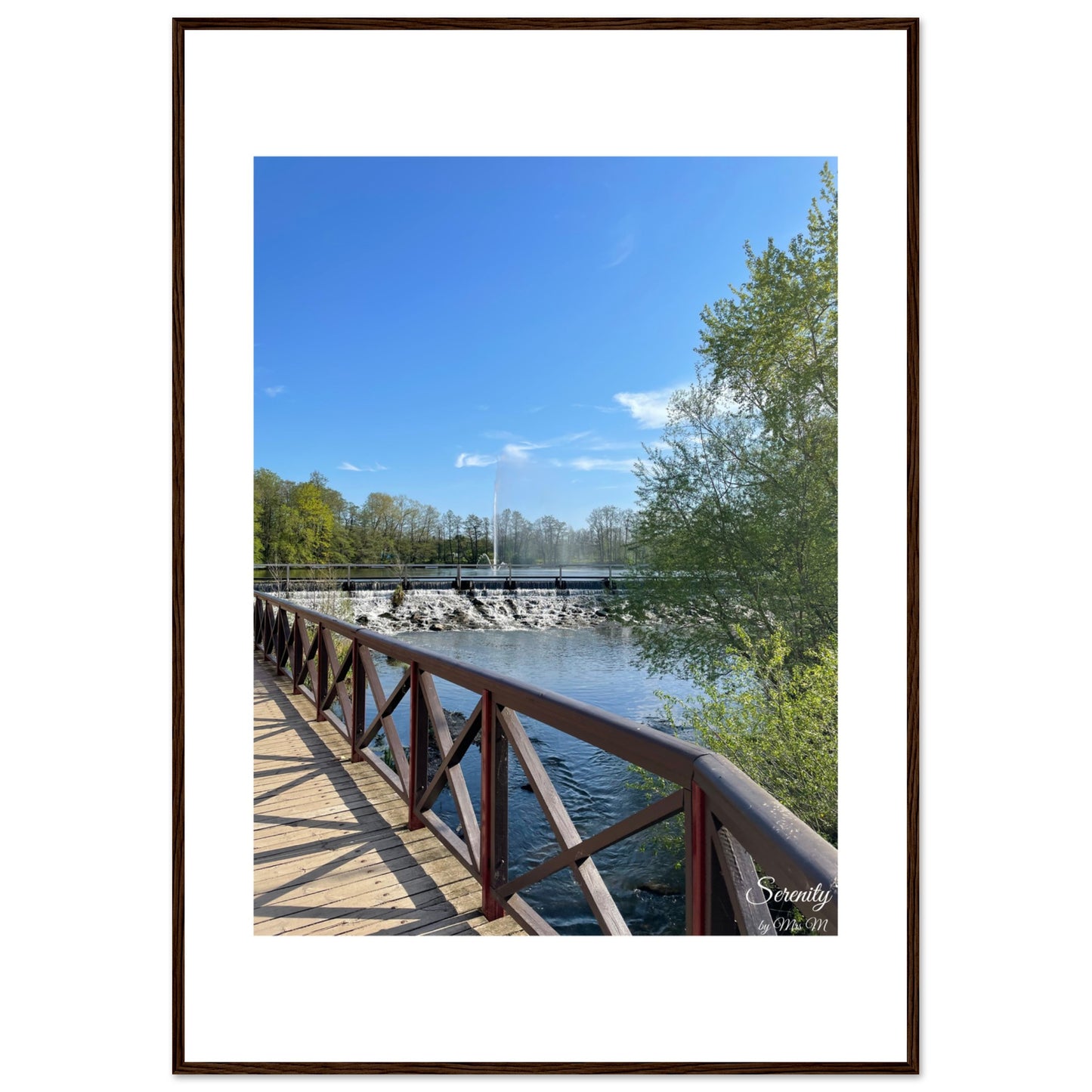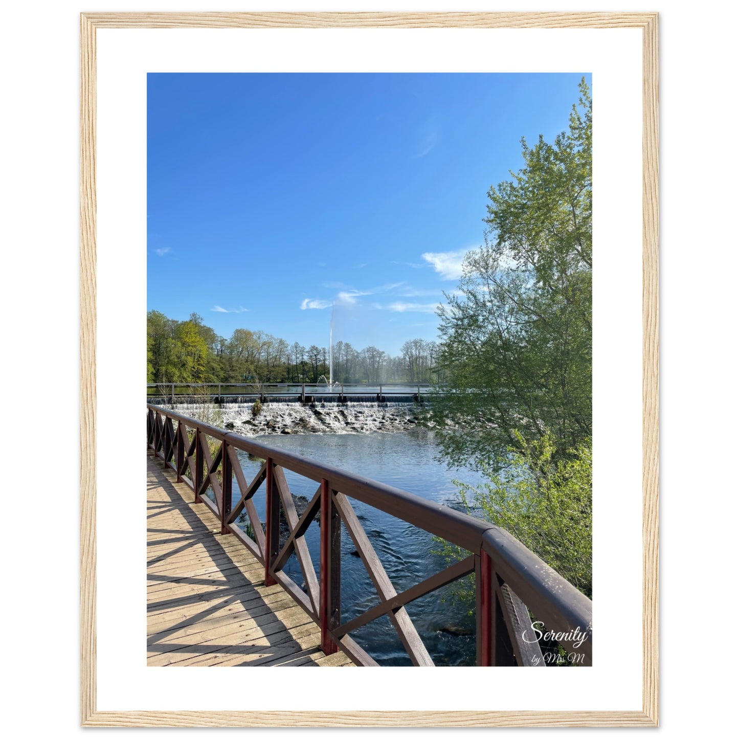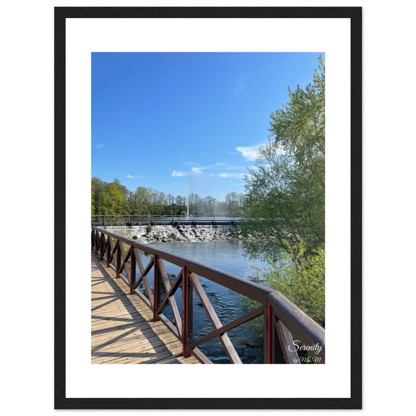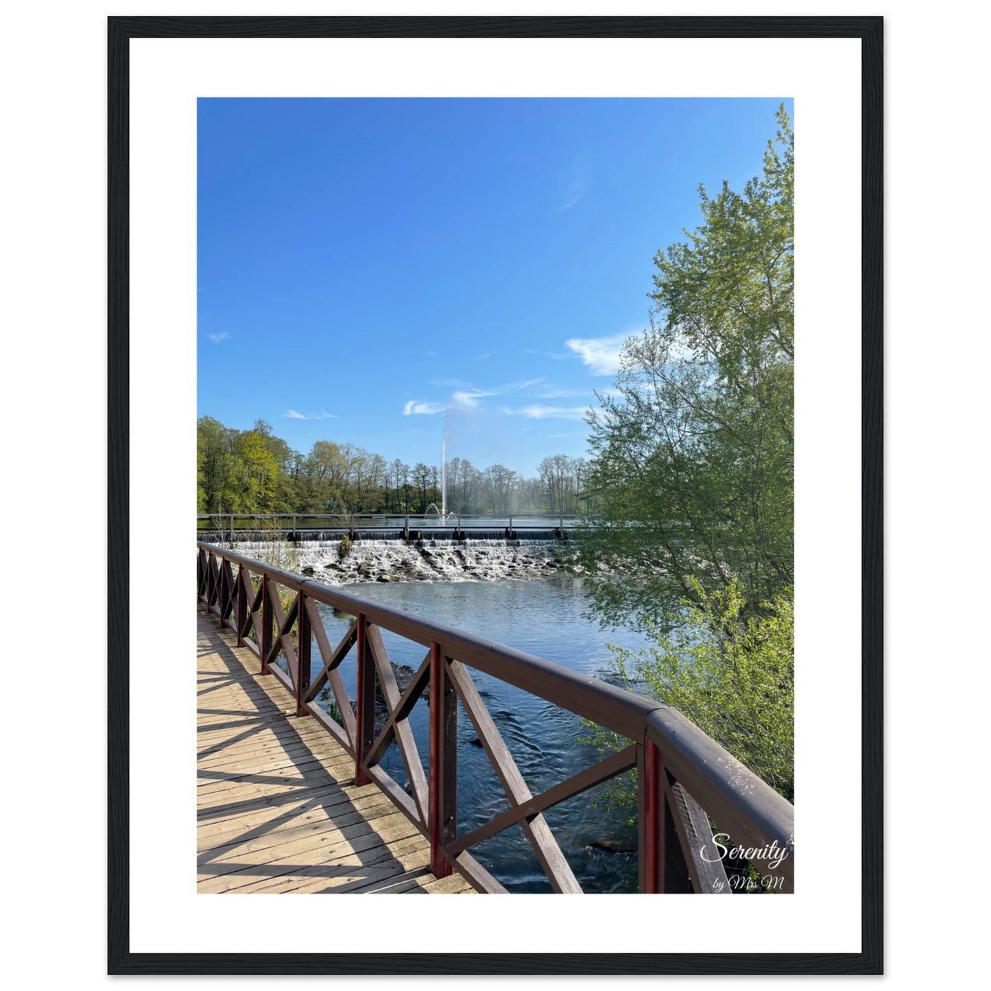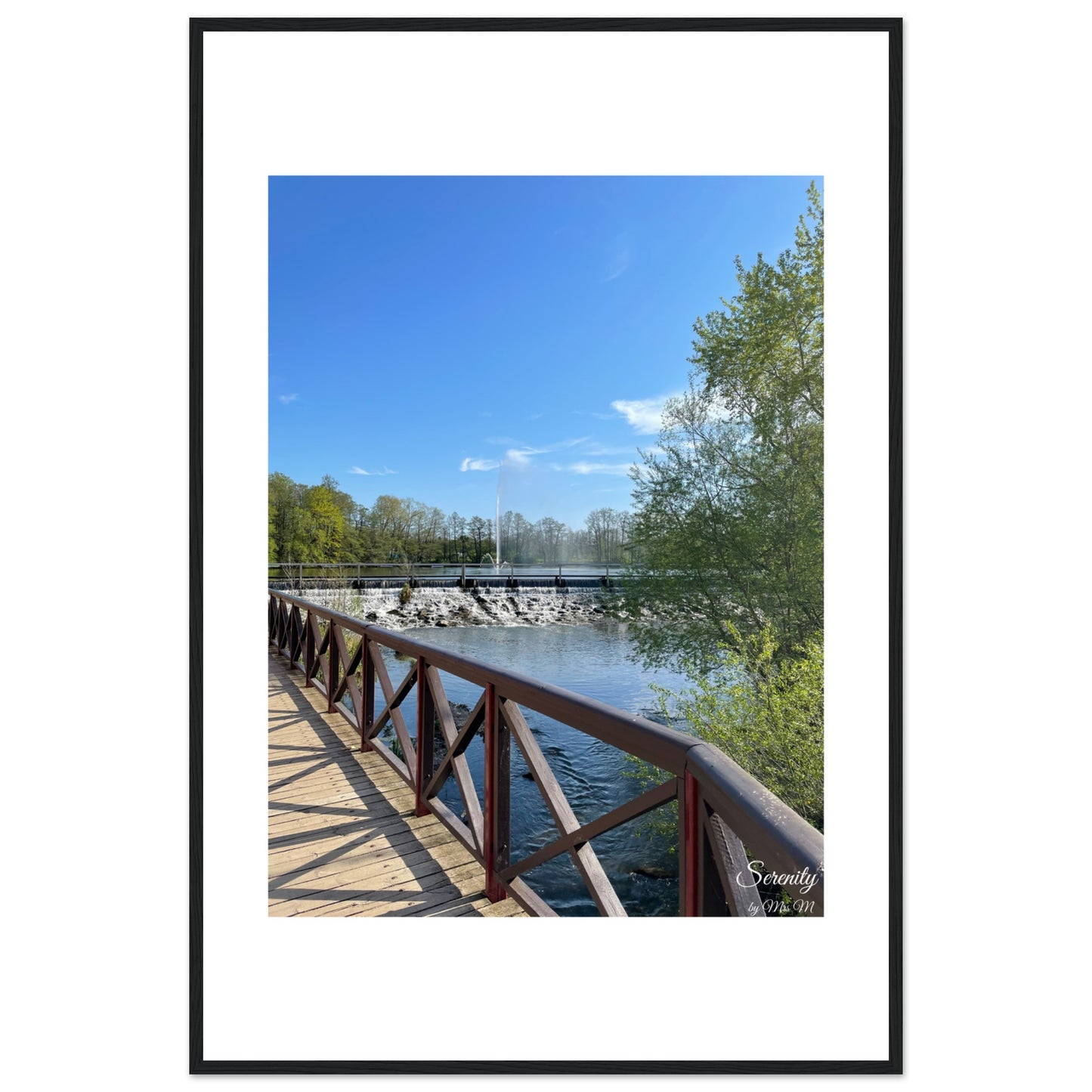 Bring the calm of a sunlit stroll by the water into your home with our serene framed poster. This piece captures the tranquil beauty of a clear blue sky, vibrant green foliage, and the gentle cascade of water over a dam, inviting a moment of peace and reflection into any room.