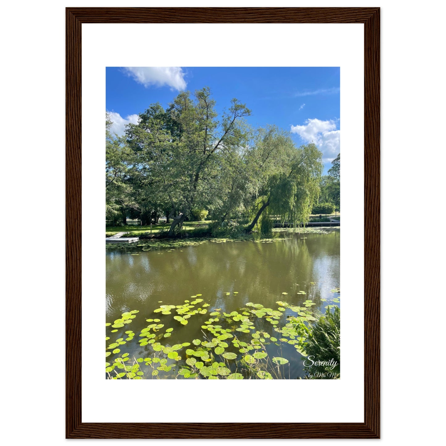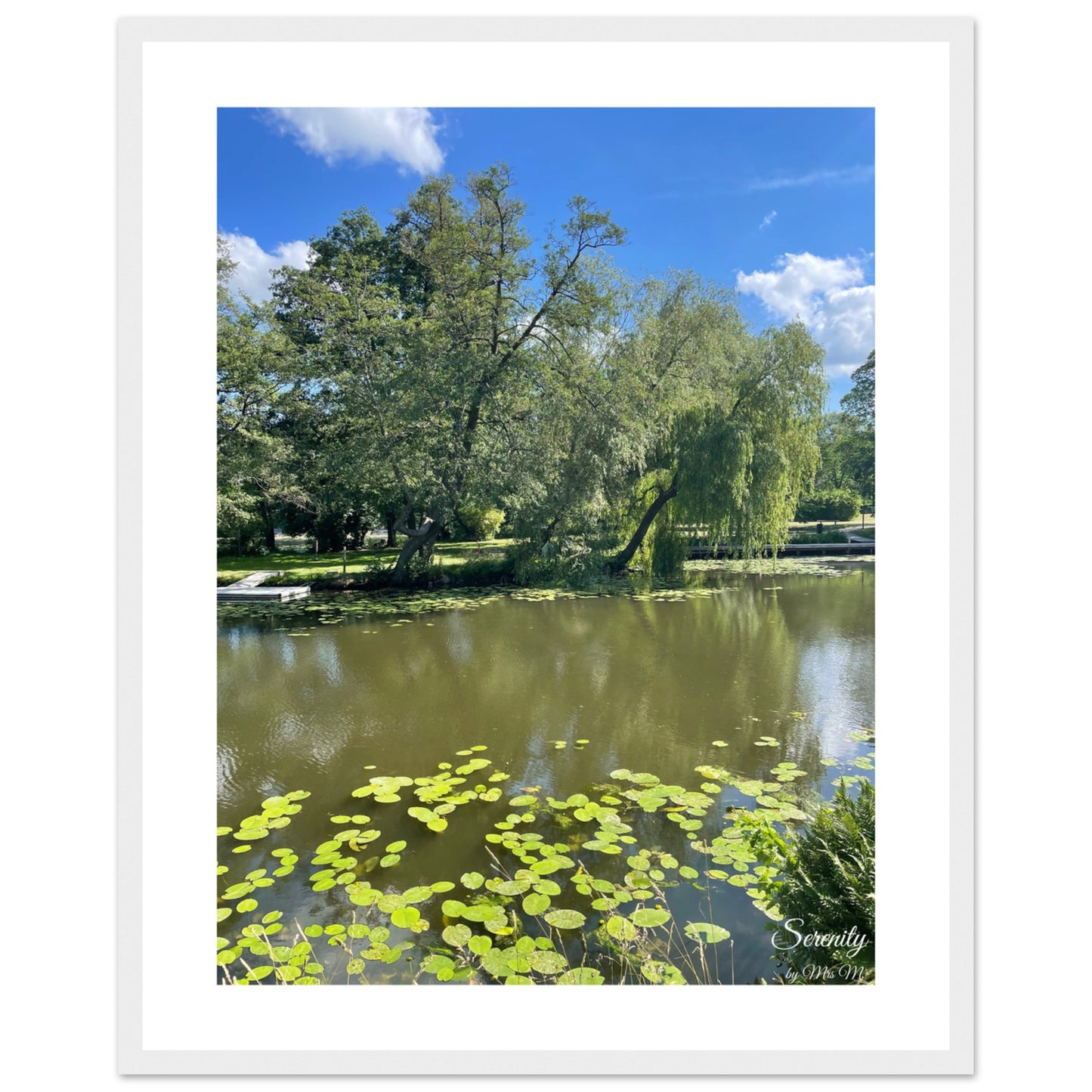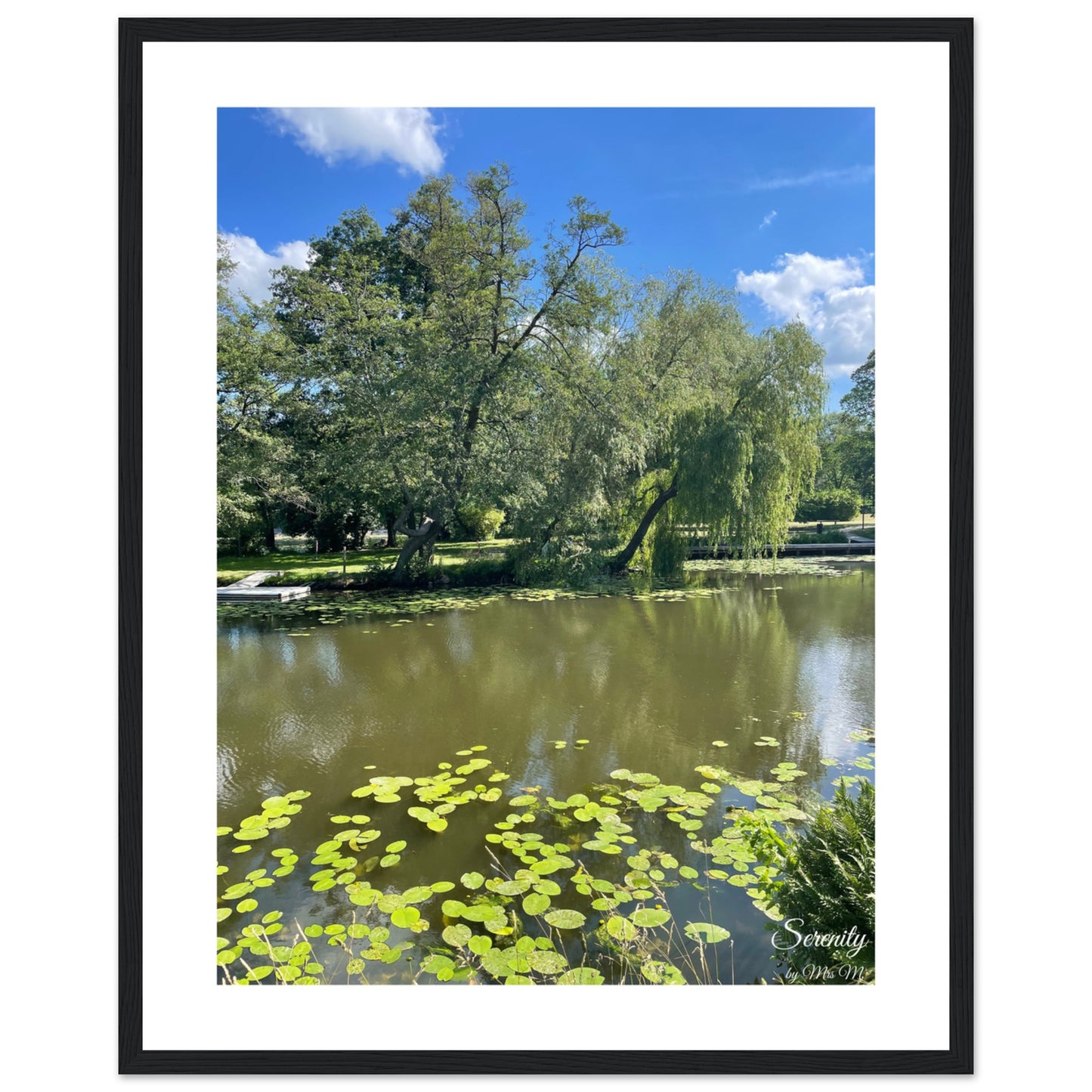 Bring the tranquil beauty of a sun-drenched lakeside into your home with our "Serene Waterside Weeping Willow" framed poster. This captivating piece, showcasing lush green trees, a placid pond dotted with lily pads, and a clear blue sky, evokes a feeling of peace and natural elegance. It's the perfect accent to create a calming oasis in any room, reflecting the gentle sway of nature's artistry.