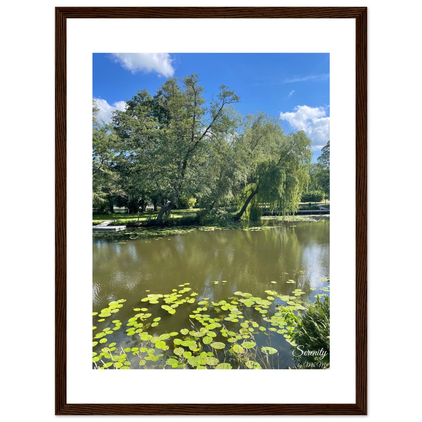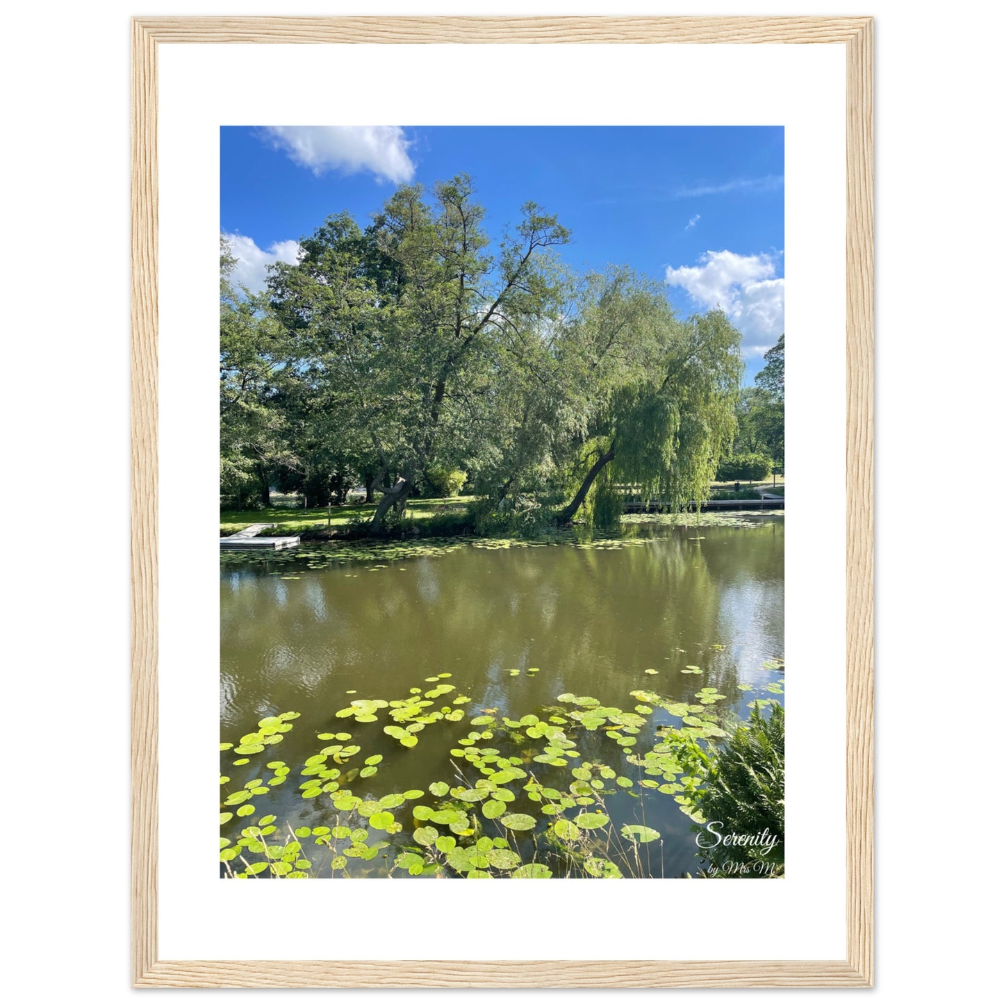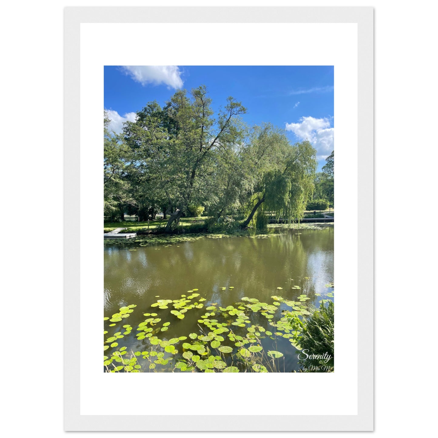 Bring the tranquil beauty of a sun-drenched lakeside into your home with our "Serene Waterside Weeping Willow" framed poster. This captivating piece, showcasing lush green trees, a placid pond dotted with lily pads, and a clear blue sky, evokes a feeling of peace and natural elegance. It's the perfect accent to create a calming oasis in any room, reflecting the gentle sway of nature's artistry.