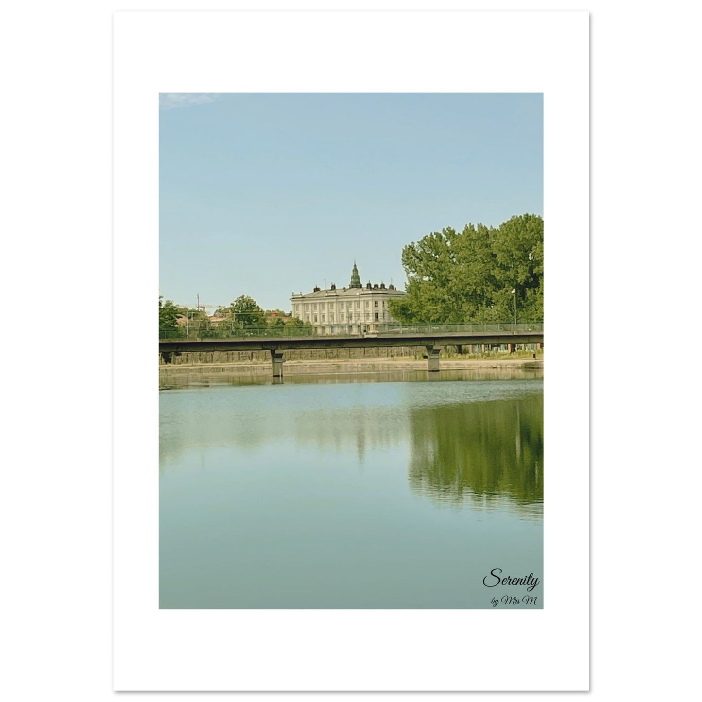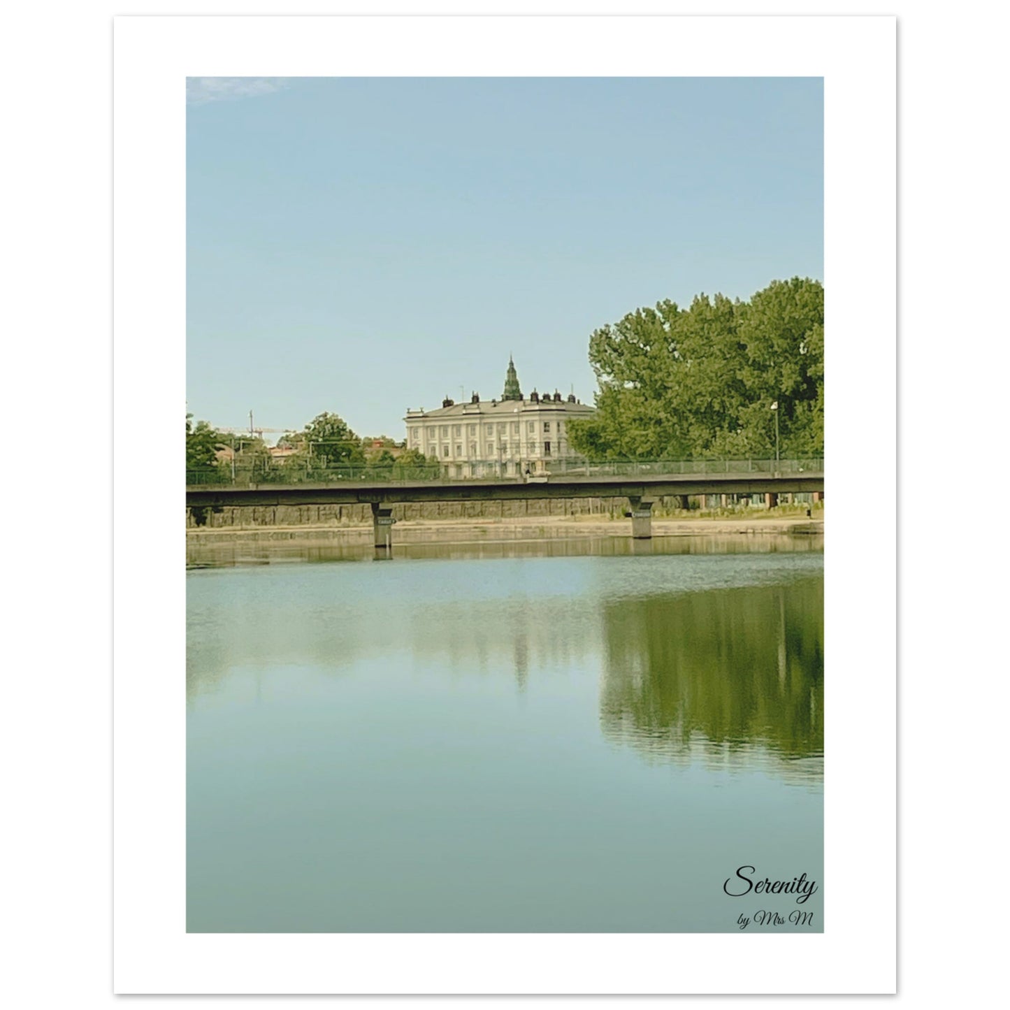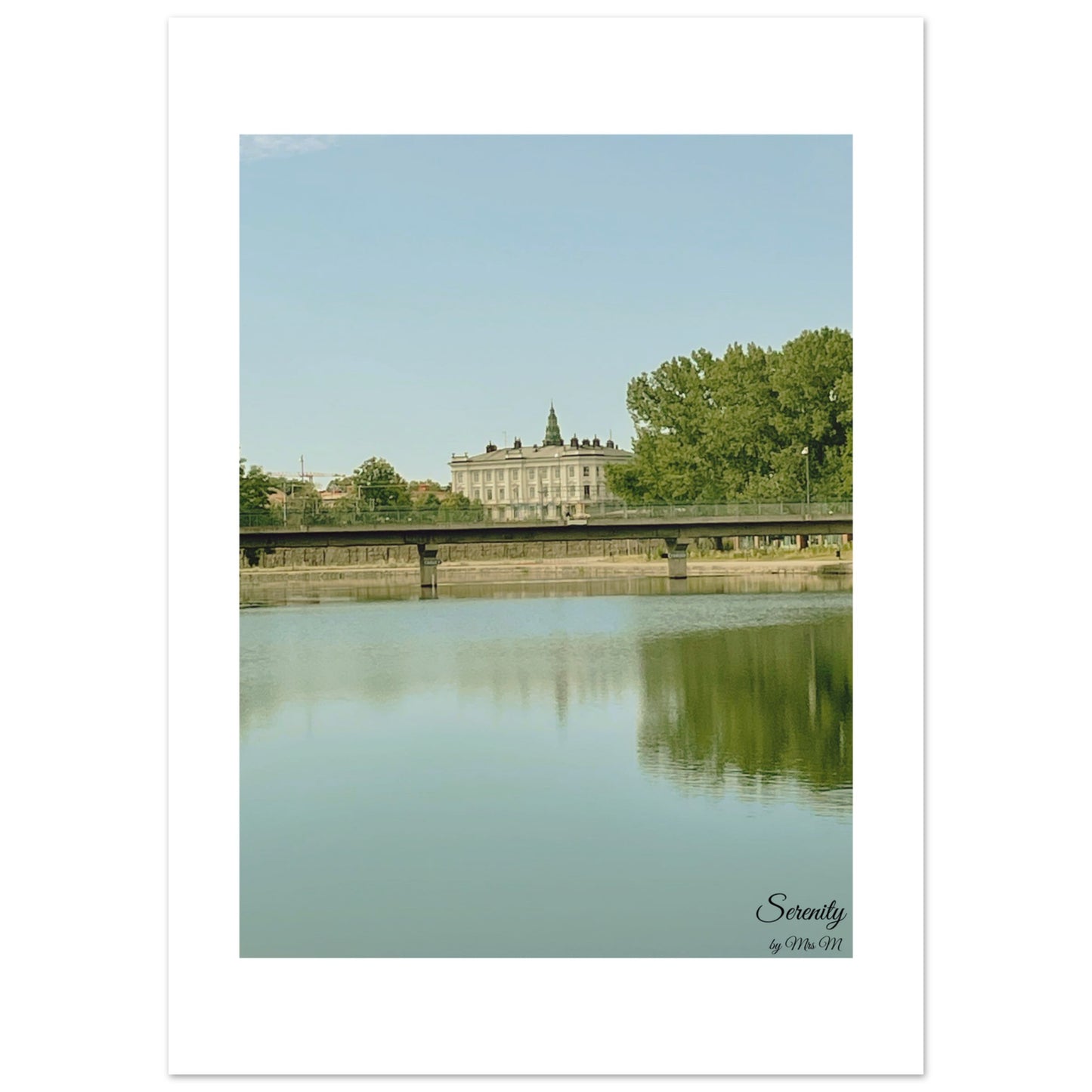 Immerse yourself in the calming essence of 'Serenity by Mrs. M,' a captivating poster that brings the peaceful charm of a European riverside cityscape right into your home. With its serene blue skies, lush green trees, and the elegant reflection of grand architecture on tranquil waters, this print evokes a sense of calm and classic beauty. It's the perfect accent to create a soothing atmosphere in any room, offering a daily escape to a picturesque, sun-drenched scene.